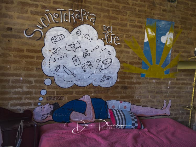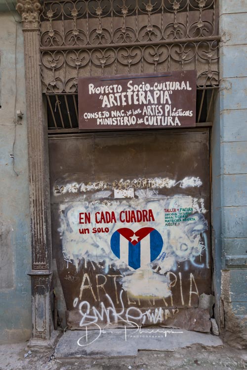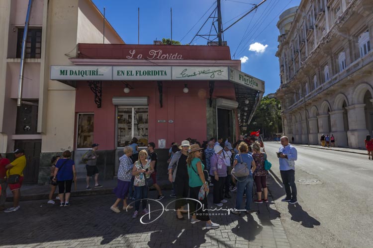 We take the painting that the artist conveniently rolls up and puts into a tube for us and we walk back to our Casa to put it in our luggage so as not to have to carry it around. Interesting graffiti on walls and doors abound here. Parking lots of old classic cars where, for about $30/hour, you can get a tour of Havana. We did that yesterday. We pass by ‘La Florida’ again and true to the info on our tour yesterday, this place is hopping and it isn’t even noon!