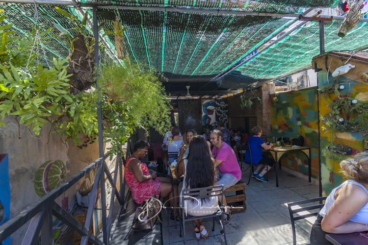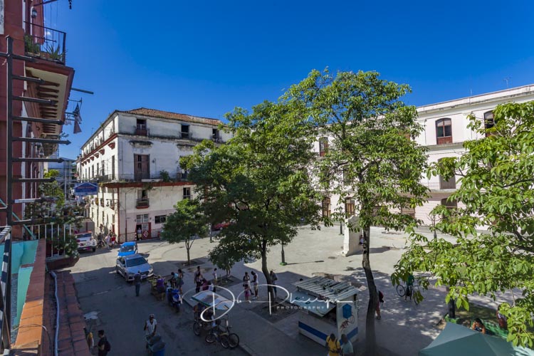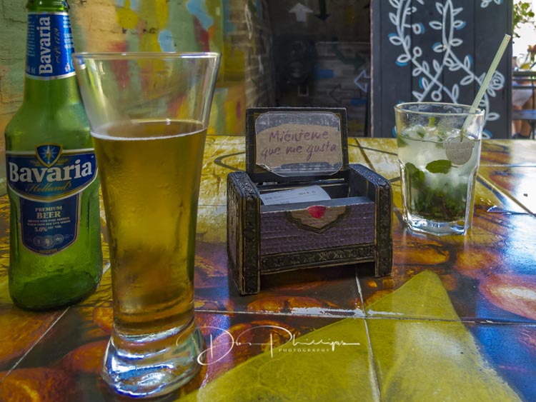 Okay, painting put away safely. on to walking in a new direction and new, or is that old, sights to see. A street vendor’s cart full of produce, this is how it’s done in Cuba! A very old church and a park and we come across El Chanchullero where we’re told we can get the best and cheapest cocktails in Old Havana! So we go in, being lunchtime, and go upstairs for a view, lunch and cocktails and beer. We only had to wait for 5 minutes to get a table, but when we came out an hour later, there was an hour long line to get in! I guess timing is everything!