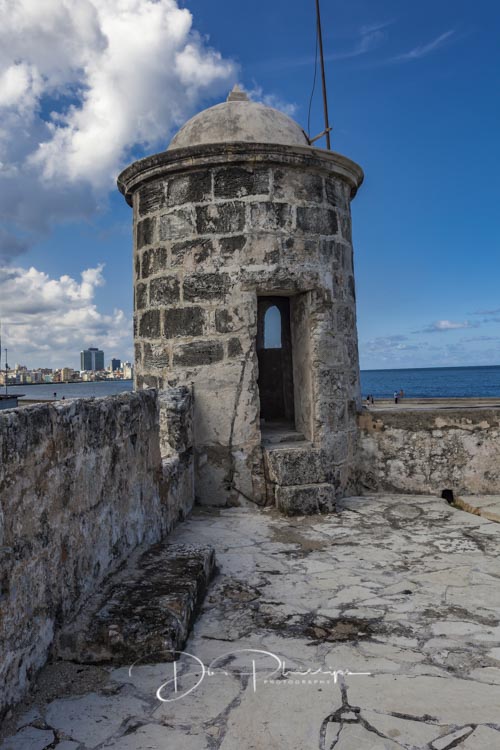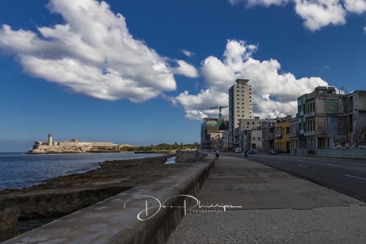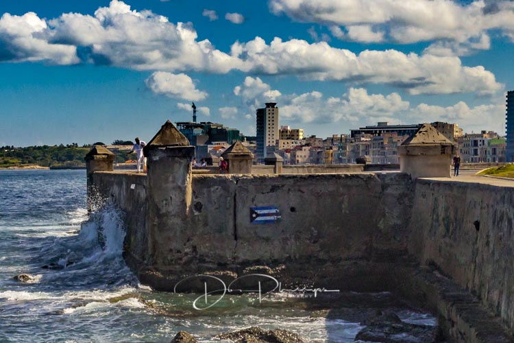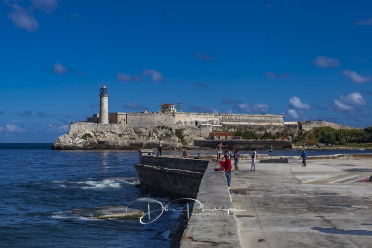 Without much difficulty we find a street fair we have heard about on Paseo del Prado, otherwise known as Paseo de Marti, and we walk along checking out all the local art on display. It is just few steps away from Telégrafo and Parque Central hotels, this is a place that grabs passerby’s attention, not only by its privileged location but also by the items on sale. We see tons of vivid paintings that depict the Tropical feeling around us. There are street landscapes full of Old American Cars and lovely people walking, portraits in watercolor, charcoal drawing and much more! At the end of Paseo del Prado, we come across the Malecon (A seawall and walkway along the coast) and an interesting old fort, ‘La Punta Fort’. We cross the boulevard and walk around the fort after paying $1 each to go inside and my camera stays happy. Views of the fort overlooking the modern part of Havana give striking contrast to our surroundings.