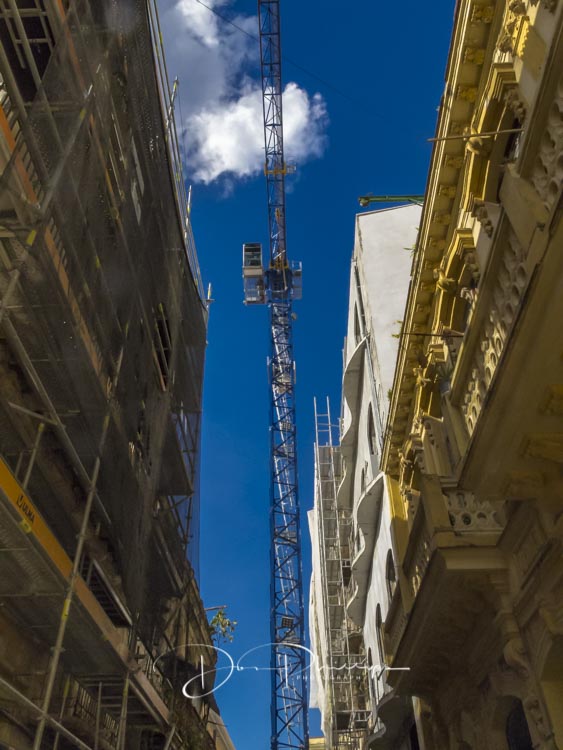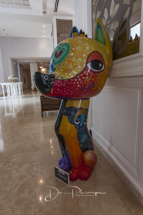 Today, we arise and go out and find breakfast. We actually go into a large hotel just to see how the Europeans do it and breakfast is lackluster at best and it costs $70 by the time we get out of there! We’re glad we didn’t try this before! Tummies satisfied, we walk around the top floor of the hotel and find an outdoor patio for a view. Strange art sculpture adorn the lobby as we leave.