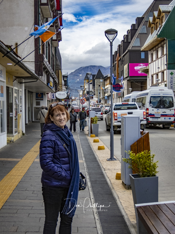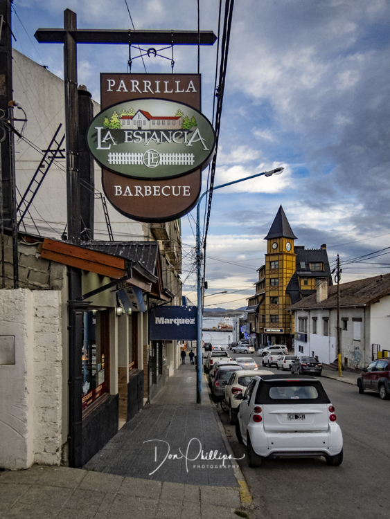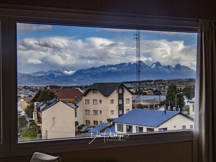 We awake and have a full day to walk around and check out this sleepy city but most of our concerns are focused on what do we do if our luggage does not show up. Breakfast at the hotel is simple, pastries, a couple slices of ham and drinks of your choosing. I’d do something creative for some eggs but it seems that is a difficult commodity to find at the End of the World. But the views from the breakfast room are really good and we can see the Port and even the sun is making an attempt to break through the clouds, alas unsuccessfully so. So with bellies full once again and our stress levels high with the prospect of having no luggage, we head off into town and find a grocery store that sells different aspects of clothing.