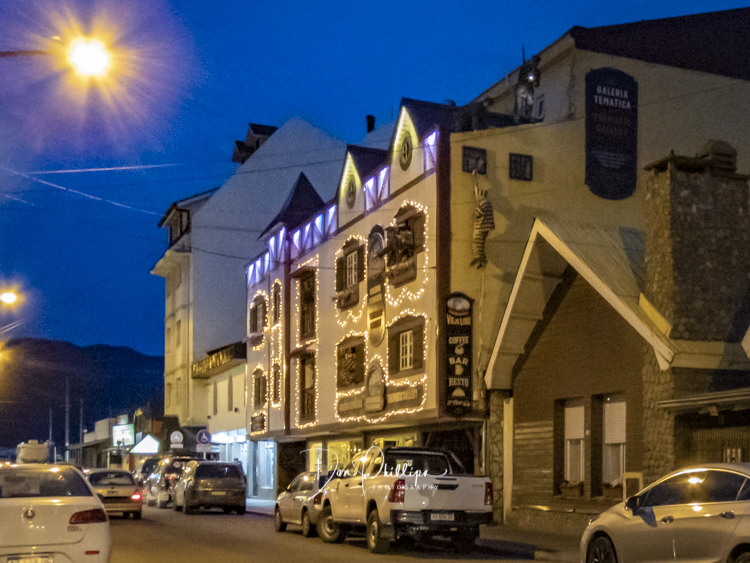 The City Tour commences and we get an overview of this fun little city down at the End of the World. It is picturesque and quaint with quiet streets and scenic overviews. They take us up into the hills and down to the port and tell us all about this place that started as a Penal Colony. After all, it is a perfect place to put the dregs of society with little hope of them escaping anywhere. They instead turned the place into a thriving city with a bustling economy! Flag displays and a local shipyard where the bus stops for 15 minutes so we can get photos of this magical place. We pass by the local marina and look over the town and mountains that seem fresh out of a post card. There’s even a casino in town! A beached boat museum and street art catch the camera’s eye and the bus arrives back at the Port and we get off. I have to notice as I do everywhere we travel, telephone poles and wire configurations that would drive an electrical engineer crazy!