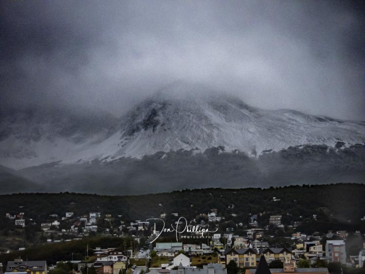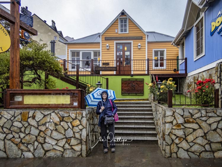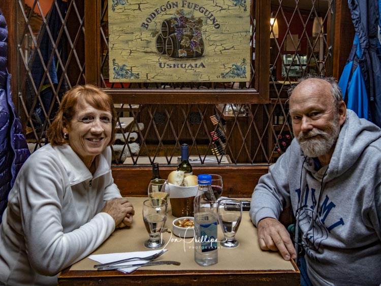It is noon and we stop into “Bodegon Fueguino” Restaurant that has been closed when we have passed it several times in the last couple days. It was recommended to us by more than one local person. We get seated and I ask the waitress what dish she would eat if she were ordering and she points out a lamb dish and I order it. Elee gets Empanadas and Sopas. Delicious food that again does not disappoint! Bellies full once again, we head back to our hotel in the steady drizzly rain covered in sweatshirts and newly acquired rain gear. It seems the longer we stay in Ushuaia, the worse the weather gets. The rain in town is snow in the local mountains and the views, when we get one, are gorgeous!