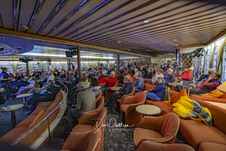 We learn that this trip differs from a normal Cruise in several aspects. This is an Expedition Ship, not a Cruise Ship. A Cruise Ship has a set Itinerary and Ports of Call are scheduled and pretty much “Set in Stone”, so to speak. Also, most Excursions on a Cruise Ship are additional and participation usually costs extra. An Expedition Ship has an “Expedition Leader” (as opposed to a Cruise Director) that works with the Captain and the trip and Ports are designed Day by Day and are affected by Weather, Wind & Ocean Currents, among other factors. Excursions are included and no extra expense is incurred to participate. So our adventure begins and we will be informed as we go of what we will experience!