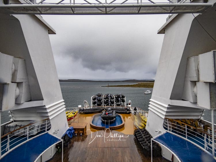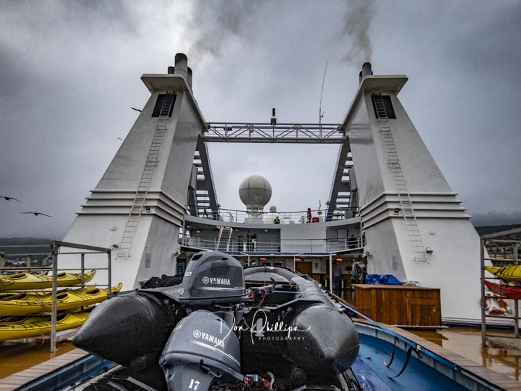We show up at the docks and board the ‘dock bus’ to take us to the gangplank and we walk on. A bit nervous and queasy about not having the exact things we worked so hard to acquire, we settle into the ships lounge with the other 185 Passengers and 144 Crew Members for the introductory meeting and orientation. At least they open the bar and we all have intro drinks in hand. Ah, now things improve! The Crew tells us what to expect for the next 14 days and everybody is put at ease. Our Expedition Leader, Lori, introduces us to the crew and each Crew Member tells us a little bit about themselves. Jokes are shared and the mood is light as each Crew Member has fun at their own expense!