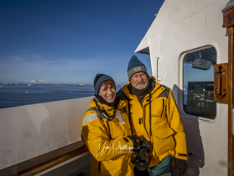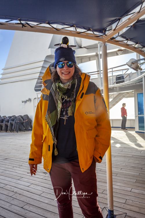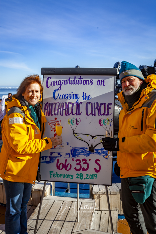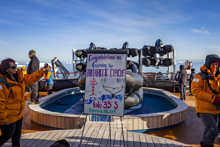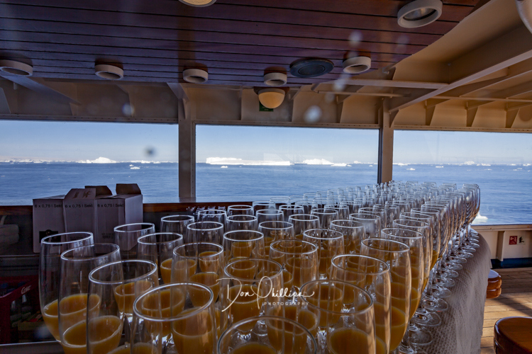 As we walk around the ship, we come across the party deck where the crew readies us for a celebration with Mimosas! We cross the Antarctic Circle today! Elee’s first day of Official Retirement! Let the fun and celebrations begin! Mimosa’s for all as we complete a lifetime landmark.