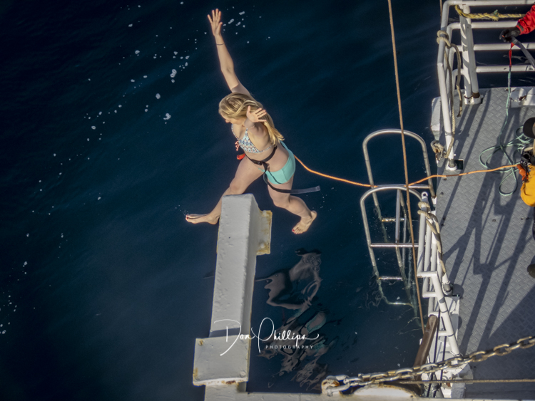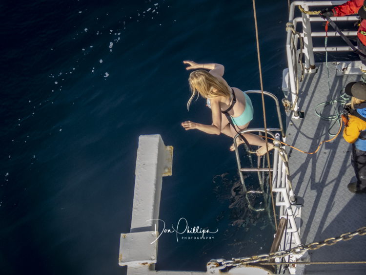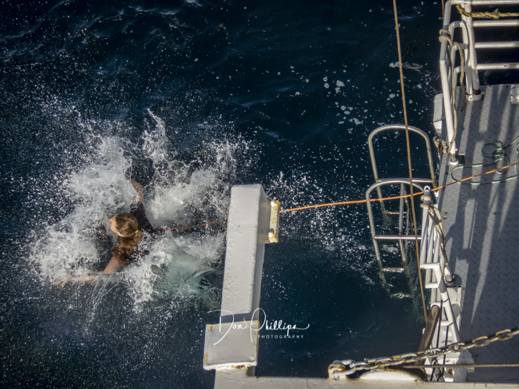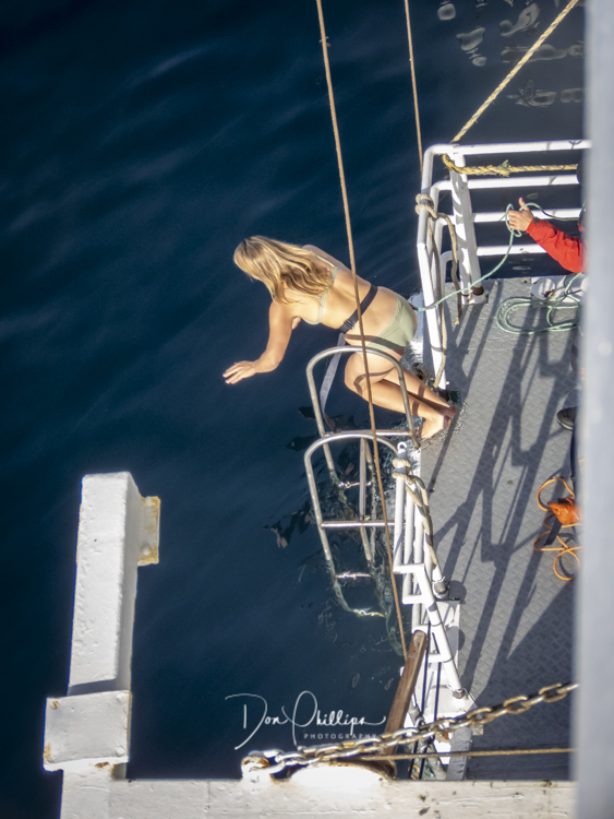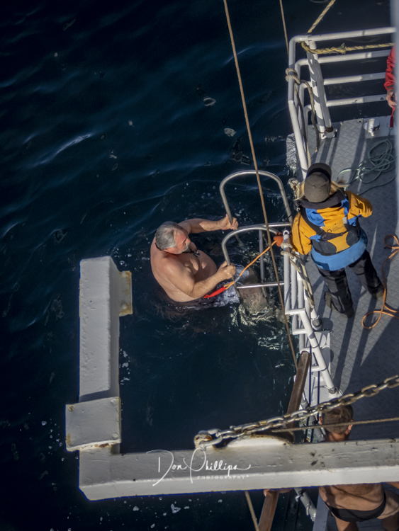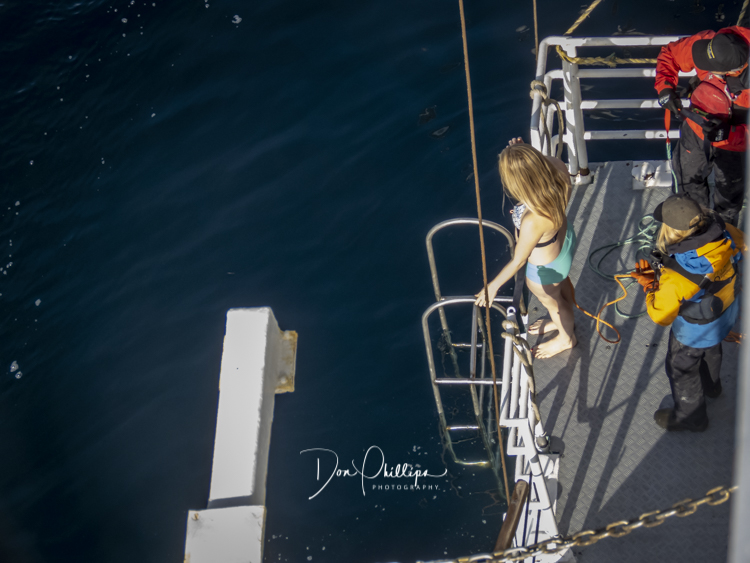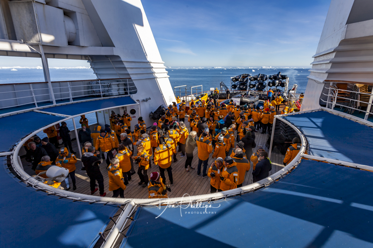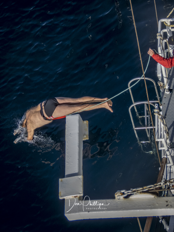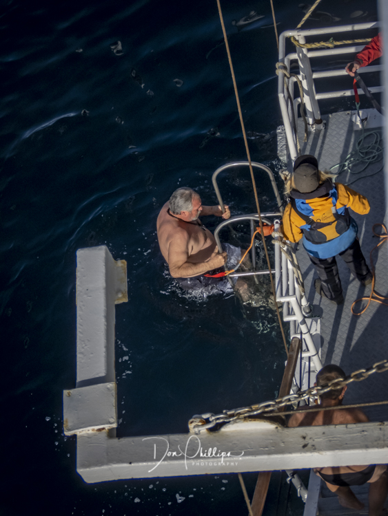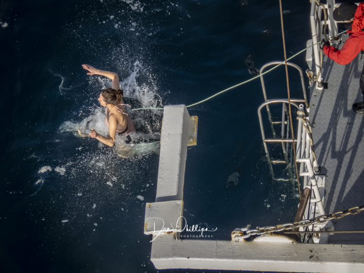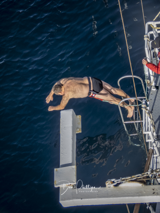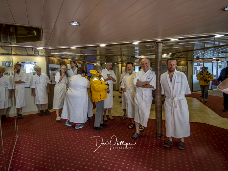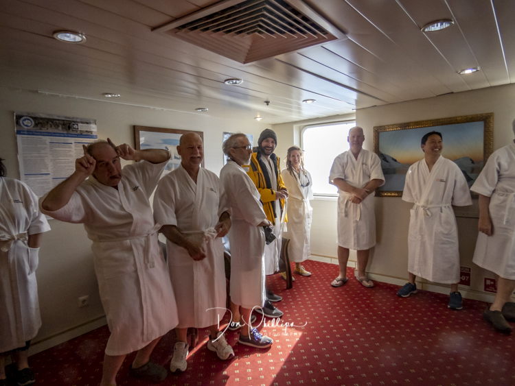 Next, we watch crazy passengers take the “Polar Plunge”. Passengers get to put on their bathing suits and jump into the Southern Ocean South of the Antarctic Circle! A bit crazy, but a landmark for some! Elee and I ‘Opted Out’ of the Plunge, which we were told was Minus 1 Degree Celcius or 30 Degrees Farenheit!. So many of the “Plungers” couldn’t get out of the water fast enough! Others tried to swim away, but the crew ‘tethered’ each jumper so they could retrieve them quickly. The ones that wanted to swim away were the most crazy!