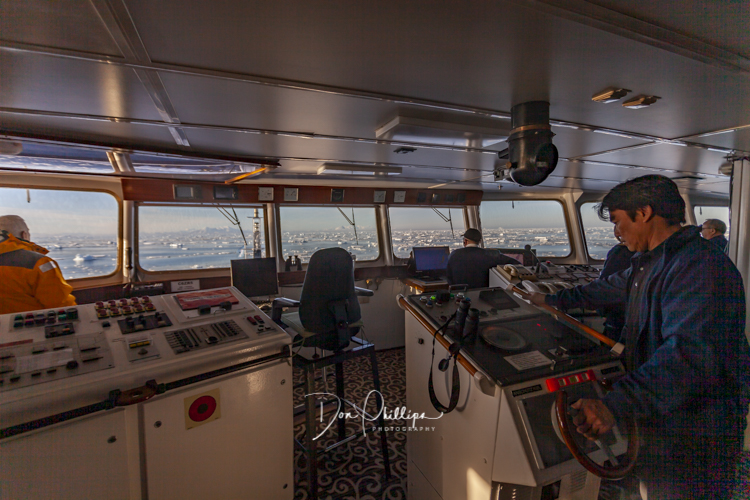 This morning we sail through ice flows and watch as our captain expertly avoids danger. We can only imagine that some of these flows could cause massive and possible catastrophic damage to our ship, but the crew guides us through without so much as a hiccup. This is where we are impressed with the “Open Bridge” of the ship as all the passengers are invited to visit the bridge at our leisure to witness the navigation abilities of the crew. All that is asked of us is that we stay quiet and behind the crew as they do their work and perform their magic!