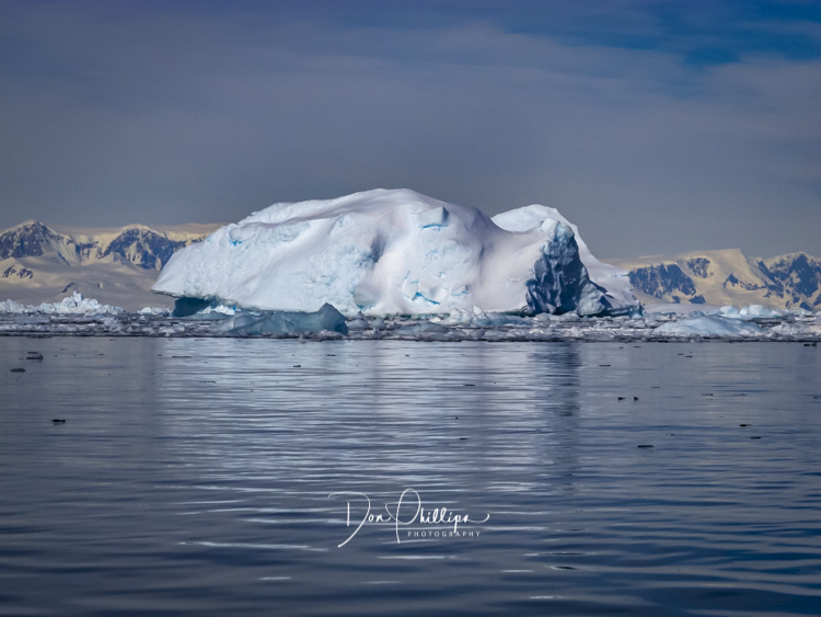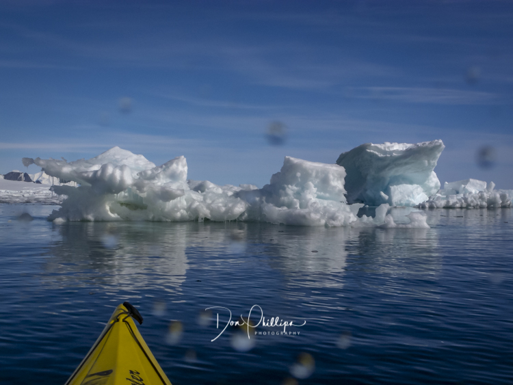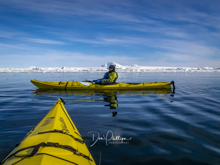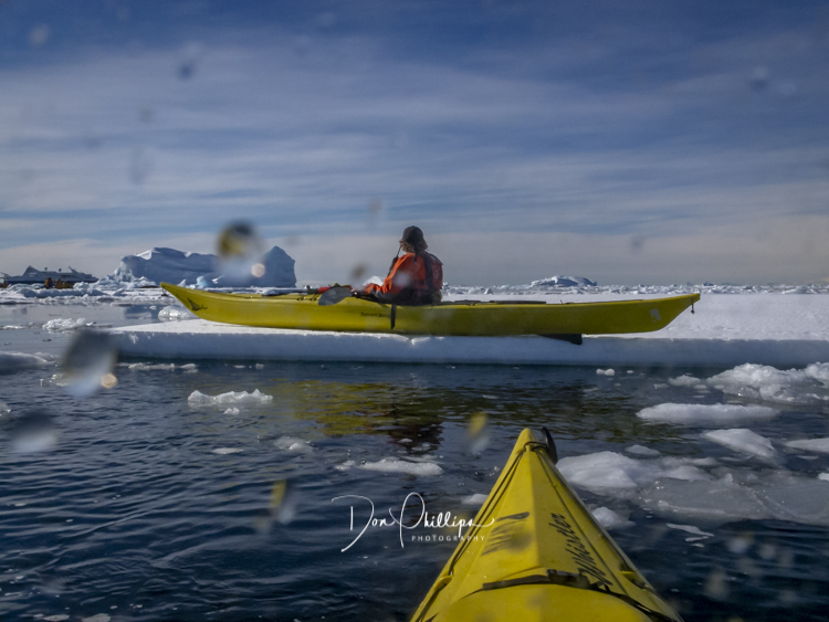 Next for the afternoon, the ship sets anchor and we suit up in our dry suits for a kayak adventure. We kayak in perfect conditions South of the Antarctic Circle! We find ourselves paddling through actual brash ice and ice flows which becomes a bit of a challenge but fun nevertheless. While kayaking below the Antarctic Circle today, Zodiac boats came out to greet us and we were instructed to come together and “Raft Up”, side by side, holding each others kayak and, lo and behold, we were passed coffee cups filled with Hot Cocoa and Bailey’s Irish Cream! Such a treat while floating among the ice floes, sea ice and icebergs in the Antarctic Ocean!