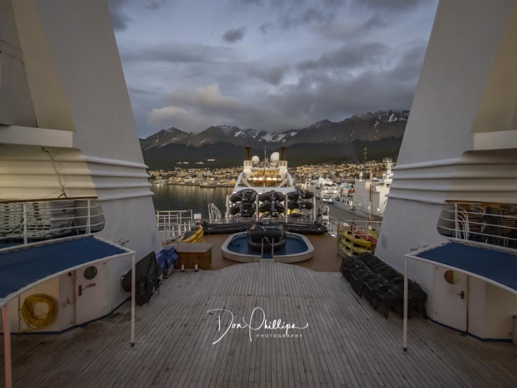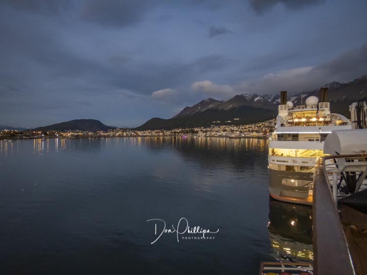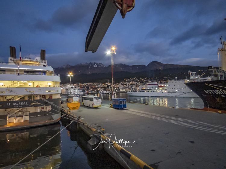 We are not in the first groups to disembark for those are reserved for those who need to get to the airport for early flights. We are scheduled to spend the night in Ushuaia and travel on to Buenos Aires tomorrow. So we watch Flightless Timber Ducks in the water and other sights while we wait.