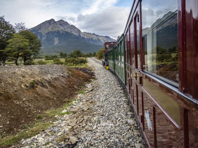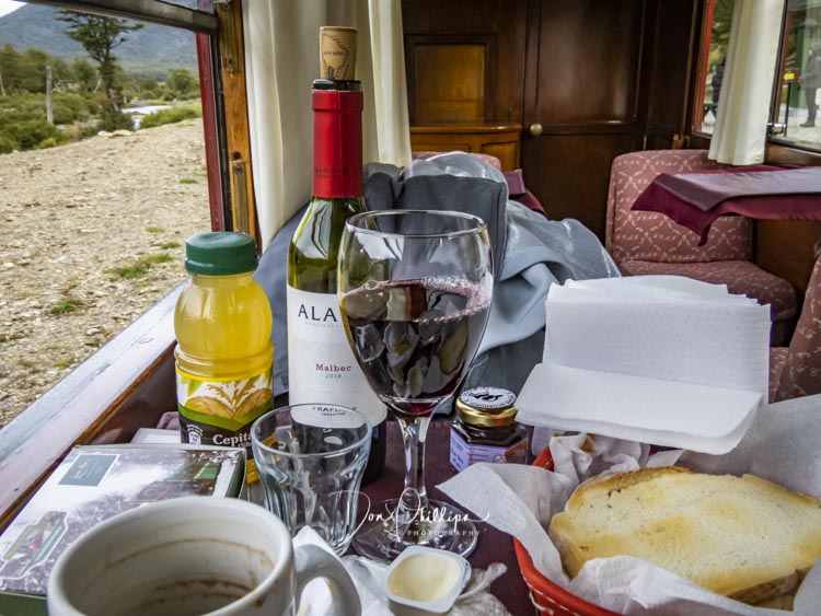 So, a few hours later we find ourselves back in Ushuaia with our luggage and we check into our new hotel for a day. We store our luggage and grab a taxi to the National Park where we buy tickets to ride the Historic Prisoner Train (Tren del Fin del Mundo) through the park. It turns out we end up spending an 5 extra dollars each and get our own train car, complete with wine and lunch! What a deal!