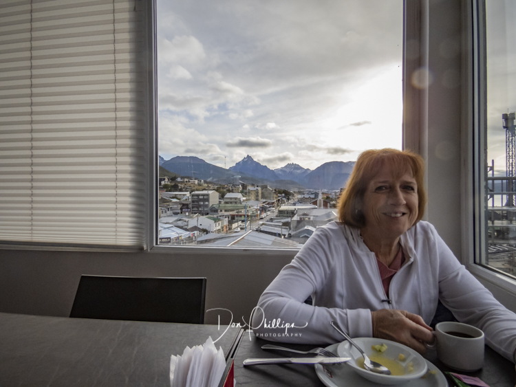 We wake in our new hotel room and pack our bags of our next leg of our journey. Heading into the breakfast restaurant on the fourth floor, we dine with a view of the town and the harbor. We can see our ship as they are likely cleaning it and getting ready for the last voyage it will make this season before heading north for other endeavors.