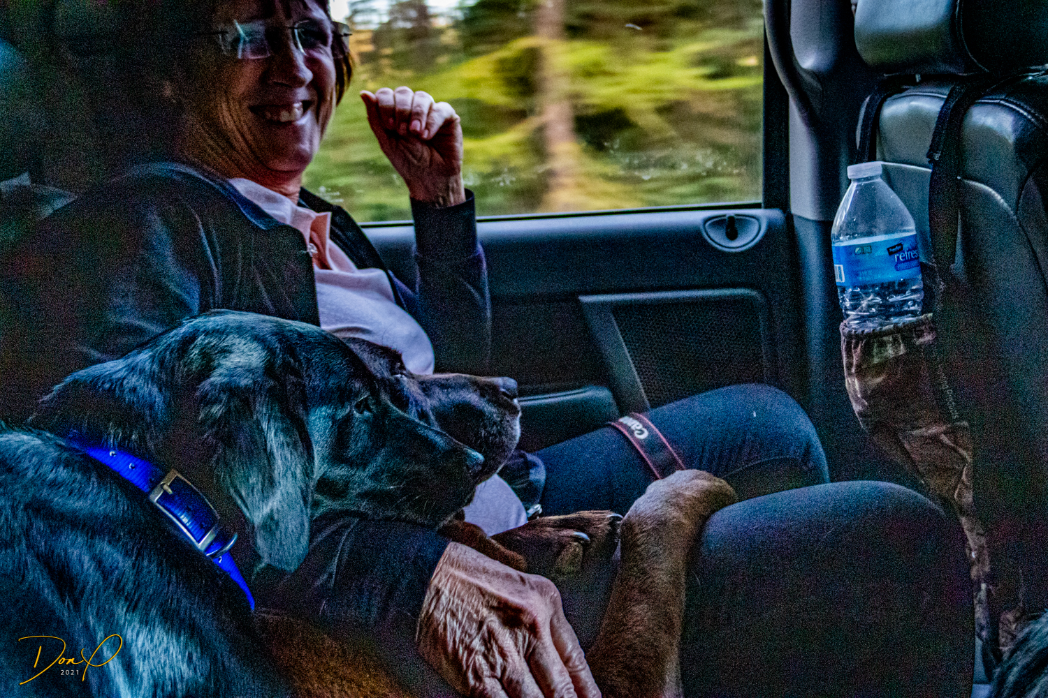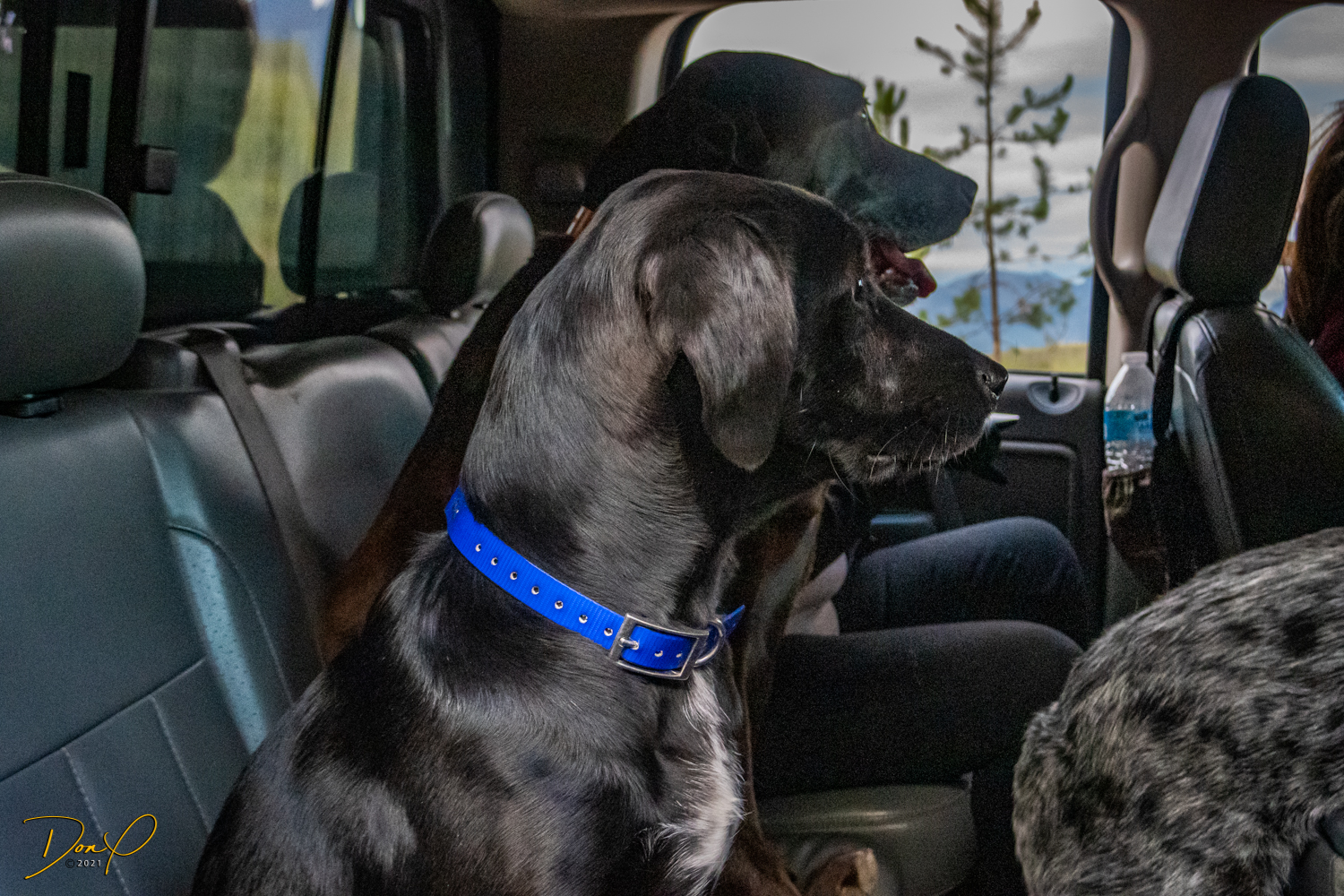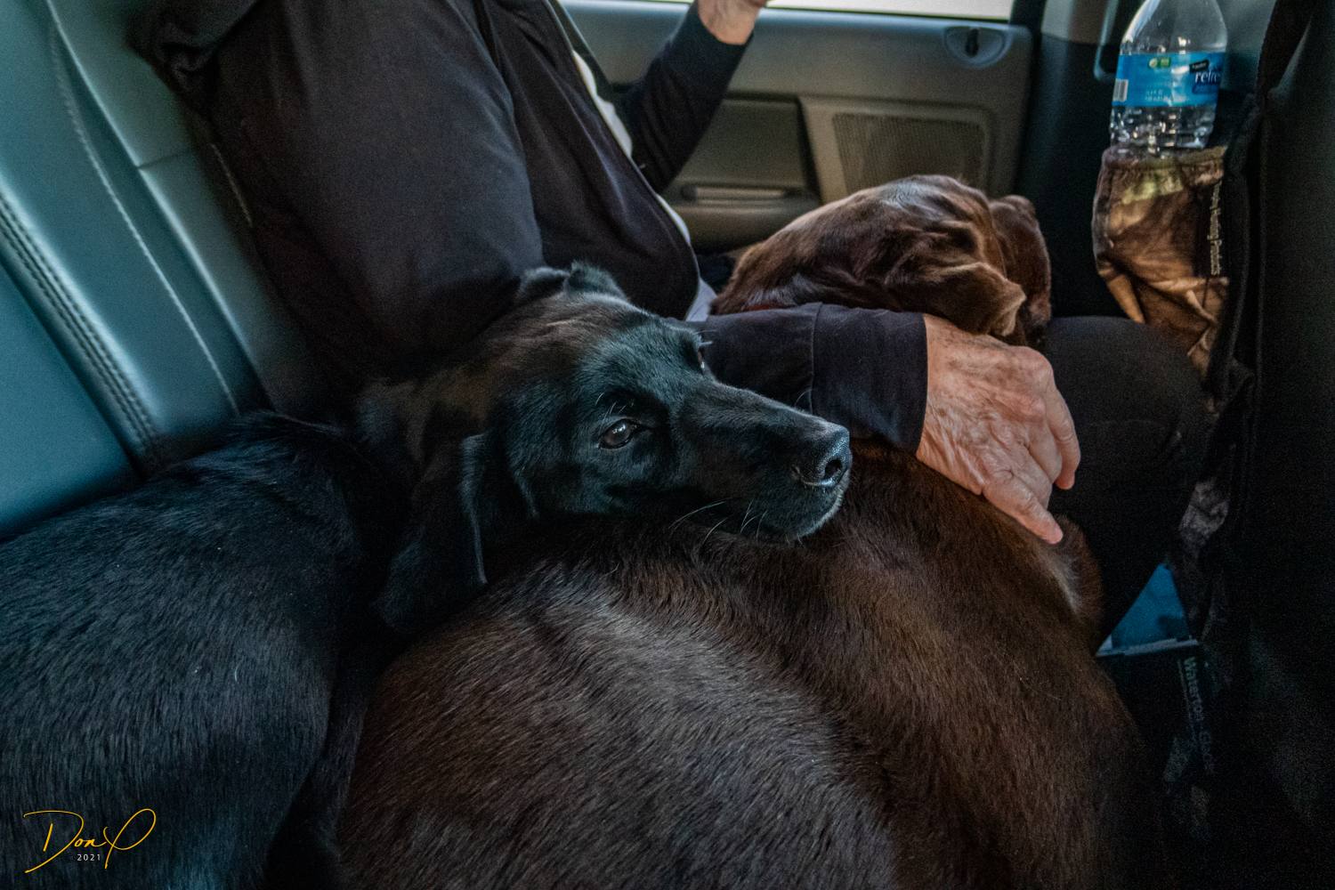 So we happily accept Sue’s offer of a ride and we join her with her four friendly dogs! The oldest dog, Rambo, an 11 year old Chocolate Lab, loves to sit in the back seat with us and is totally happy to lay his head in your lap and loves to be petted! Rambo’s best friend, Gunner, is the youngest and loves to sit in your lap! Then there are Sue’s two Healers, Trigger and Zip whom pretty much stayed up front with their Master but were curious and appreciative of back and head scratches!