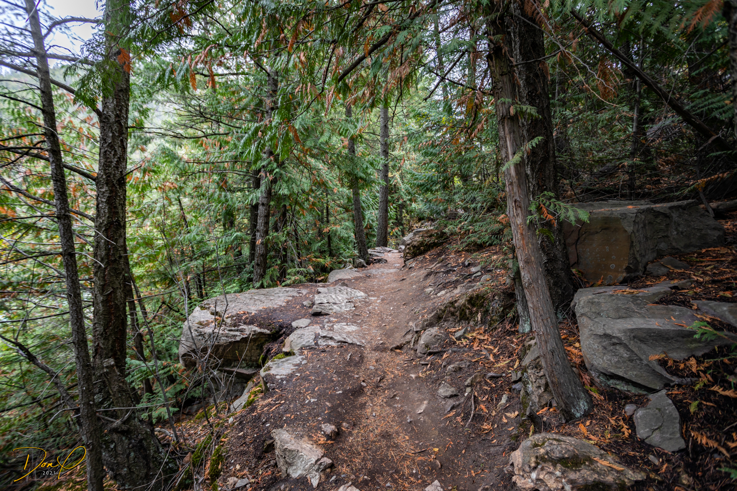 The bridge spanned the Kootenai River and was wobbly to cross, in a fun way! Then we hiked a trail along the river to find some small waterfalls to walk around.
