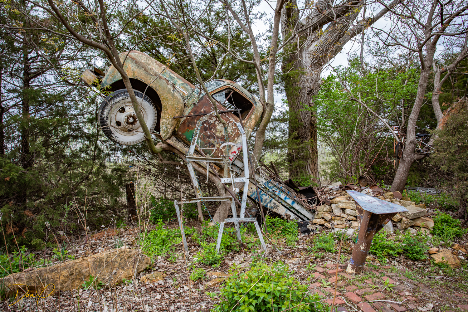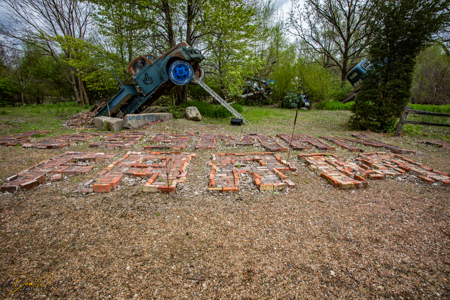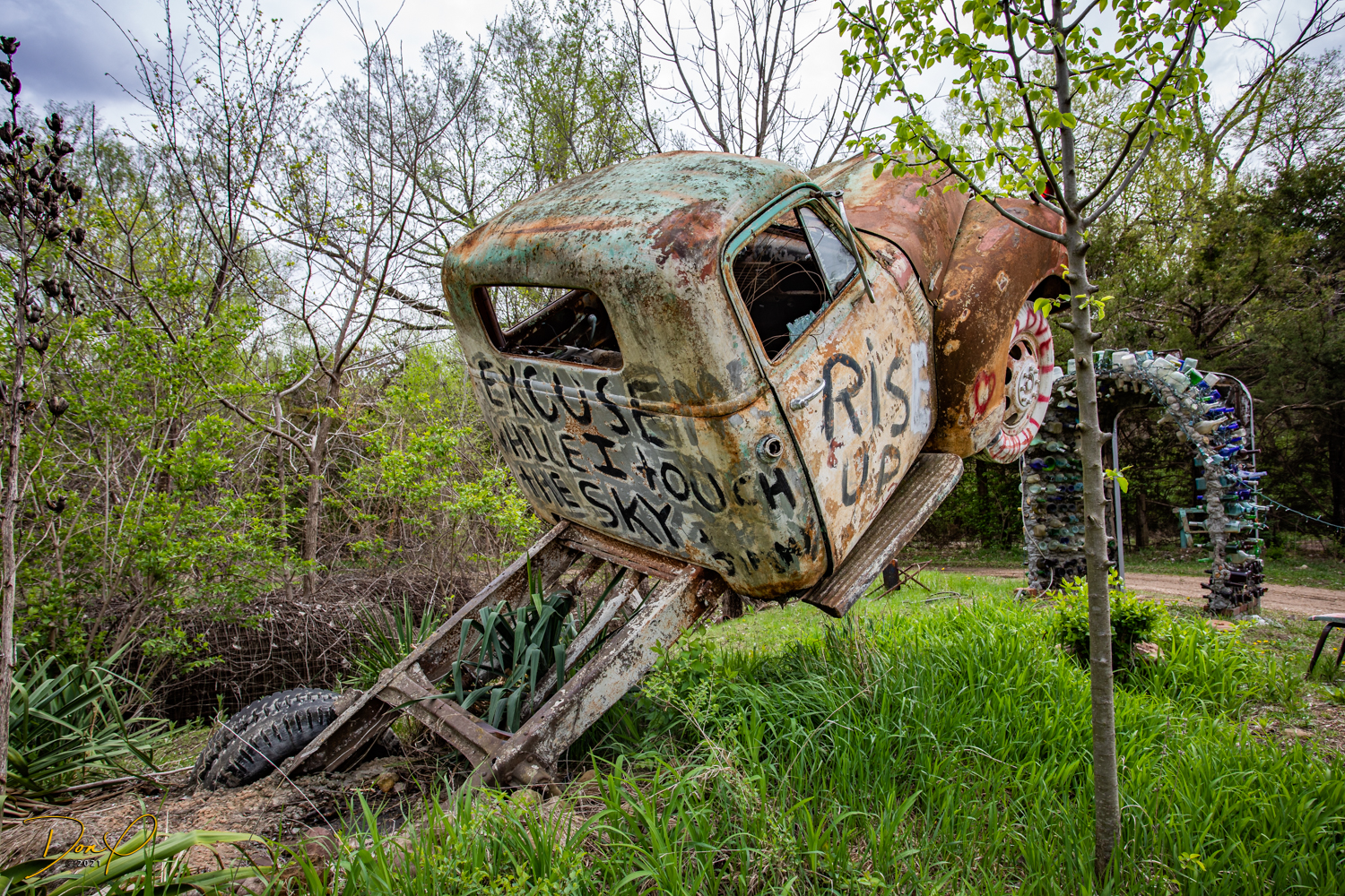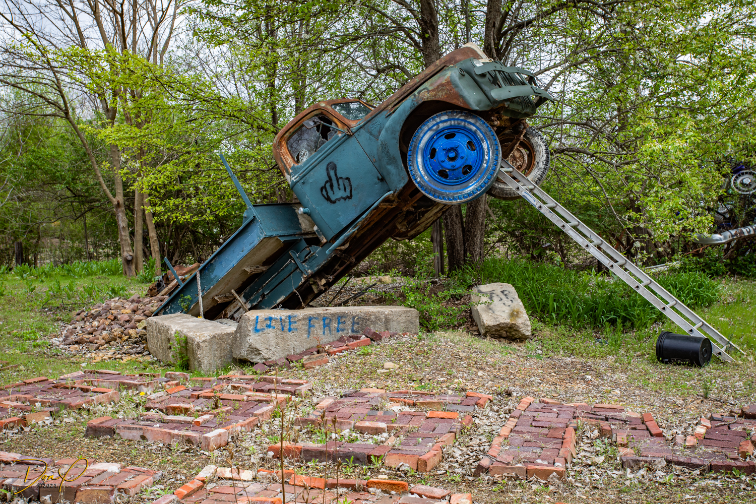 Now we have lost almost 3 hours that we thought we’d be driving but we try to keep to our plan. We have spotted a place called “Truckhenge” that has peaked our interest and it is just over an hour from us in Topeka. We arrive there and we have to drive by car and truck junkyards and construction sites. Wow, this is becoming comical! But we come across this derelict property but recognize this must be the place as we see trucks sticking out of the ground!