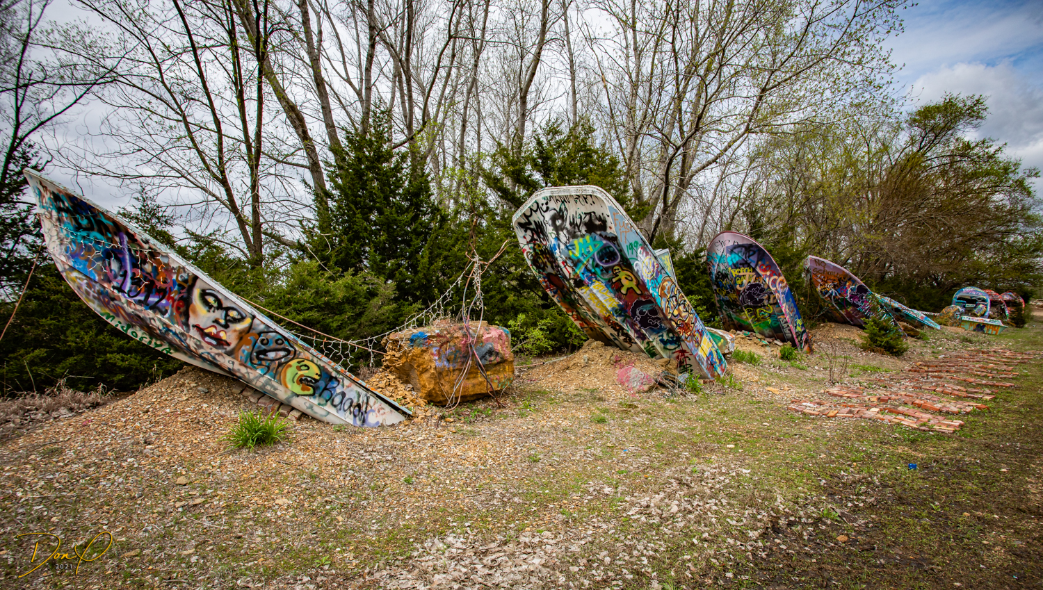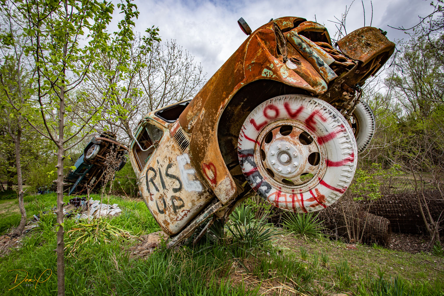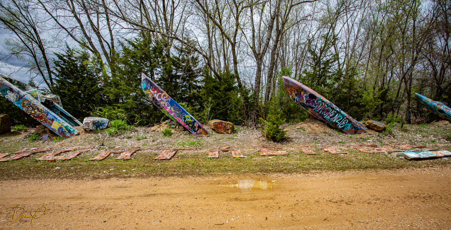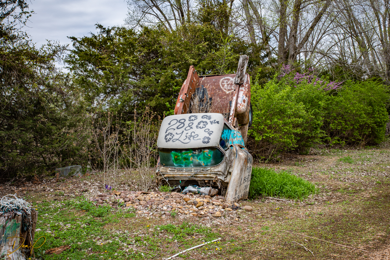 Now we have lost almost 3 hours that we thought we’d be driving but we try to keep to our plan. We have spotted a place called “Truckhenge” that has peaked our interest and it is just over an hour from us in Topeka. We arrive there and we have to drive by car and truck junkyards and construction sites. Wow, this is becoming comical! But we come across this derelict property but recognize this must be the place as we see trucks sticking out of the ground!