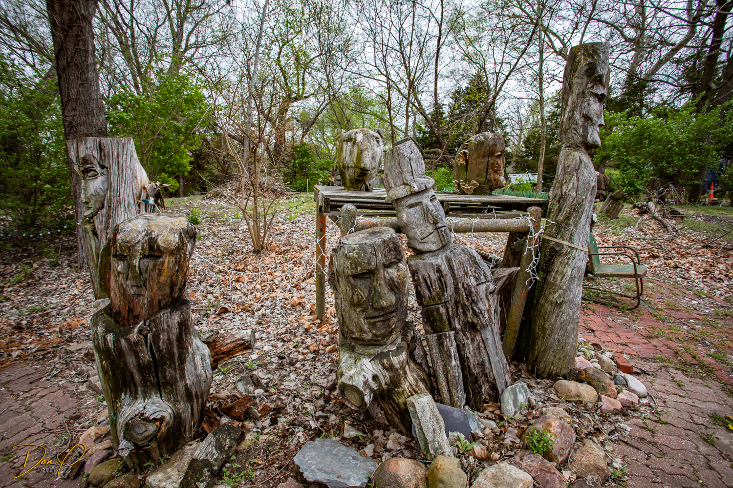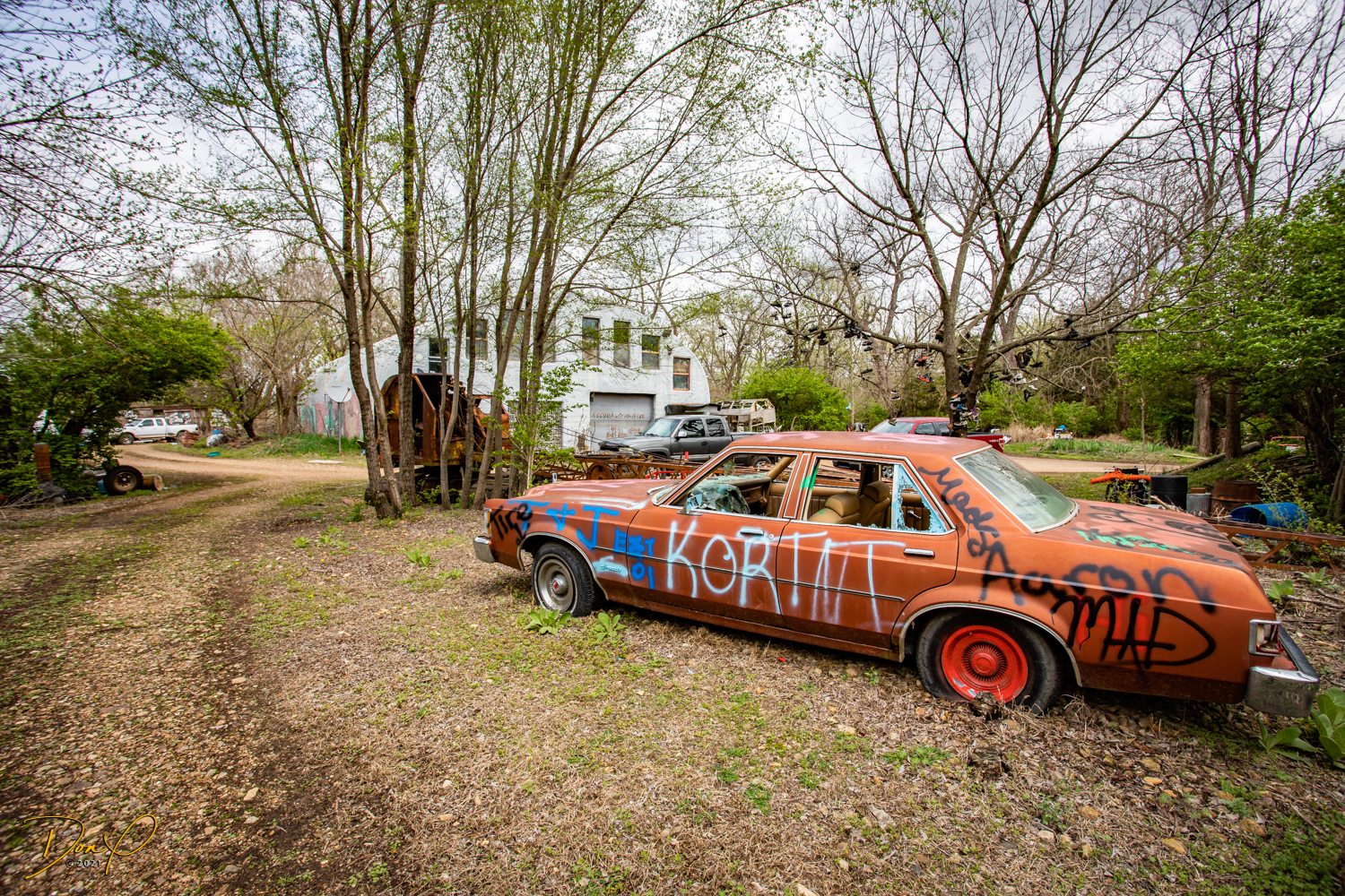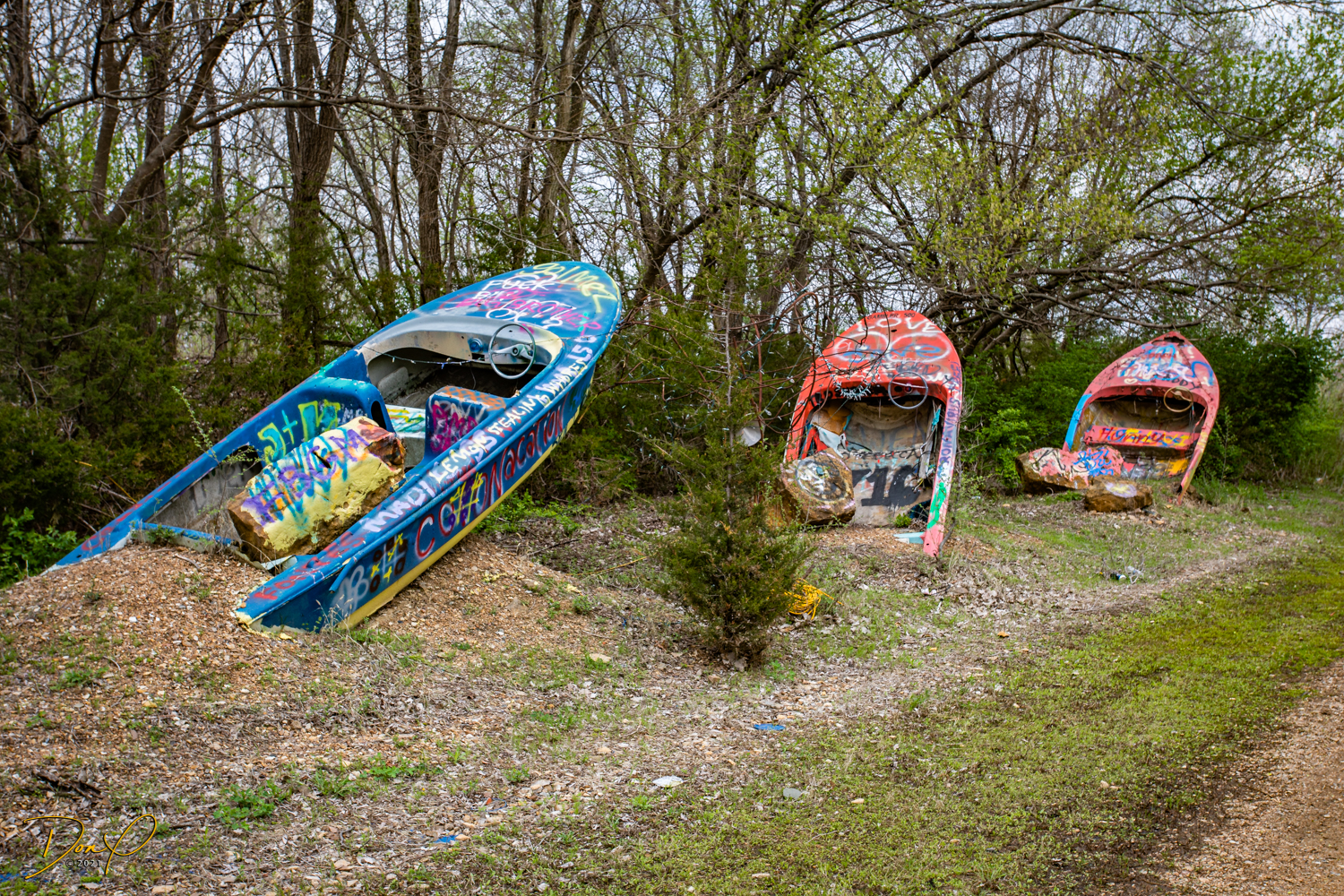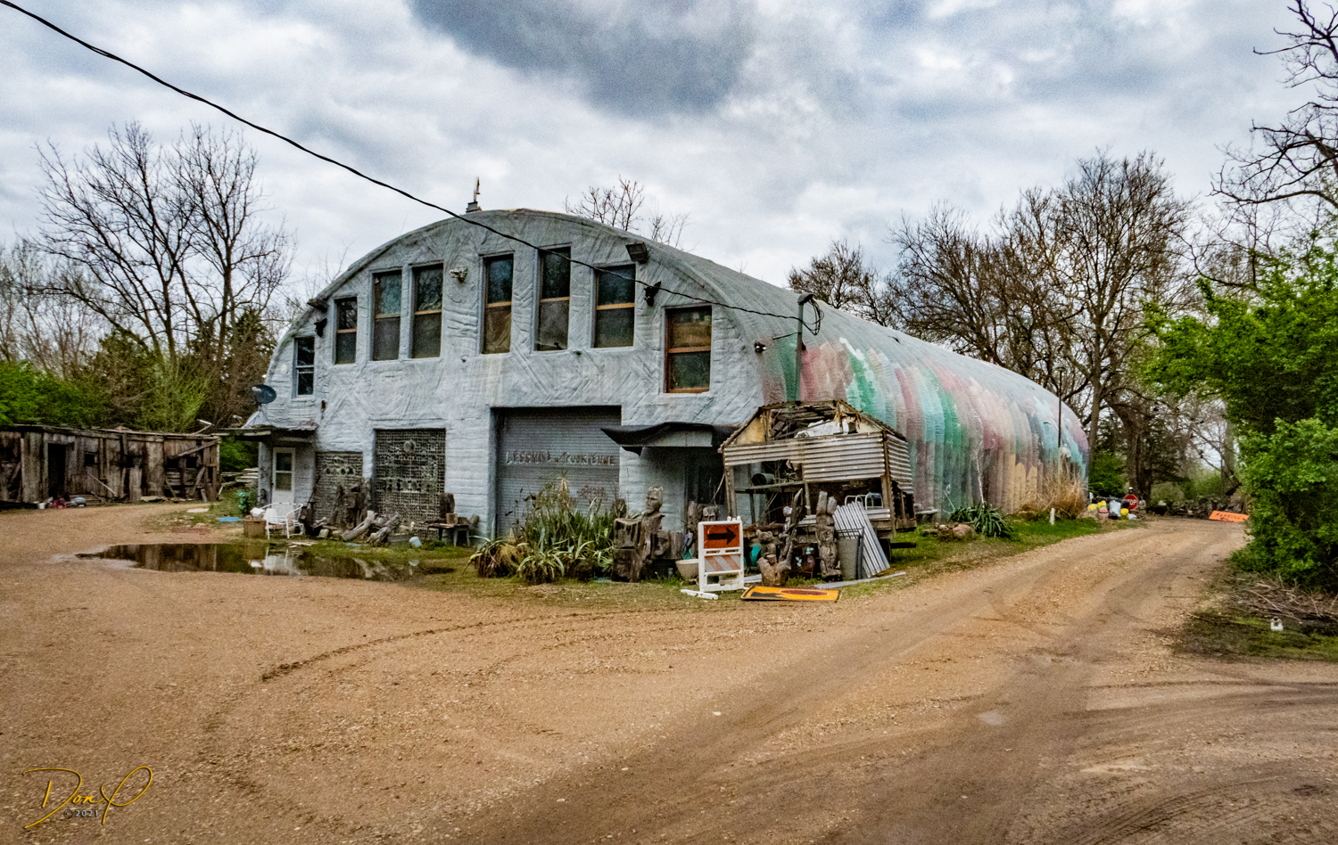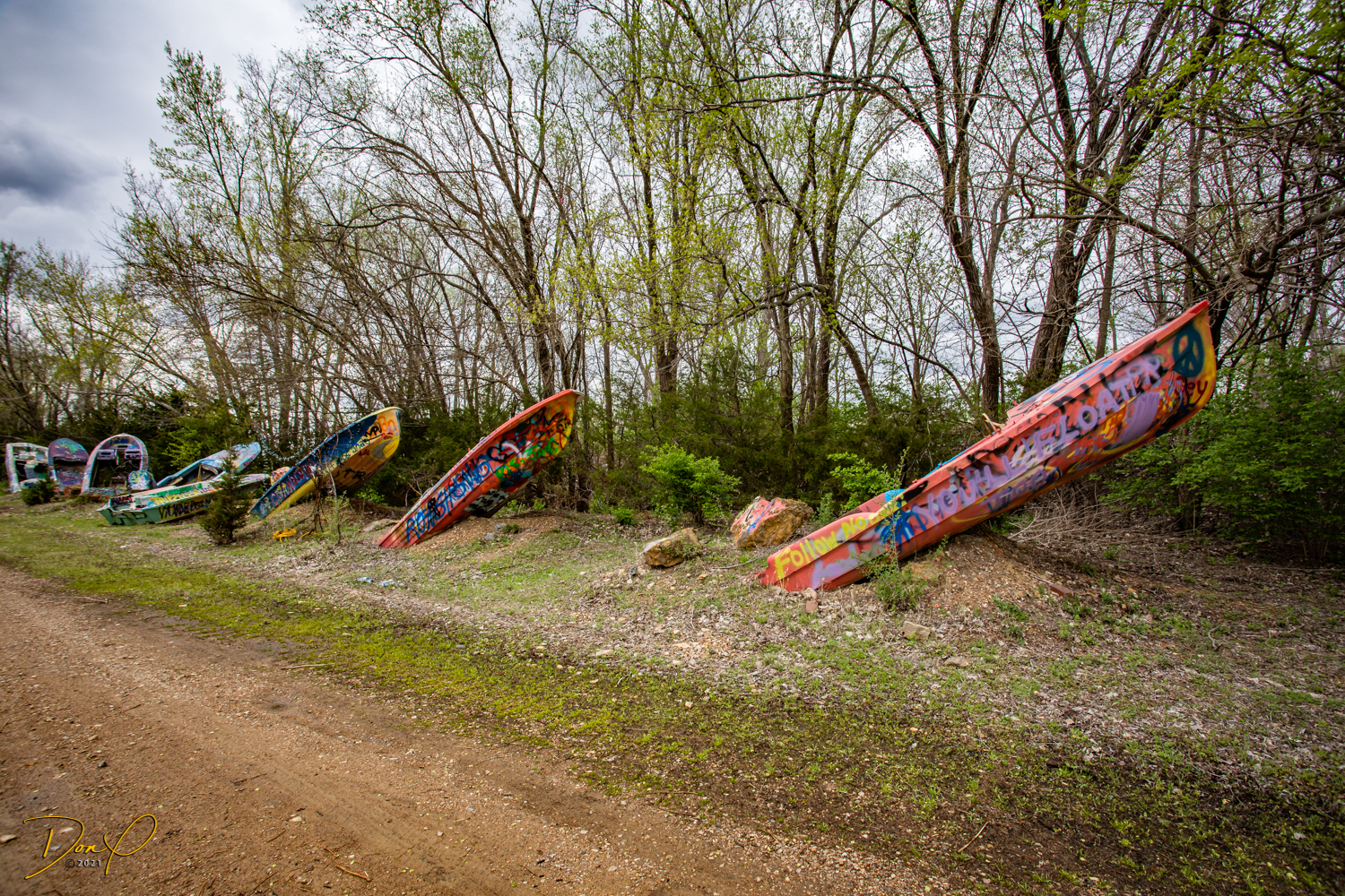 Now we have lost almost 3 hours that we thought we’d be driving but we try to keep to our plan. We have spotted a place called “Truckhenge” that has peaked our interest and it is just over an hour from us in Topeka. We arrive there and we have to drive by car and truck junkyards and construction sites. Wow, this is becoming comical! But we come across this derelict property but recognize this must be the place as we see trucks sticking out of the ground!