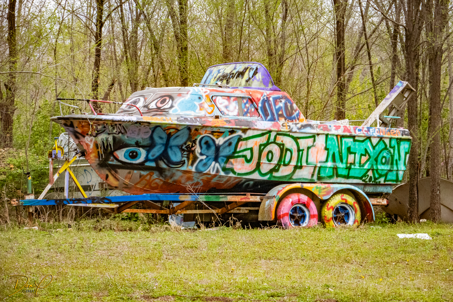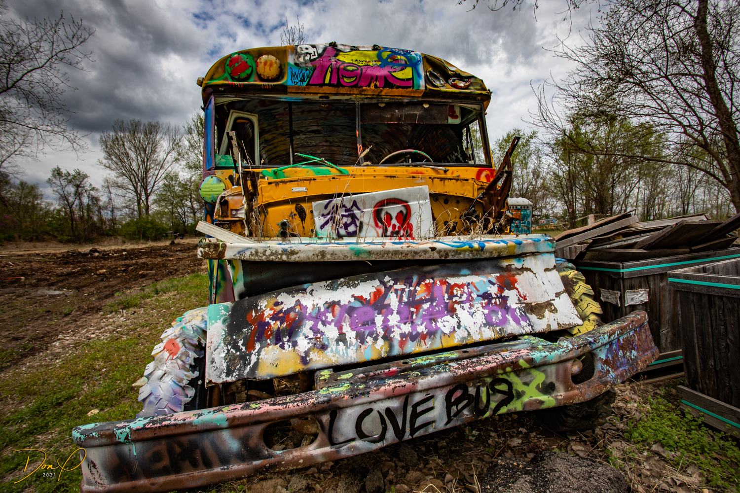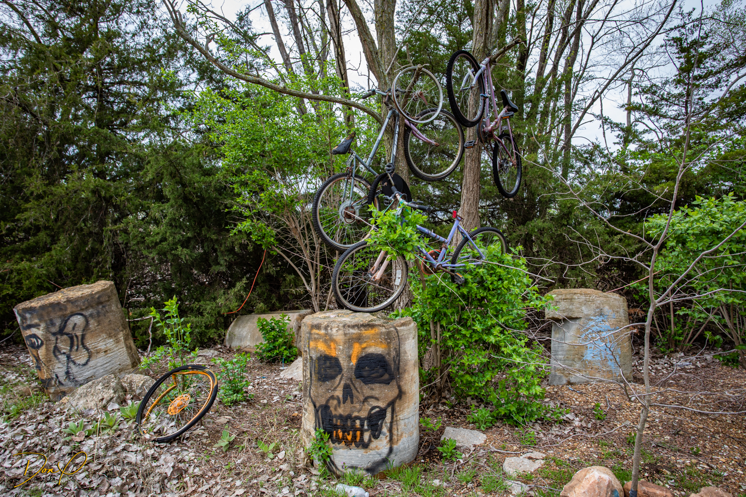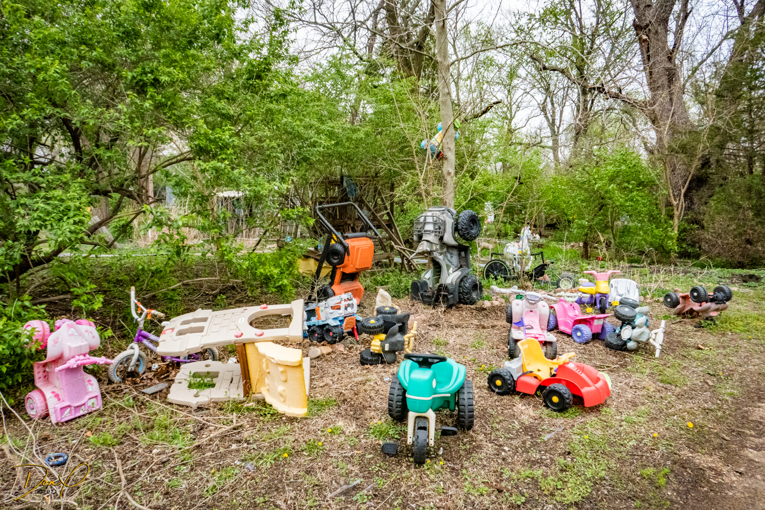 Now we have lost almost 3 hours that we thought we’d be driving but we try to keep to our plan. We have spotted a place called “Truckhenge” that has peaked our interest and it is just over an hour from us in Topeka. We arrive there and we have to drive by car and truck junkyards and construction sites. Wow, this is becoming comical! But we come across this derelict property but recognize this must be the place as we see trucks sticking out of the ground!