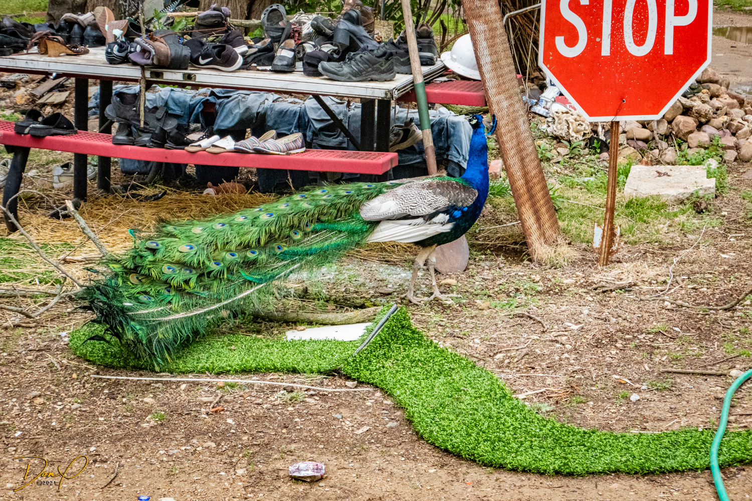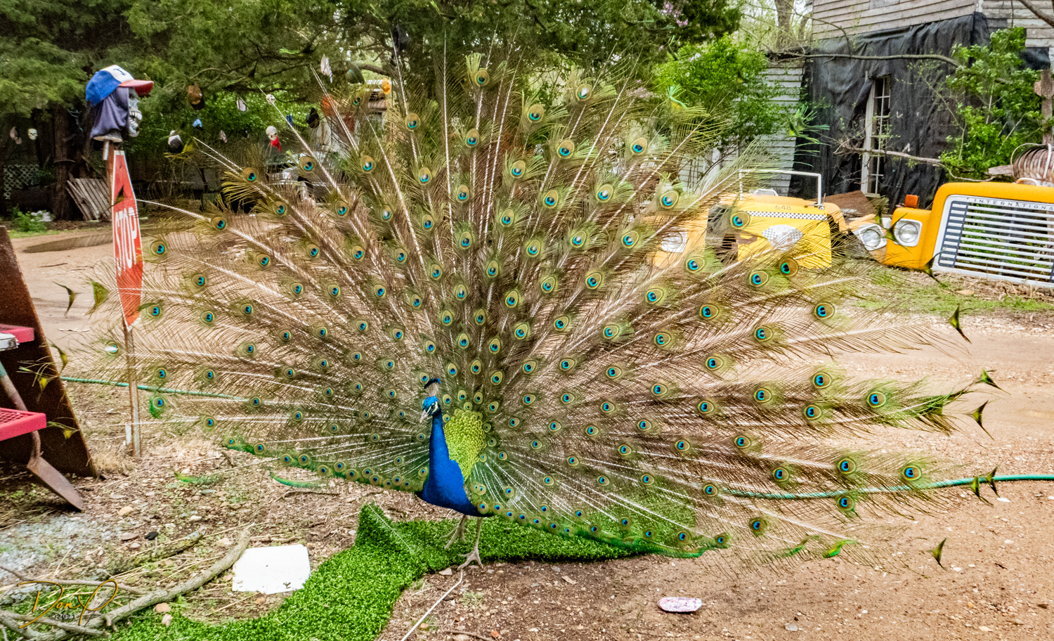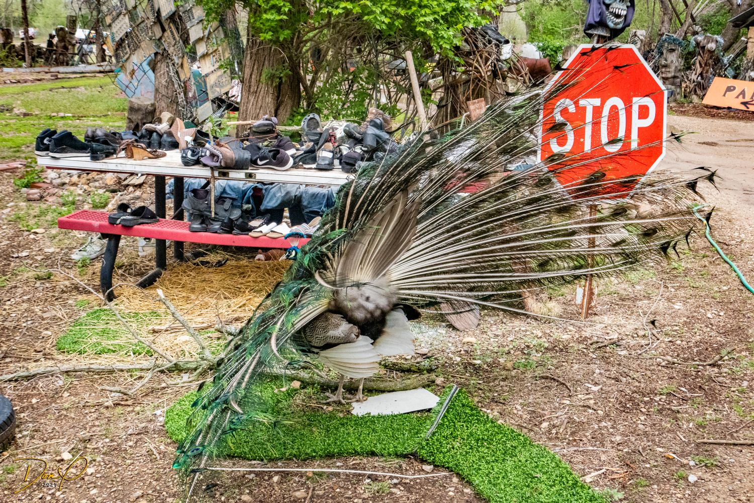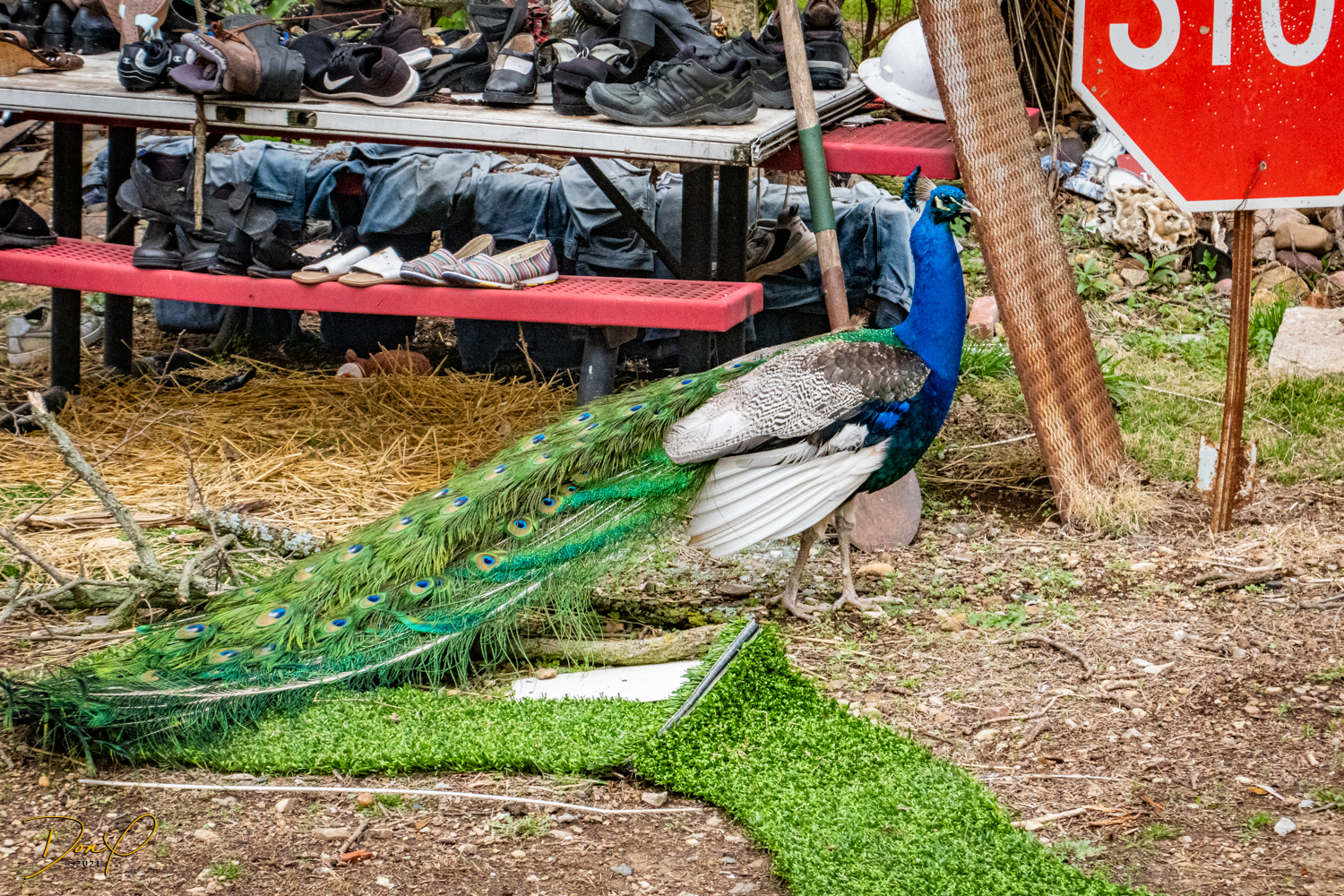 So we manage to turn the RV around at the end of a narrow dirt path and park outside of Truckhenge as the driveway appears to be too narrow to navigate our Beast into. We walk into the property and don’t see anyone. So we browse around and don’t make any effort to hide our presence. Sure enough, after 5 minutes, and older man with a full scraggly beard comes out and makes his presence known as the owner. He is pleasant and jovial and begins regaling us with stories of his past and how he came about creating his art, which includes chain saw carvings, junk turned into art, exhibits named “Boathenge, Truckhenge, Carhenge”, etc. I dub some of his displays, “Bottlehenge”, “Bicycle Tree”, among others including a “Shoe Fence”. This man talks 3-5 times faster than normal. The words fly out of his mouth! I can only understand a little of what he says but Elee understands most of it, LOL. She says it’s because she is from New York! He invites us to return with our own spray paint cans and to decorate his displays any way we like! Reminds us totally of “Cadillac Ranch” in Texas that we visited a few years back. We even spot 3 beautiful Peacocks wandering the property and one of them even preens its feathers for me!