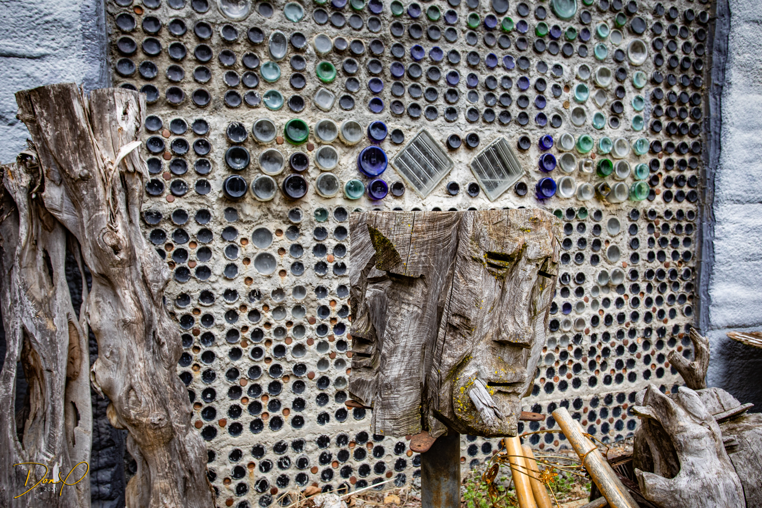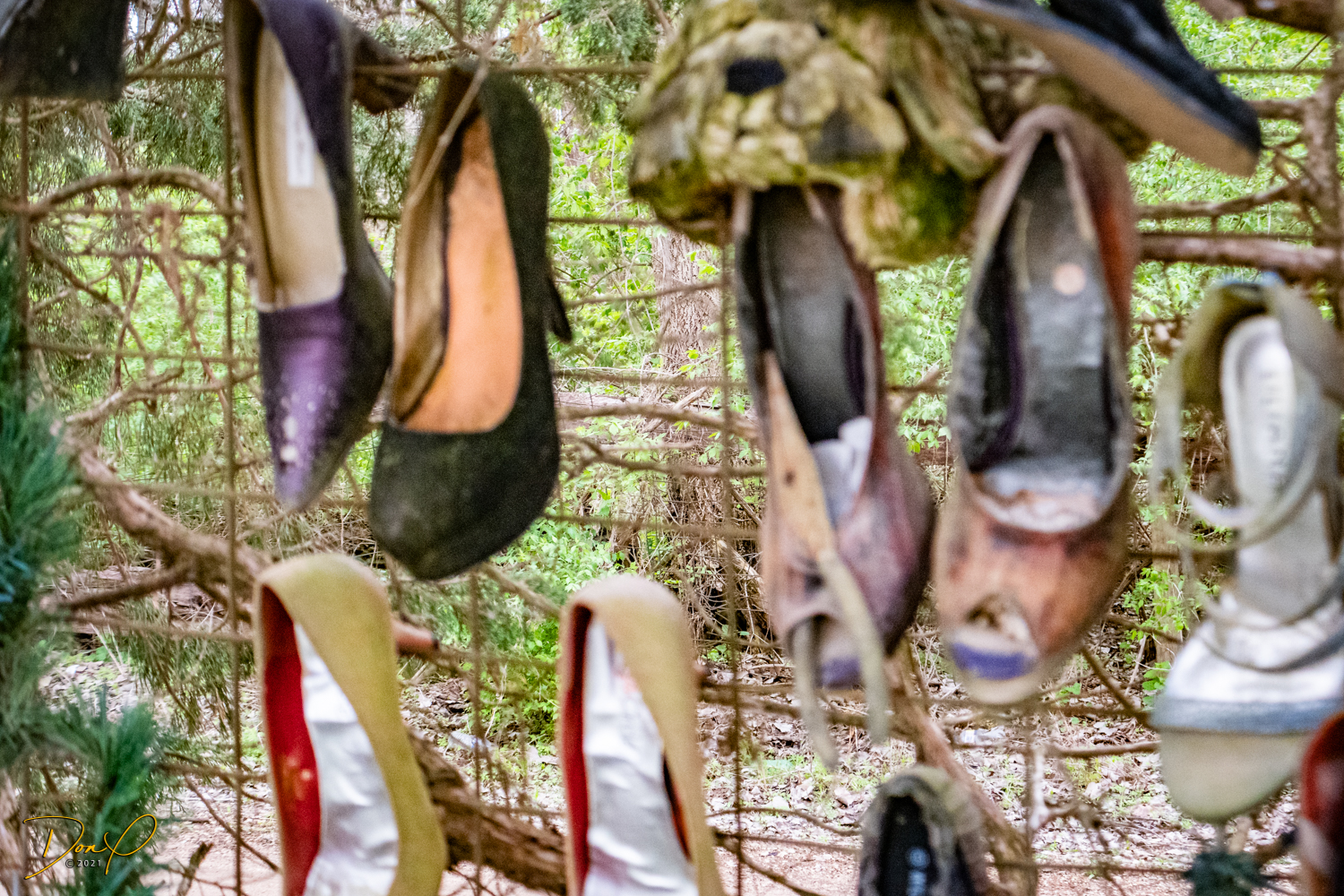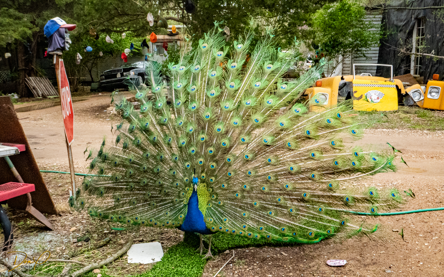 So we manage to turn the RV around at the end of a narrow dirt path and park outside of Truckhenge as the driveway appears to be too narrow to navigate our Beast into. We walk into the property and don’t see anyone. So we browse around and don’t make any effort to hide our presence. Sure enough, after 5 minutes, and older man with a full scraggly beard comes out and makes his presence known as the owner. He is pleasant and jovial and begins regaling us with stories of his past and how he came about creating his art, which includes chain saw carvings, junk turned into art, exhibits named “Boathenge, Truckhenge, Carhenge”, etc. I dub some of his displays, “Bottlehenge”, “Bicycle Tree”, among others including a “Shoe Fence”. This man talks 3-5 times faster than normal. The words fly out of his mouth! I can only understand a little of what he says but Elee understands most of it, LOL. She says it’s because she is from New York! He invites us to return with our own spray paint cans and to decorate his displays any way we like! Reminds us totally of “Cadillac Ranch” in Texas that we visited a few years back. We even spot 3 beautiful Peacocks wandering the property and one of them even preens its feathers for me!