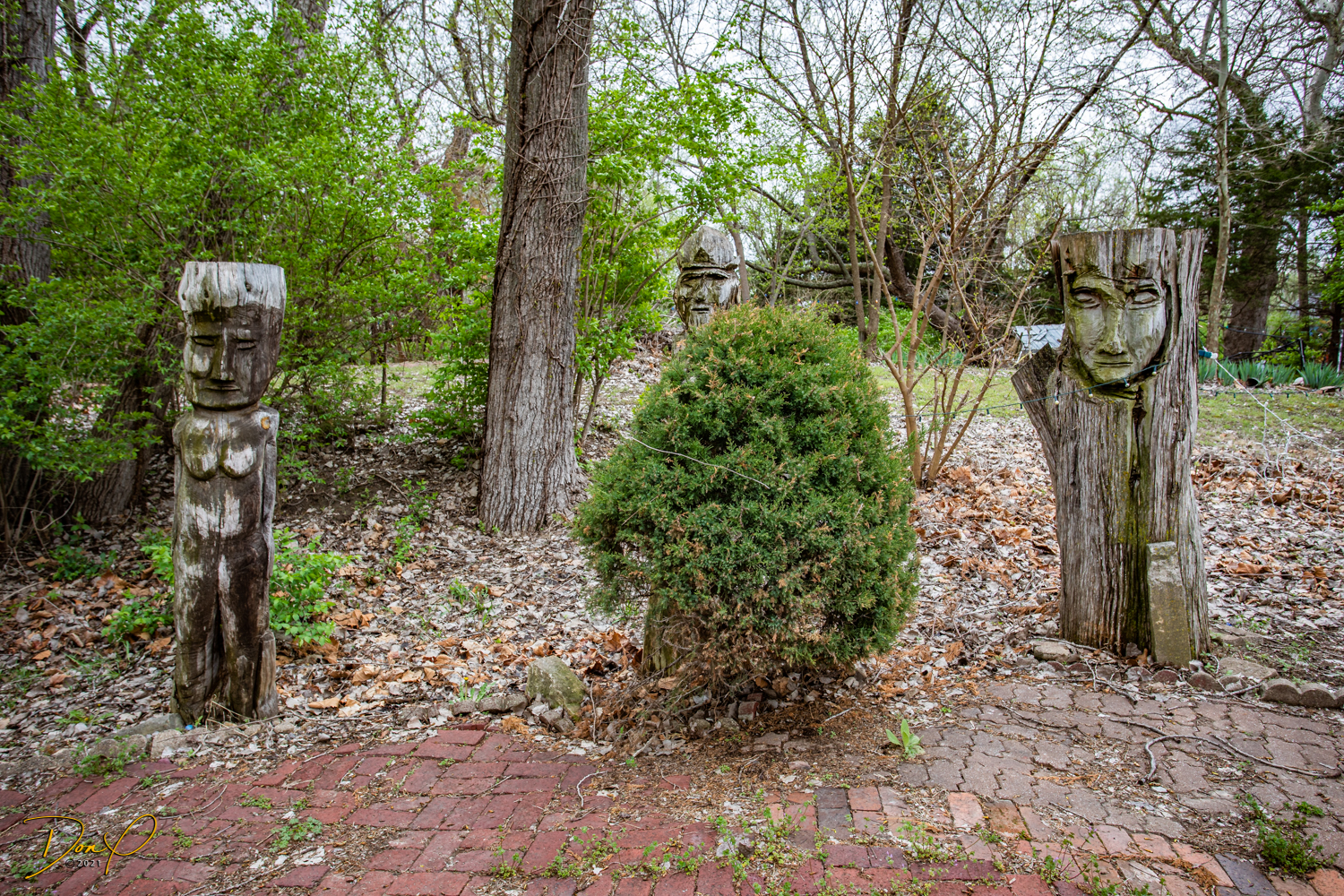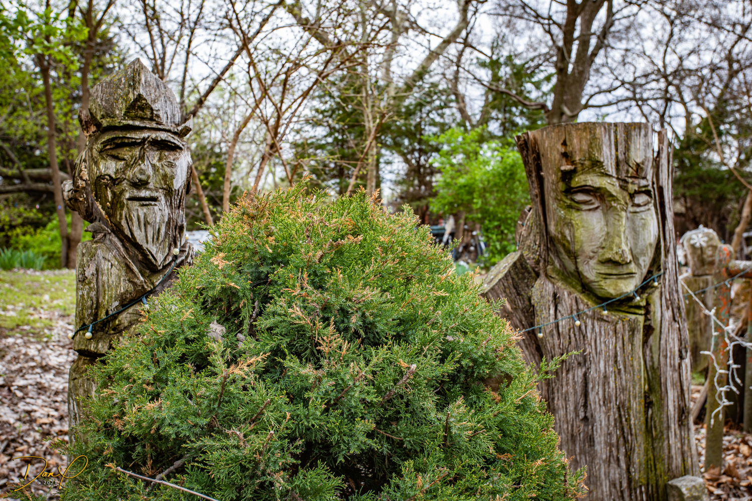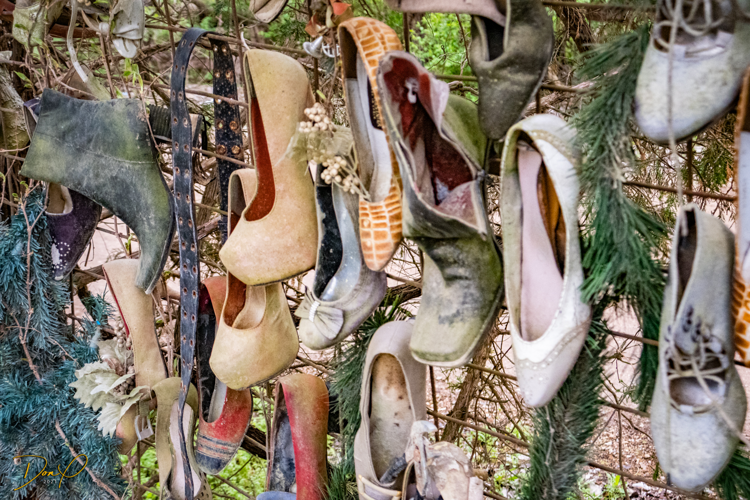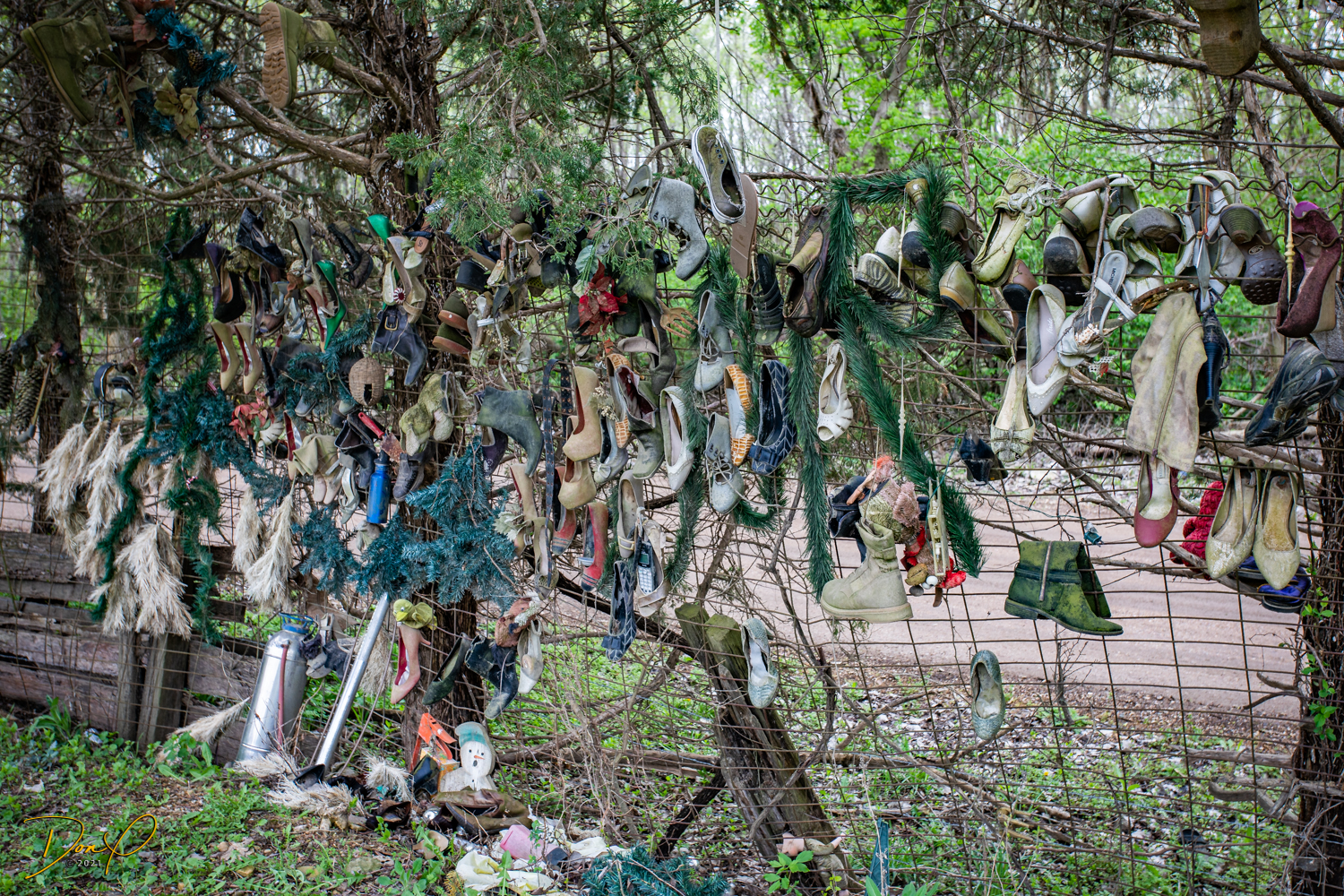 So we manage to turn the RV around at the end of a narrow dirt path and park outside of Truckhenge as the driveway appears to be too narrow to navigate our Beast into. We walk into the property and don’t see anyone. So we browse around and don’t make any effort to hide our presence. Sure enough, after 5 minutes, and older man with a full scraggly beard comes out and makes his presence known as the owner. He is pleasant and jovial and begins regaling us with stories of his past and how he came about creating his art, which includes chain saw carvings, junk turned into art, exhibits named “Boathenge, Truckhenge, Carhenge”, etc. I dub some of his displays, “Bottlehenge”, “Bicycle Tree”, among others including a “Shoe Fence”. This man talks 3-5 times faster than normal. The words fly out of his mouth! I can only understand a little of what he says but Elee understands most of it, LOL. She says it’s because she is from New York! He invites us to return with our own spray paint cans and to decorate his displays any way we like! Reminds us totally of “Cadillac Ranch” in Texas that we visited a few years back. We even spot 3 beautiful Peacocks wandering the property and one of them even preens its feathers for me!