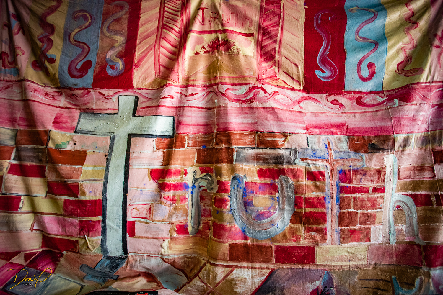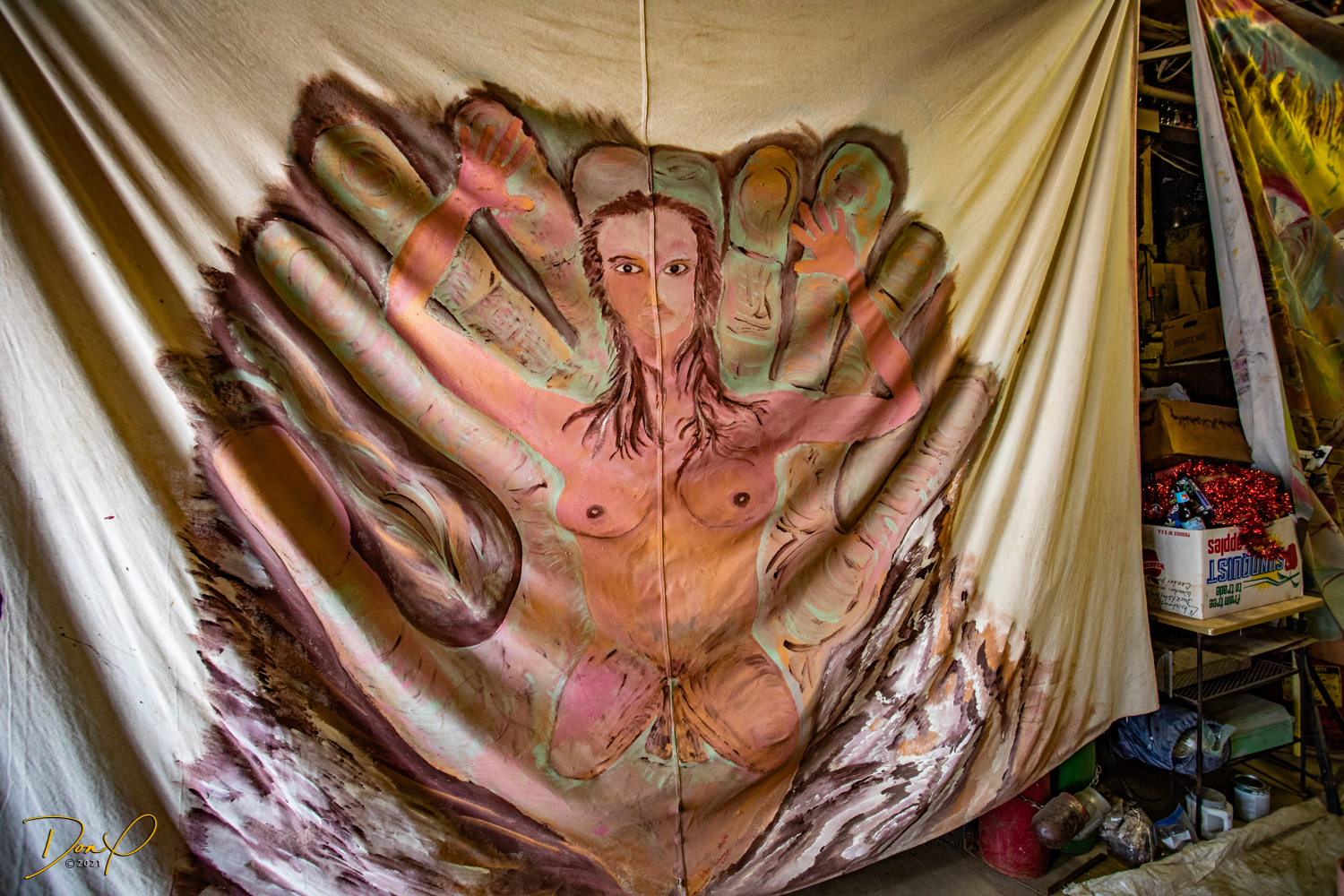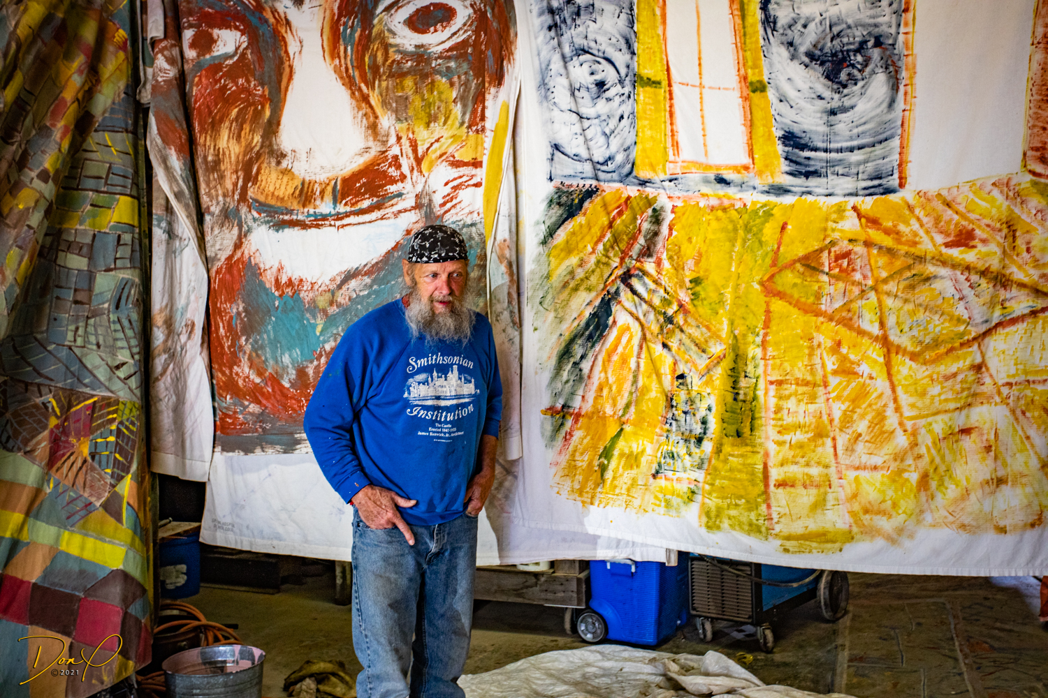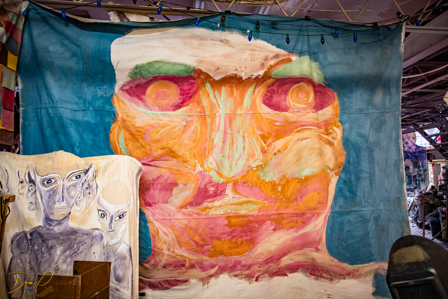 Then, when we are finished visiting his outdoor displays, he invites us inside to see his “Gallery”. This consists of bedsheets painted with amazingly good portraits and other eclectic images! He even shows us his working elevator made out of a forklift rig. I look around and also see an elaborate array of wire cabling that looks like computer connections and CCV camera wiring! This guy is as eclectic as they come (some might call him “Crazy as a Loon”!), but it is clear that he has made his own way of living! A lot of the property looked like a junkyard, but there was evidence of talent everywhere!