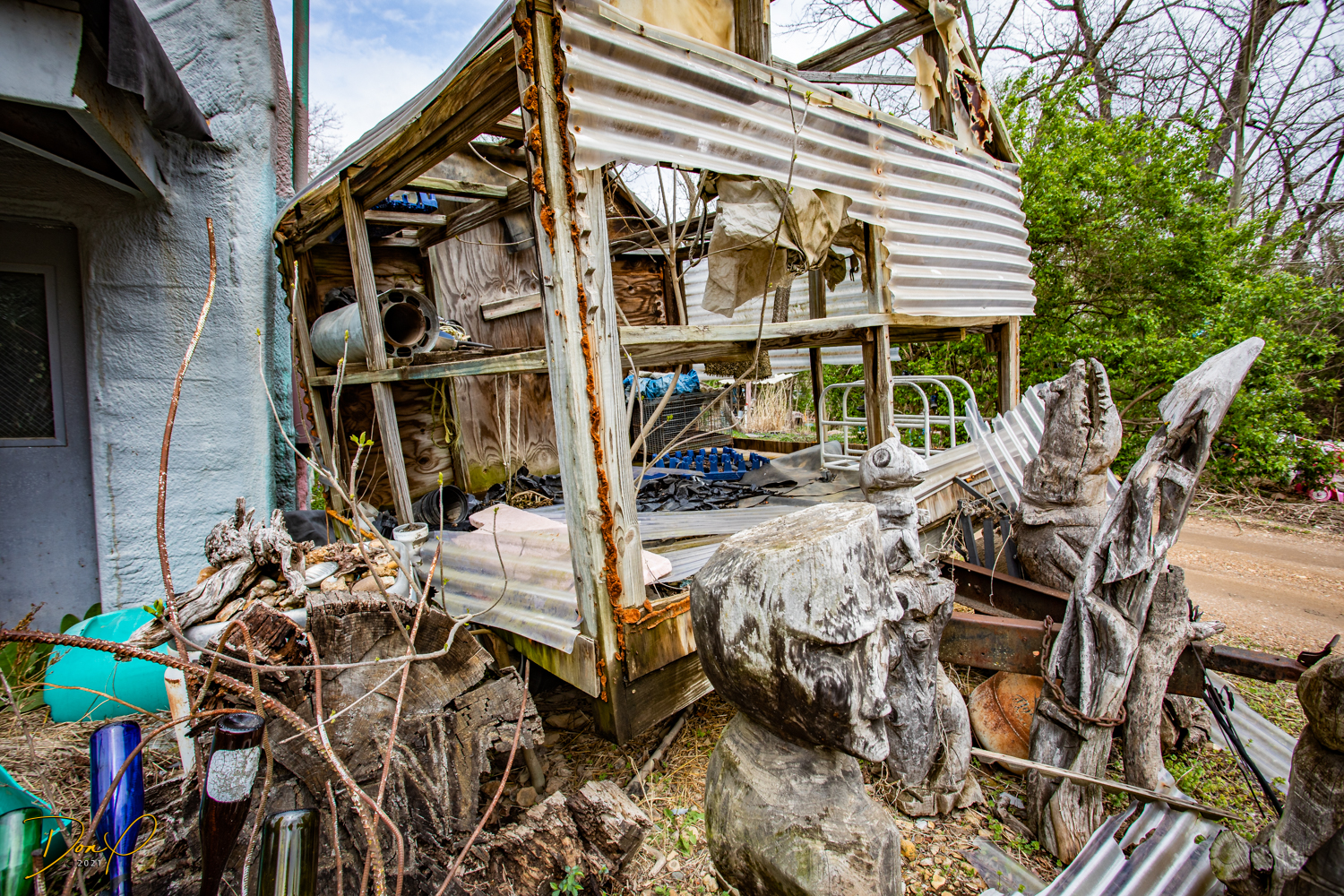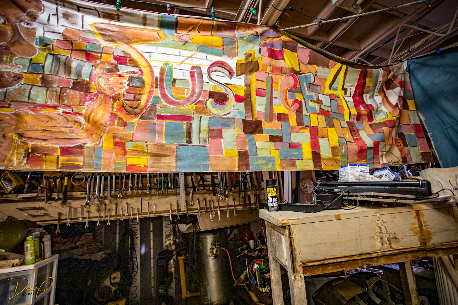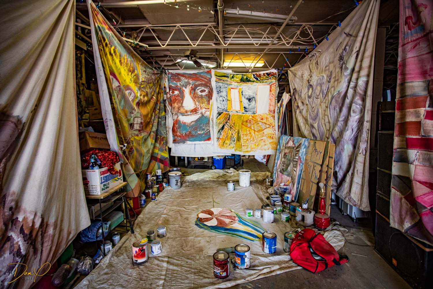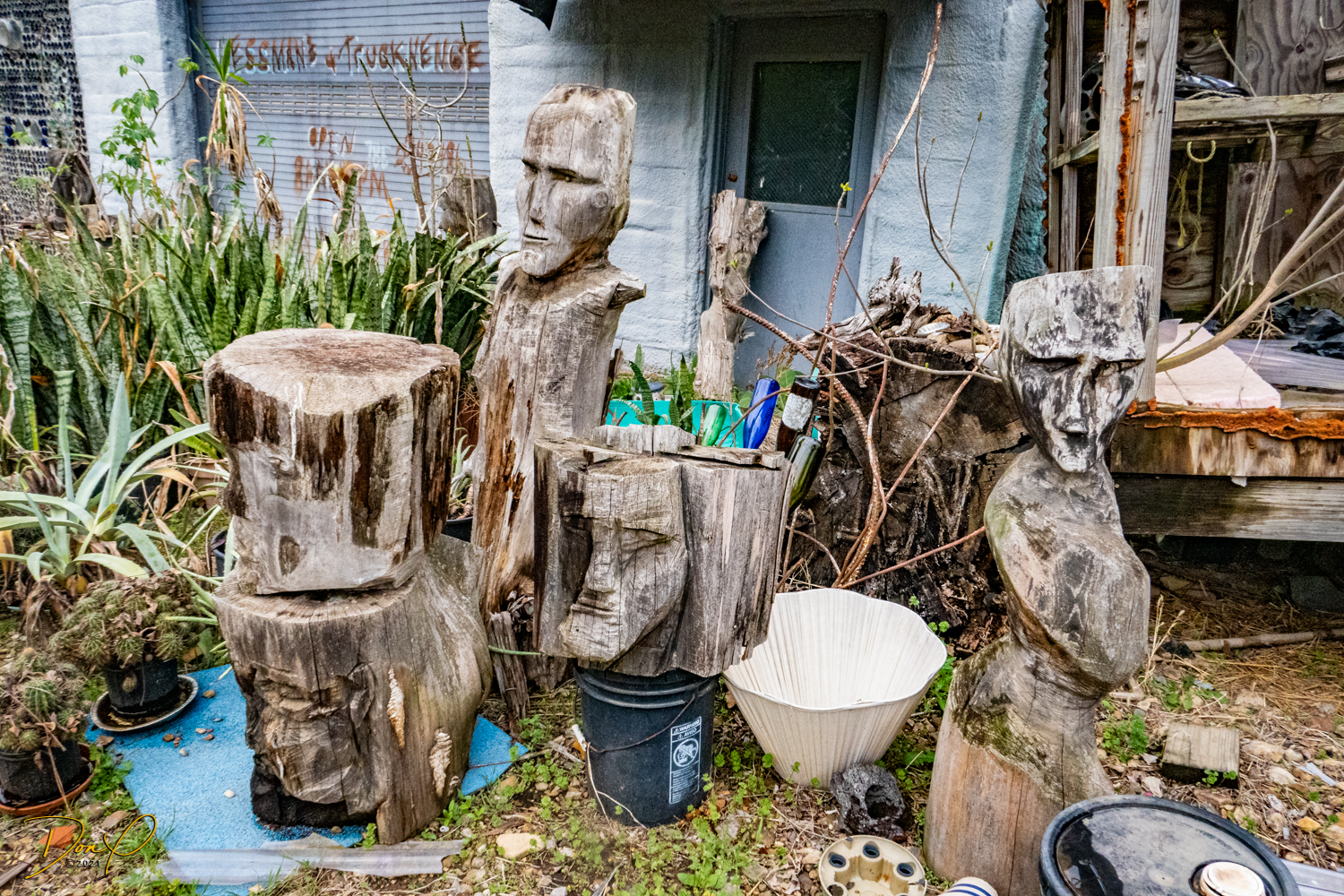 Then, when we are finished visiting his outdoor displays, he invites us inside to see his “Gallery”. This consists of bedsheets painted with amazingly good portraits and other eclectic images! He even shows us his working elevator made out of a forklift rig. I look around and also see an elaborate array of wire cabling that looks like computer connections and CCV camera wiring! This guy is as eclectic as they come (some might call him “Crazy as a Loon”!), but it is clear that he has made his own way of living! A lot of the property looked like a junkyard, but there was evidence of talent everywhere!