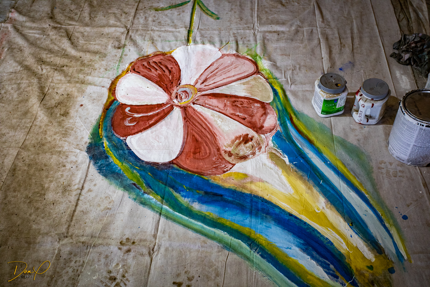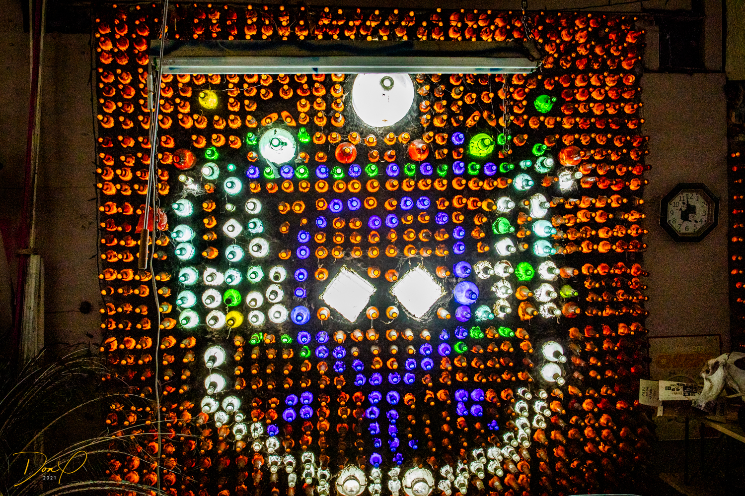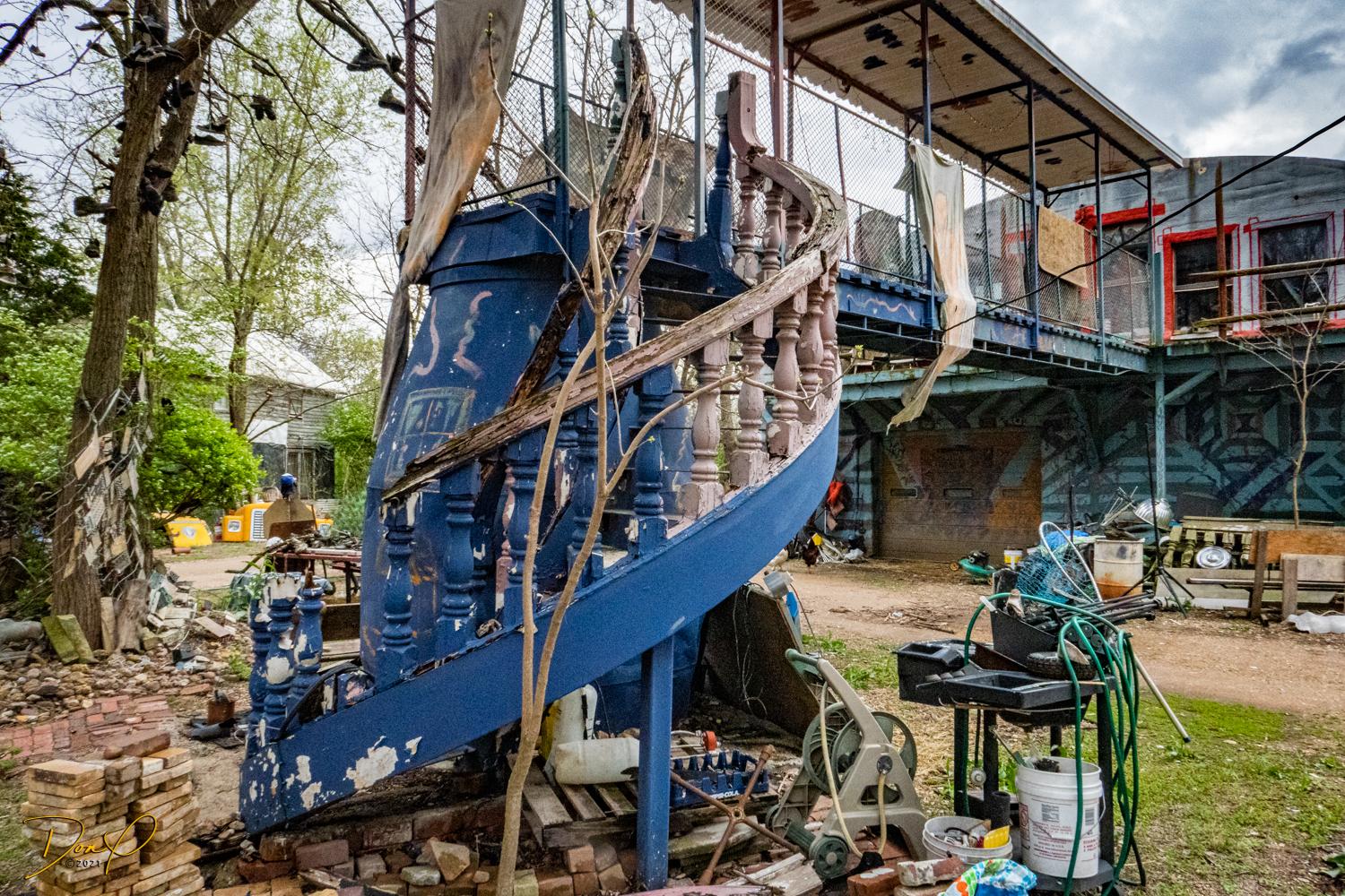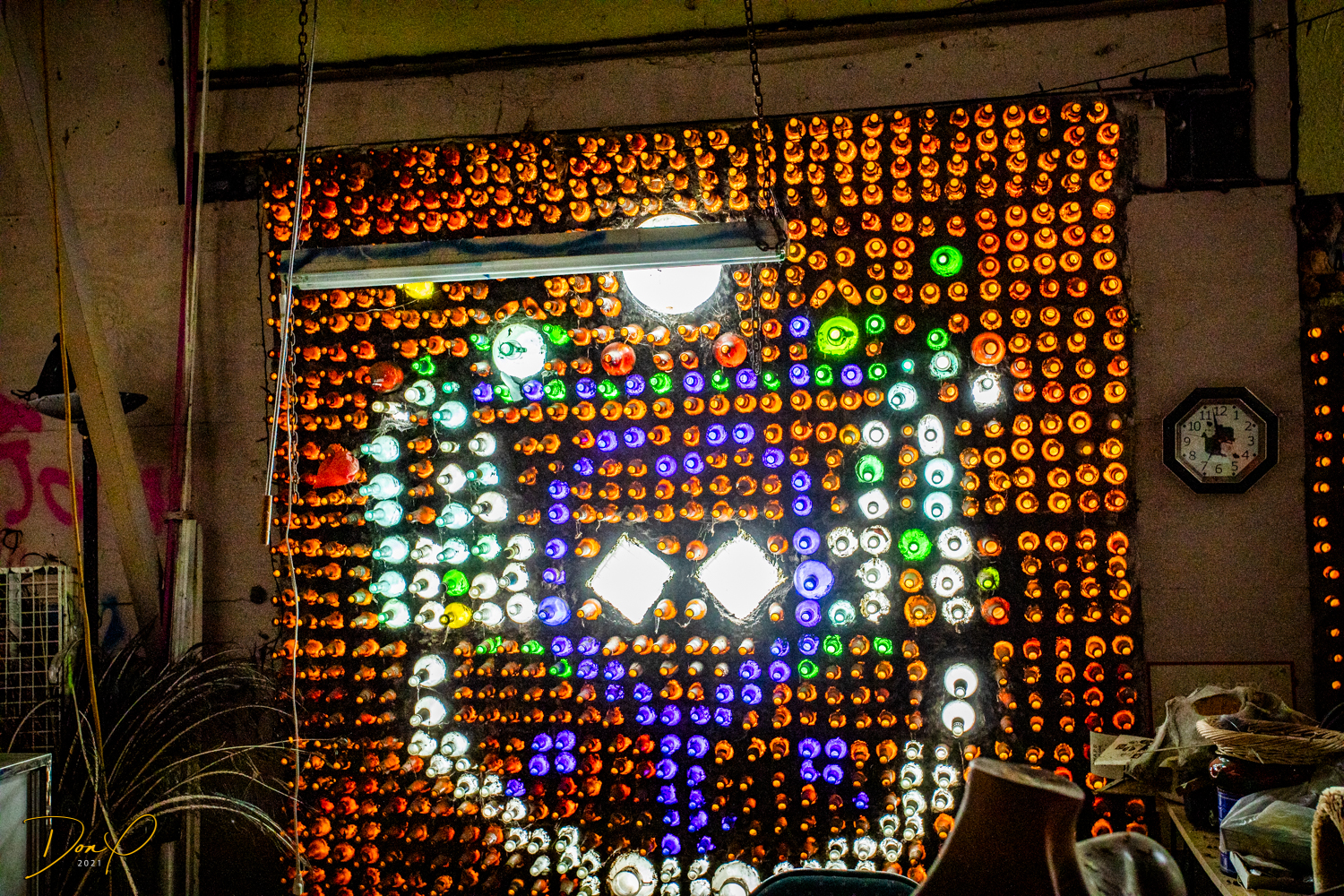 Then, when we are finished visiting his outdoor displays, he invites us inside to see his “Gallery”. This consists of bedsheets painted with amazingly good portraits and other eclectic images! He even shows us his working elevator made out of a forklift rig. I look around and also see an elaborate array of wire cabling that looks like computer connections and CCV camera wiring! This guy is as eclectic as they come (some might call him “Crazy as a Loon”!), but it is clear that he has made his own way of living! A lot of the property looked like a junkyard, but there was evidence of talent everywhere!