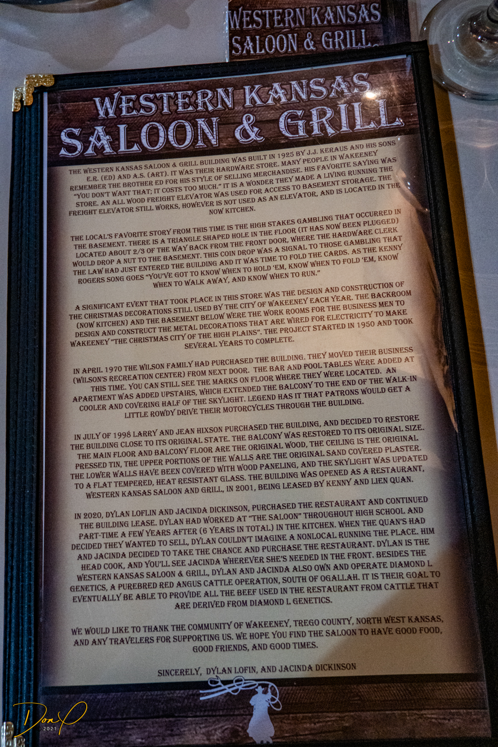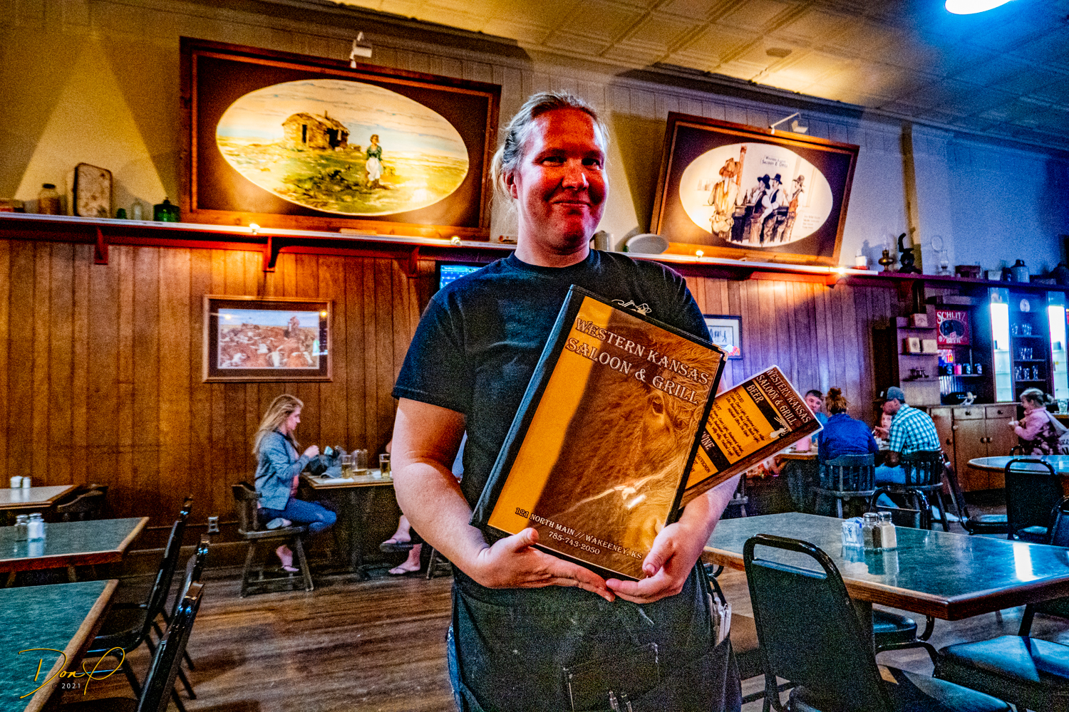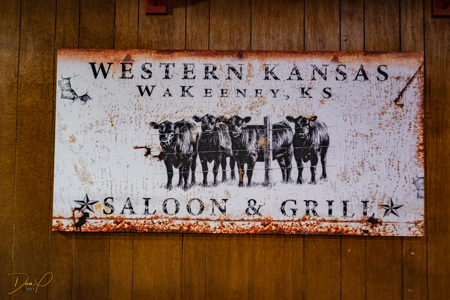 We drive on towards Wakeeney, Kansas, out destination for the night. We arrive at sunset and check into our spot in a KOA Campground. Then we head out to find dinner at a restaurant Elee found earlier, named, “Western Kansas Saloon & Grill”. What an appropriate name for a steak house in Western Kansas! Turns out we are waited on by the owner herself! What a sweet lady, Jacinda! (I apologize for the horrible lighting on your face Jacinda!) She is old enough to easily be our daughter! We converse and kibitz with her and she serves us a marvelous dinner of Kansas Strip Steak and Prime Rib! Life is good! They tell a story of olden days where gambling was done in the basement! There was a small hole in the floor where someone would drop a walnut into the basement whenever the Law walked in as a reminder to pack up the gambling! If you ever make it to Wakeeney, Kansas, this should be the top of your list for dinner!