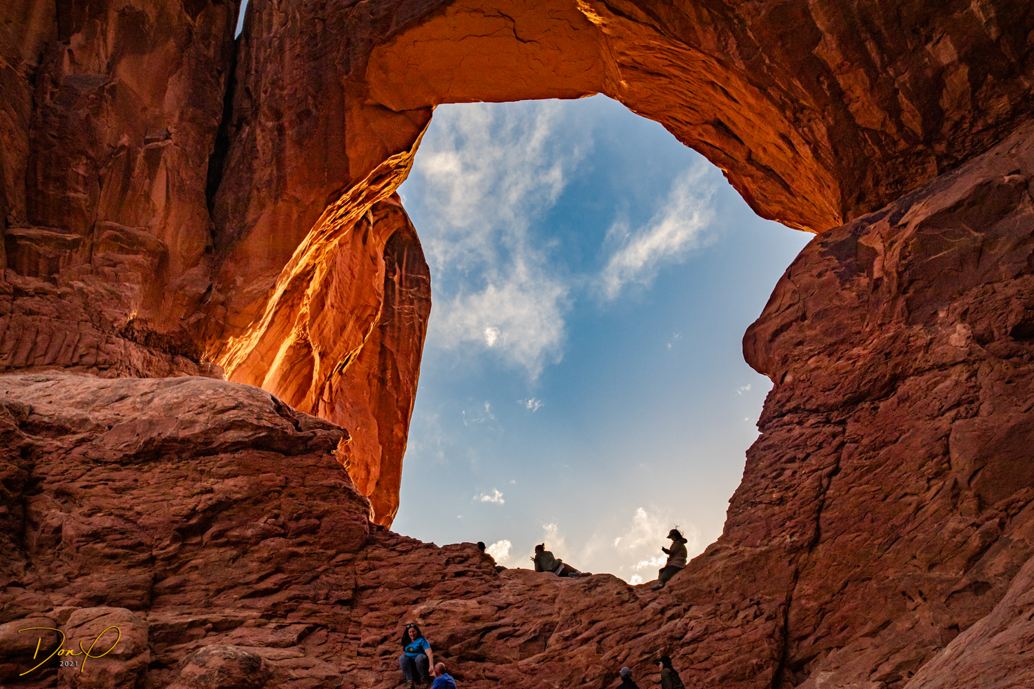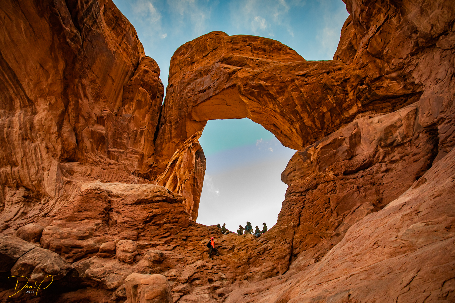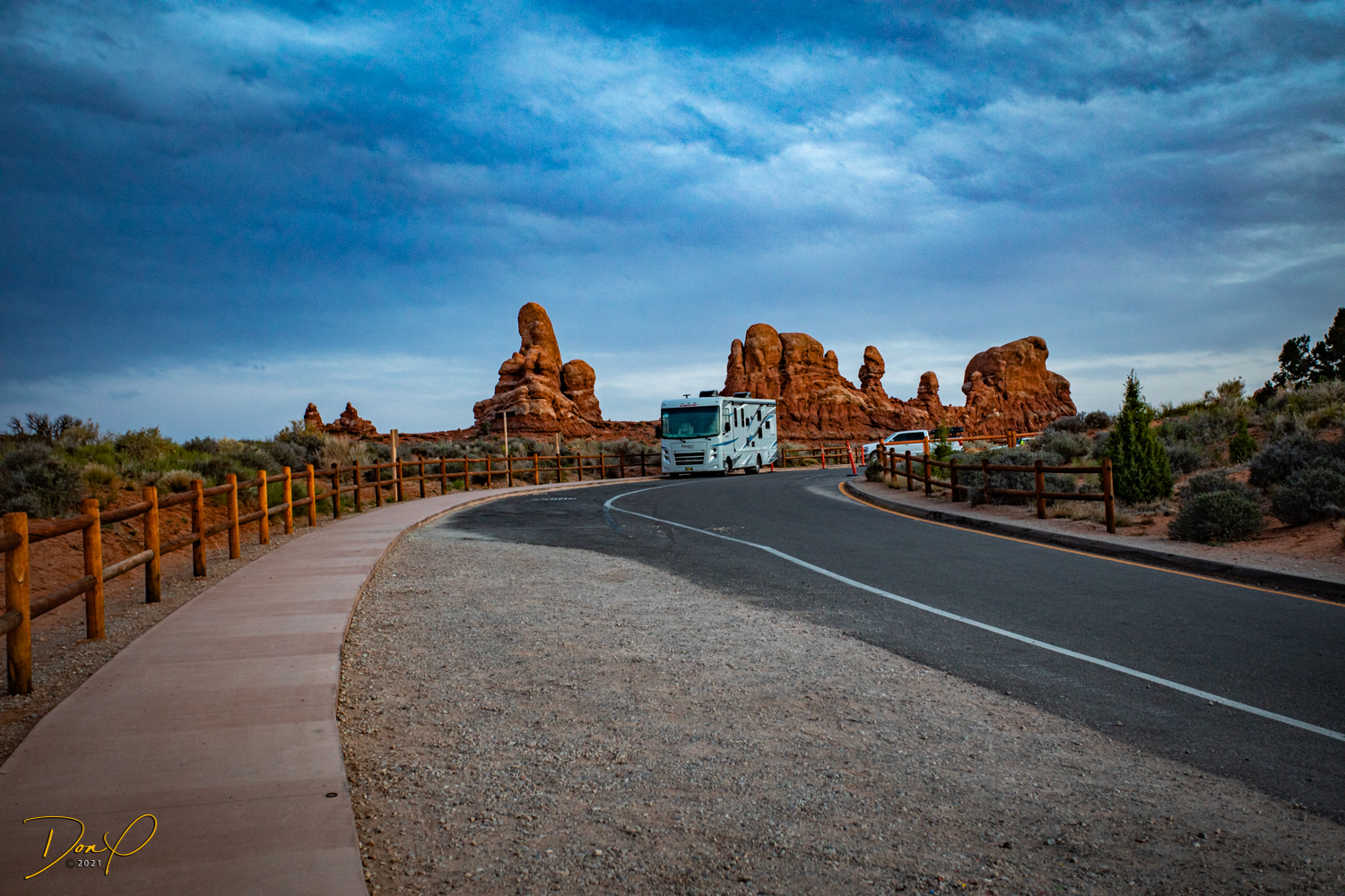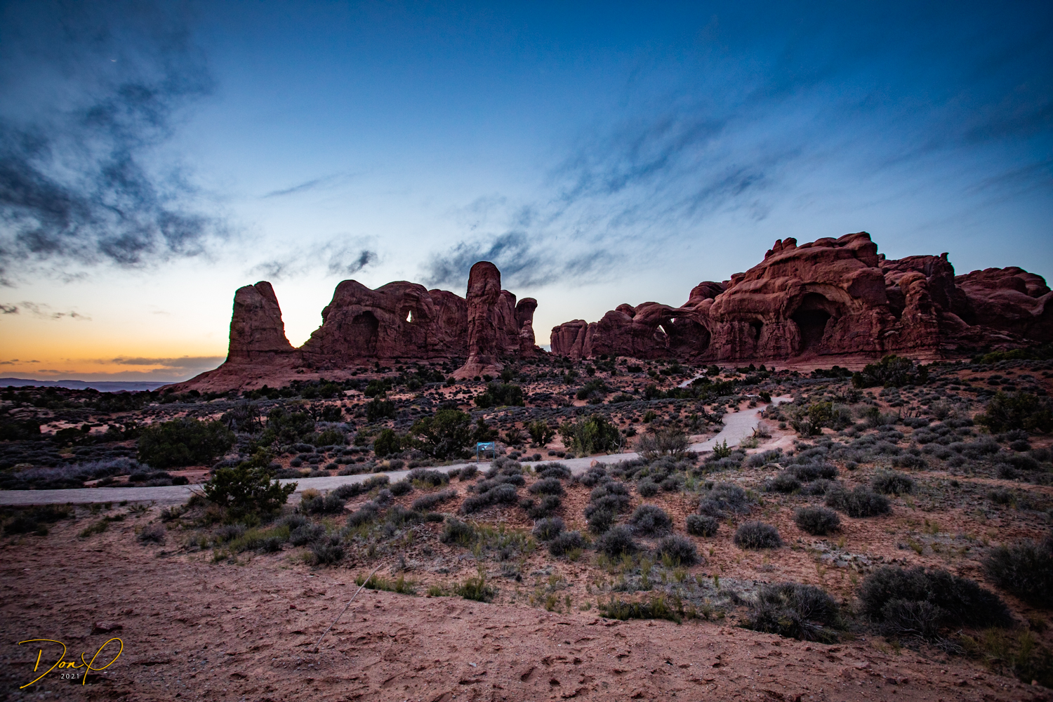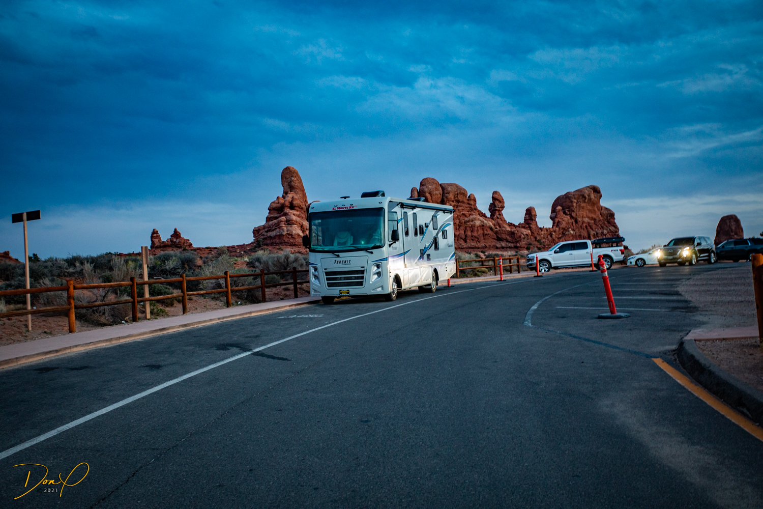 We photograph the area and get back in the RV. It is late afternoon and we leave the Park and head into Moab, just a few miles down the road. We find Moab Brewery and have an early dinner. Then we head back into Arches to try to catch a sunset. We stop at Window Arches and Double Arch and get some successful sunset shots along with what appears to be a Wedding Shoot!