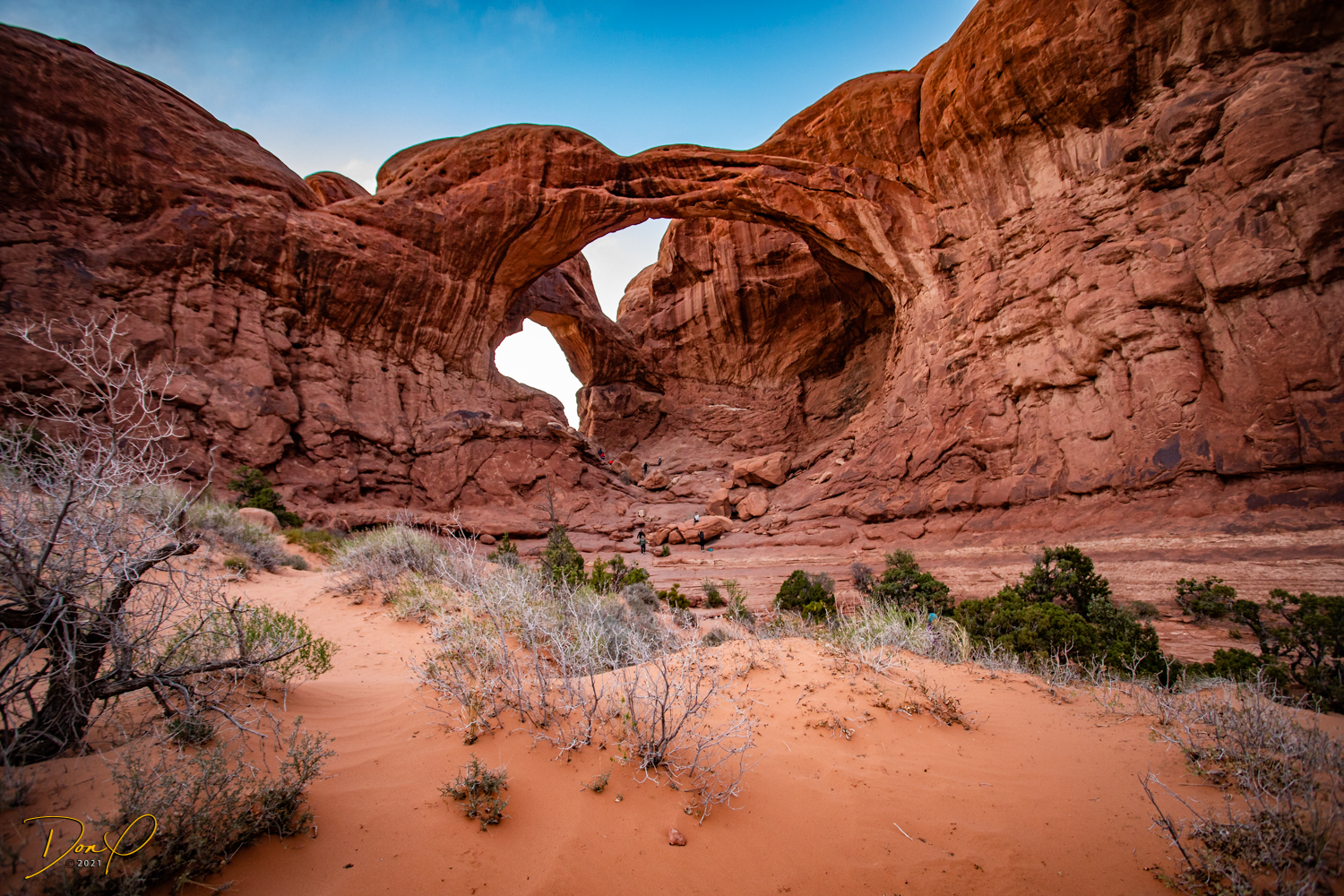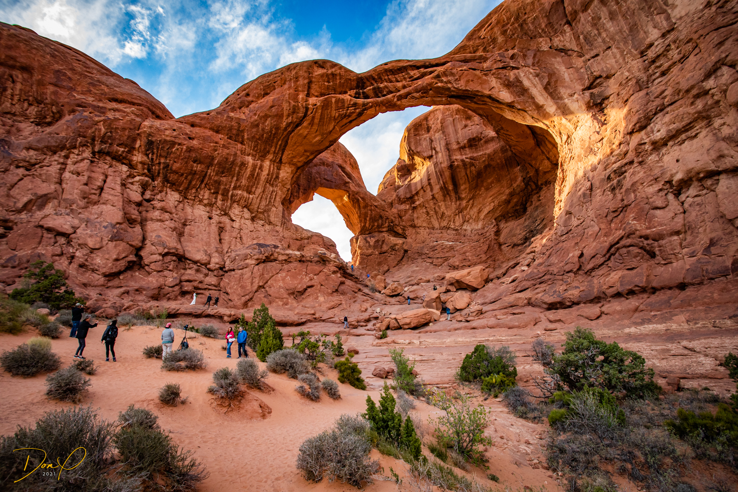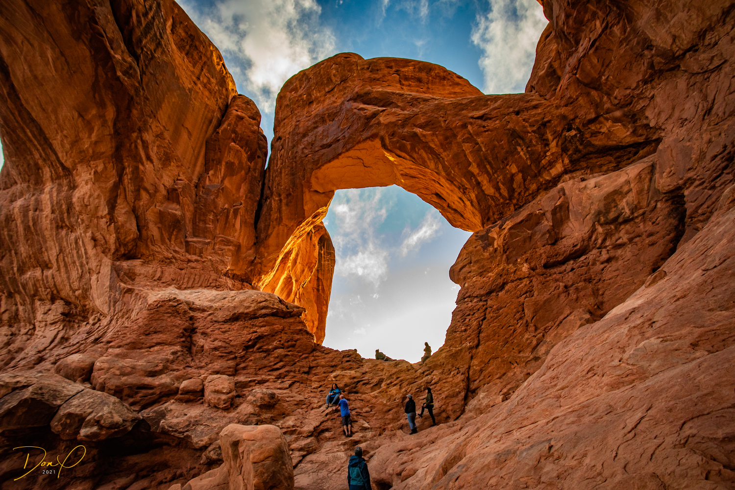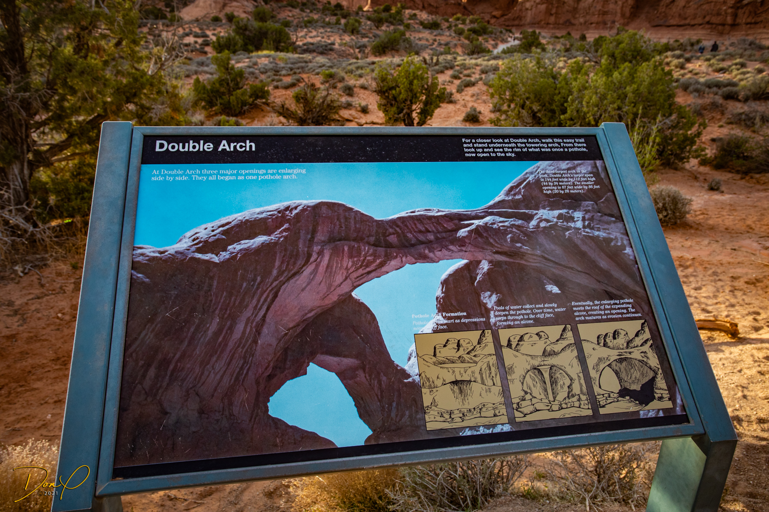 We photograph the area and get back in the RV. It is late afternoon and we leave the Park and head into Moab, just a few miles down the road. We find Moab Brewery and have an early dinner. Then we head back into Arches to try to catch a sunset. We stop at Window Arches and Double Arch and get some successful sunset shots along with what appears to be a Wedding Shoot!