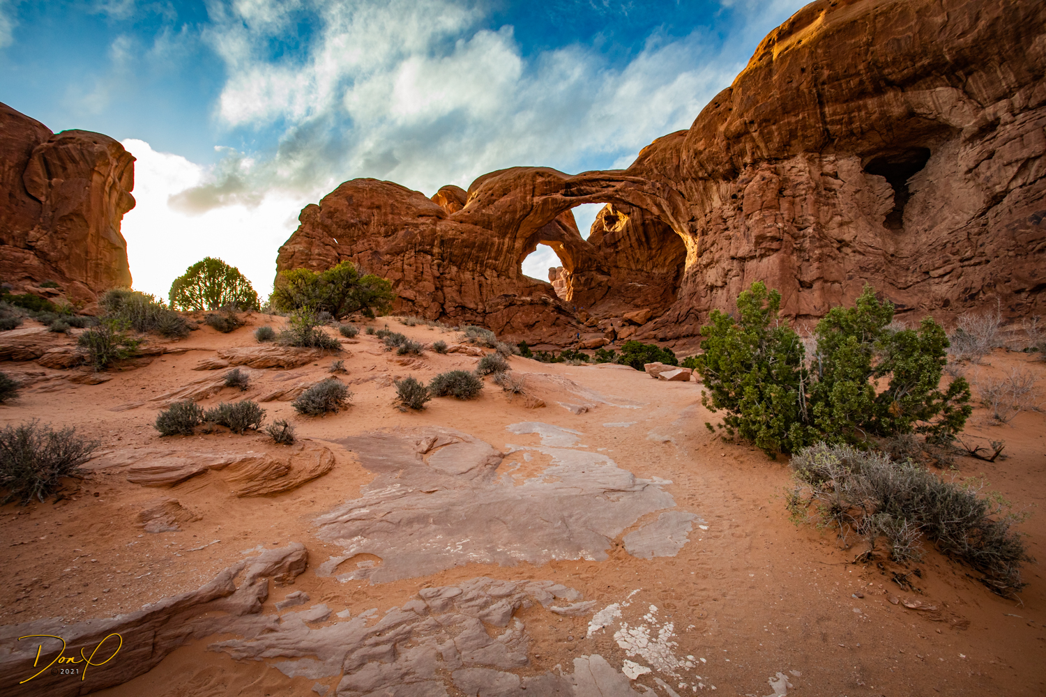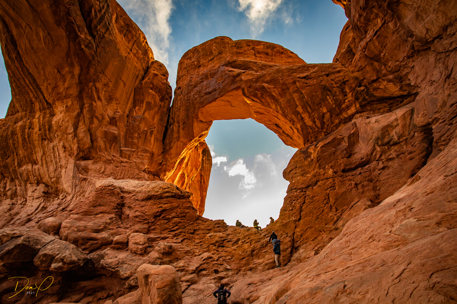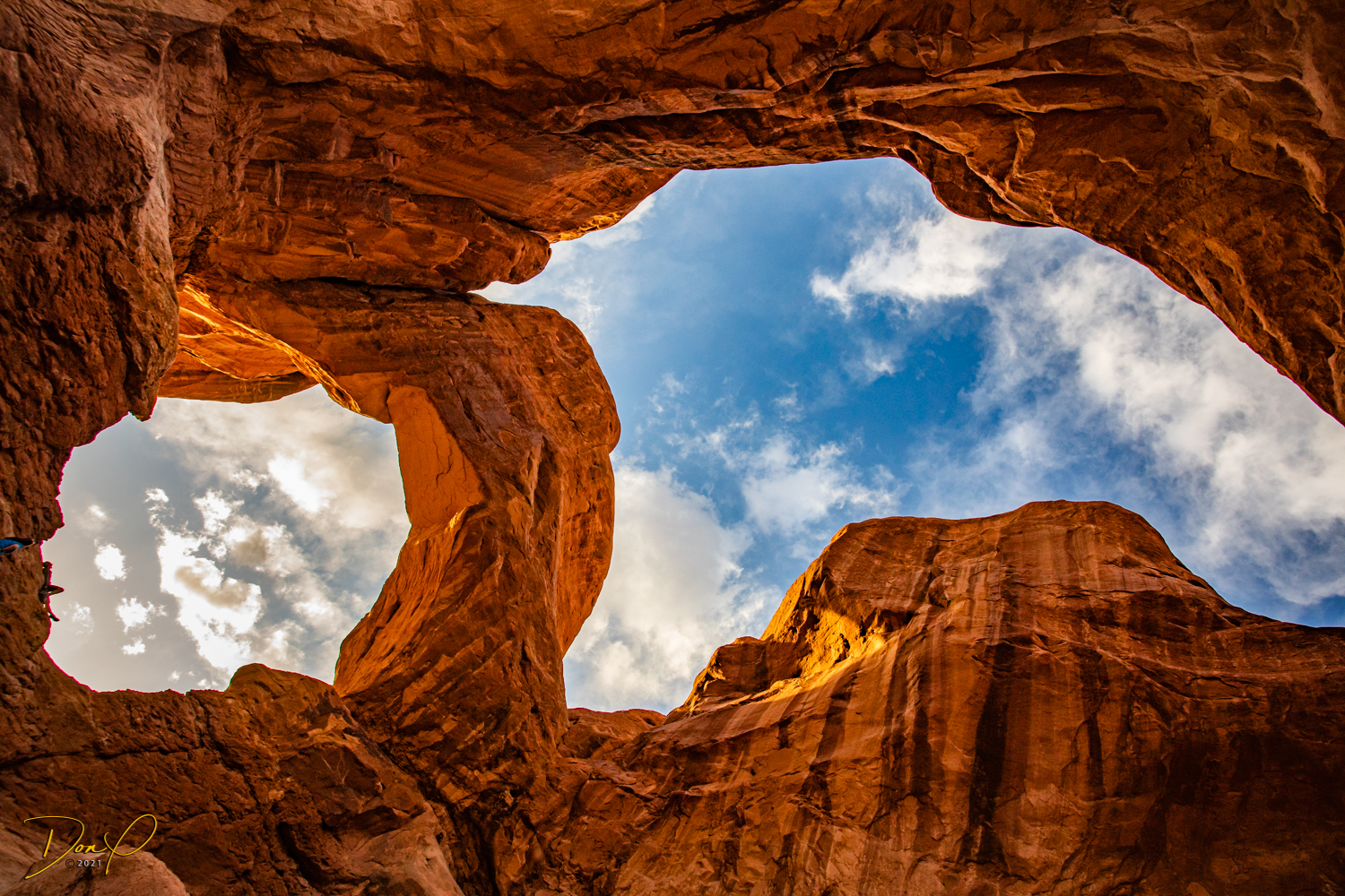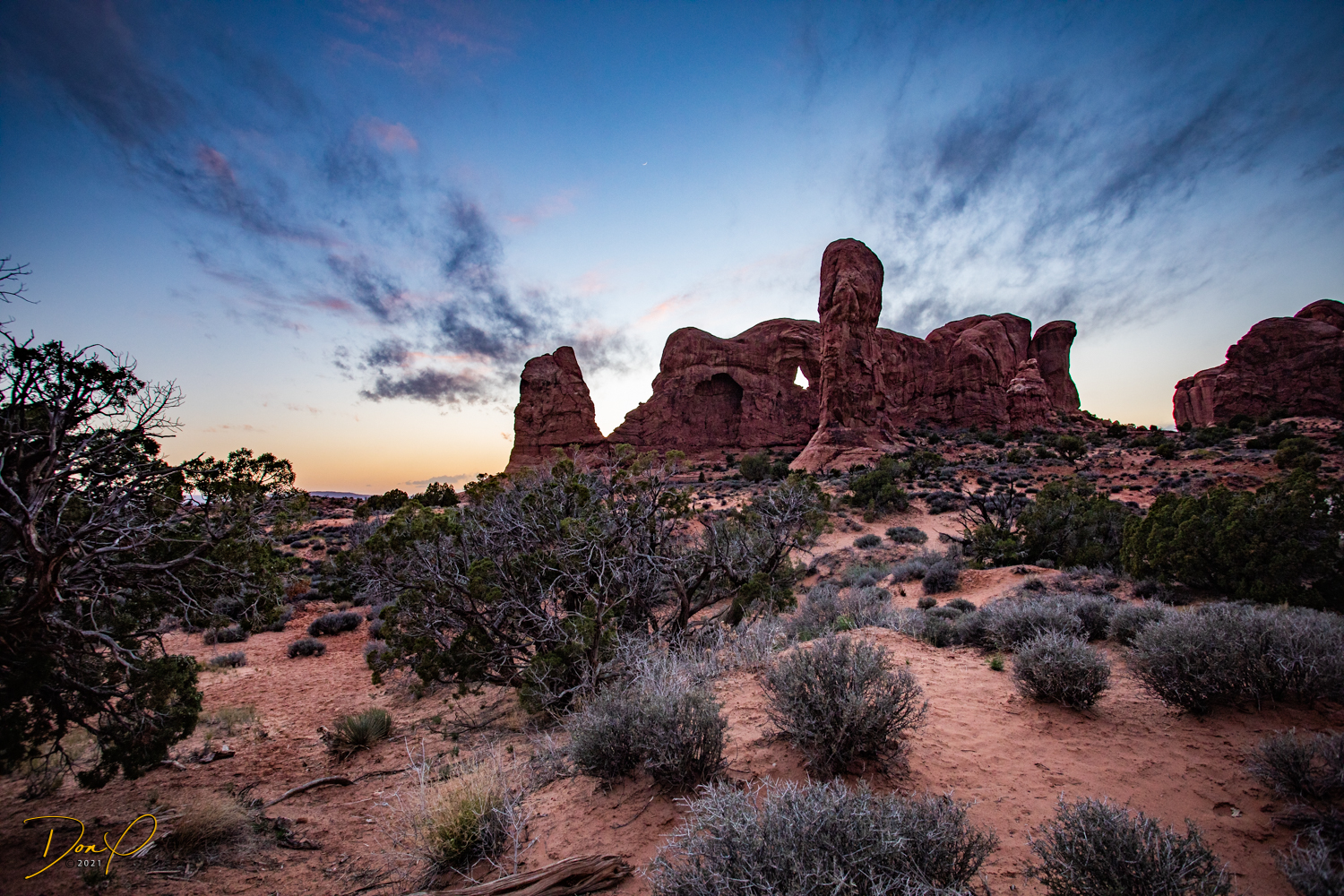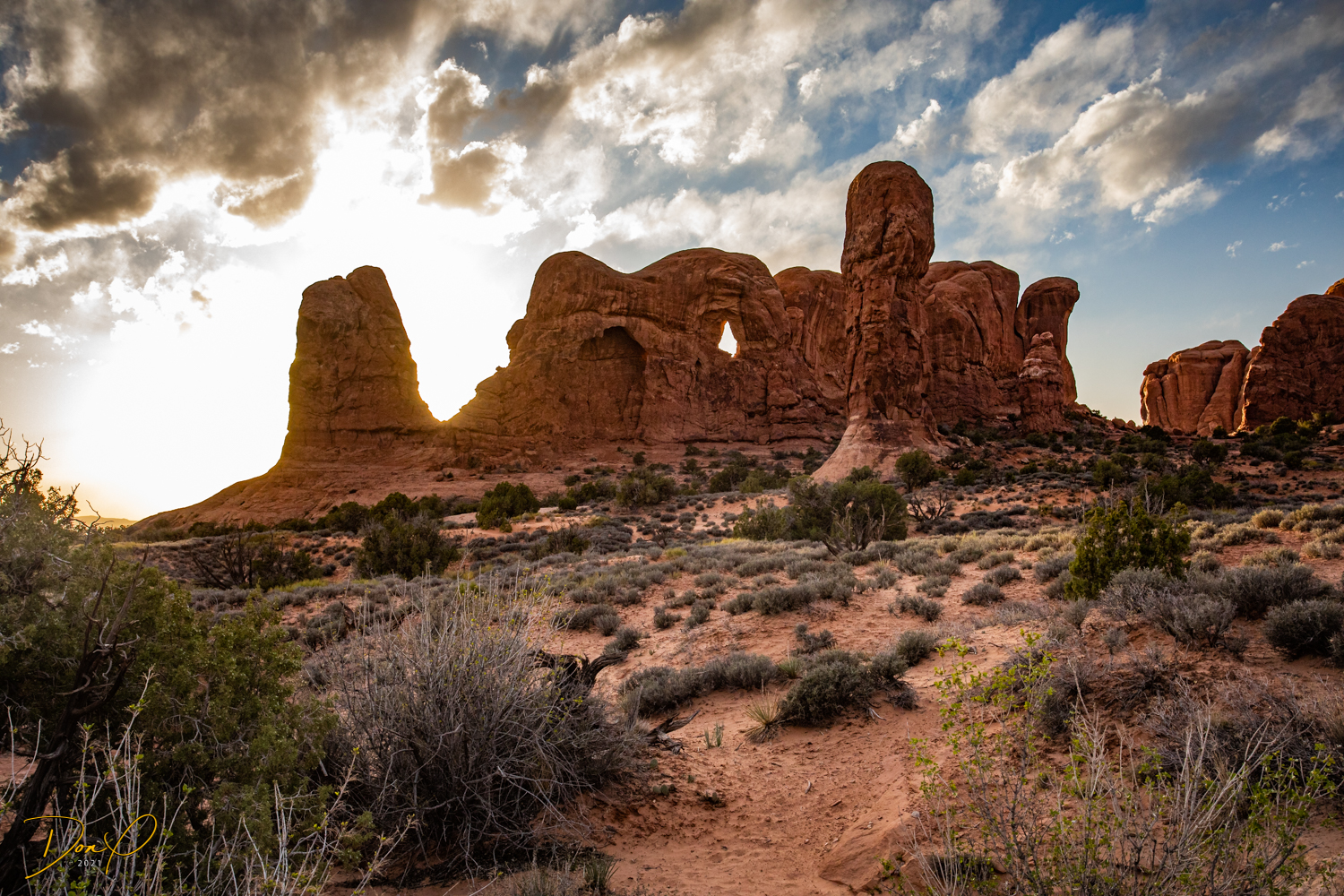 We photograph the area and get back in the RV. It is late afternoon and we leave the Park and head into Moab, just a few miles down the road. We find Moab Brewery and have an early dinner. Then we head back into Arches to try to catch a sunset. We stop at Window Arches and Double Arch and get some successful sunset shots along with what appears to be a Wedding Shoot!