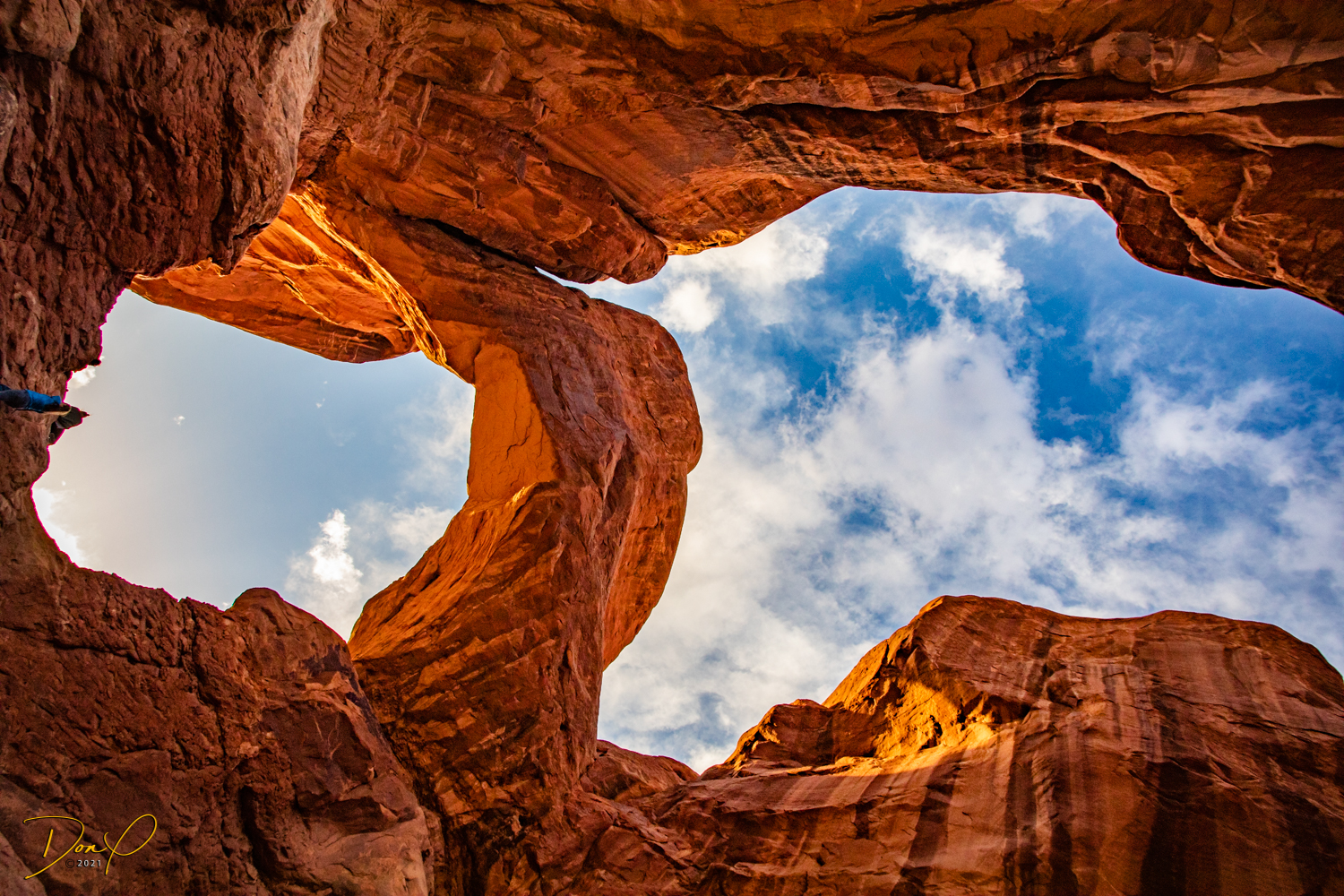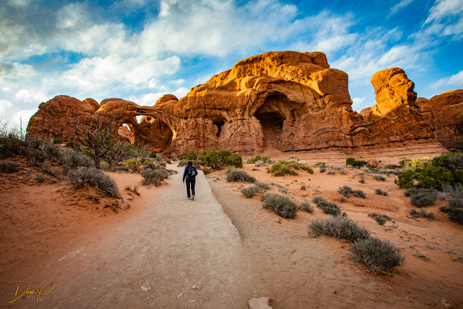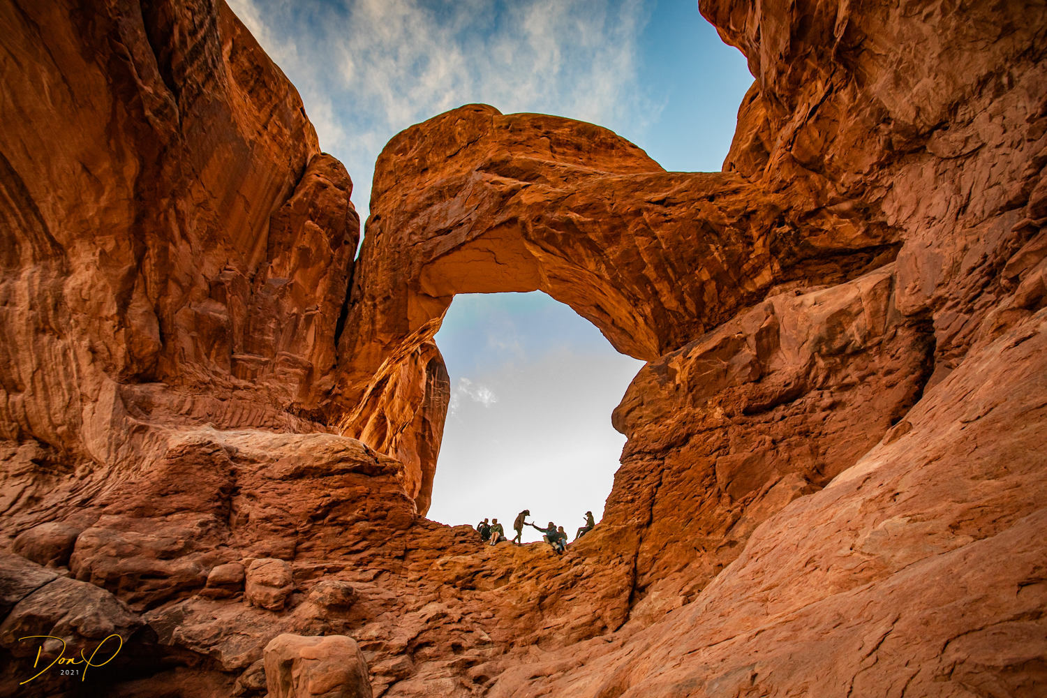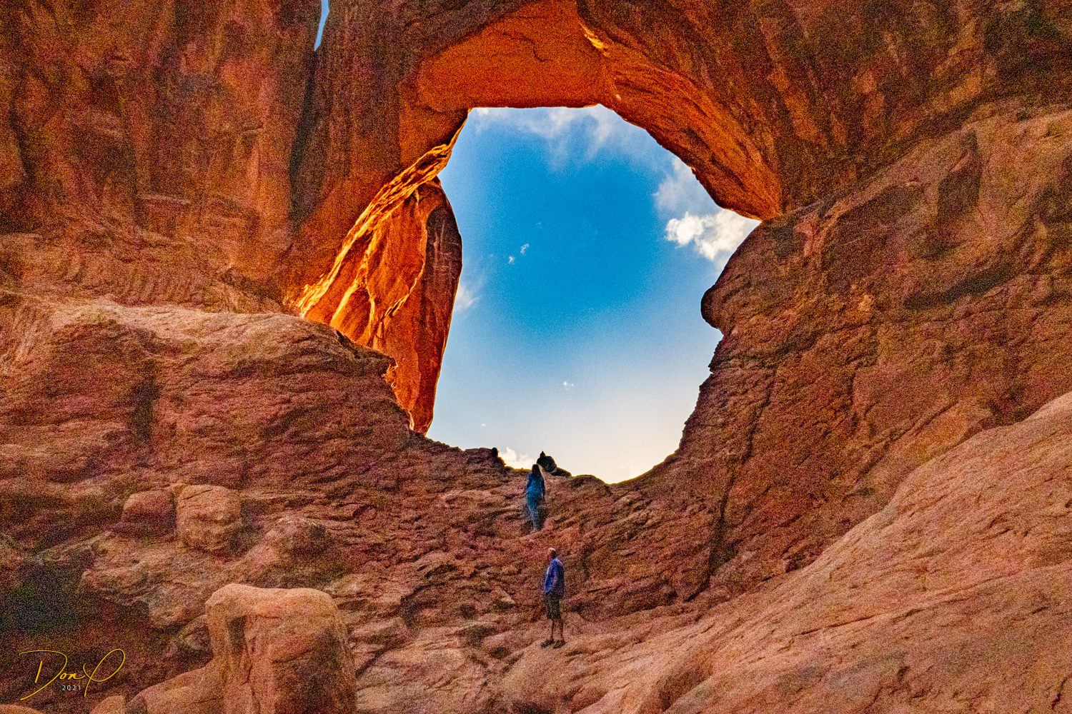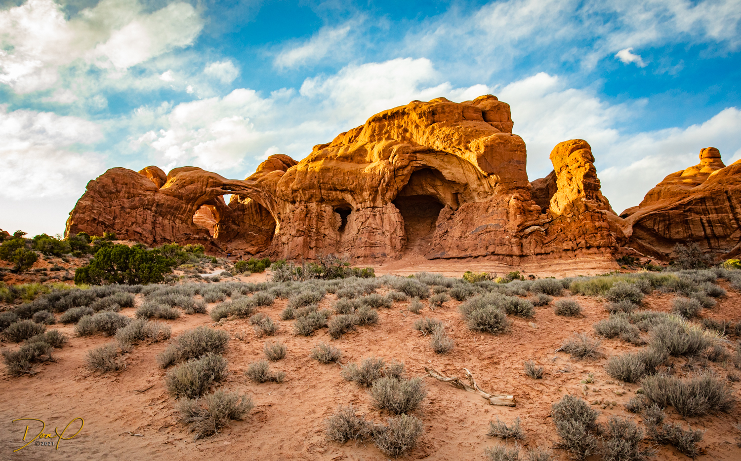 We photograph the area and get back in the RV. It is late afternoon and we leave the Park and head into Moab, just a few miles down the road. We find Moab Brewery and have an early dinner. Then we head back into Arches to try to catch a sunset. We stop at Window Arches and Double Arch and get some successful sunset shots along with what appears to be a Wedding Shoot!