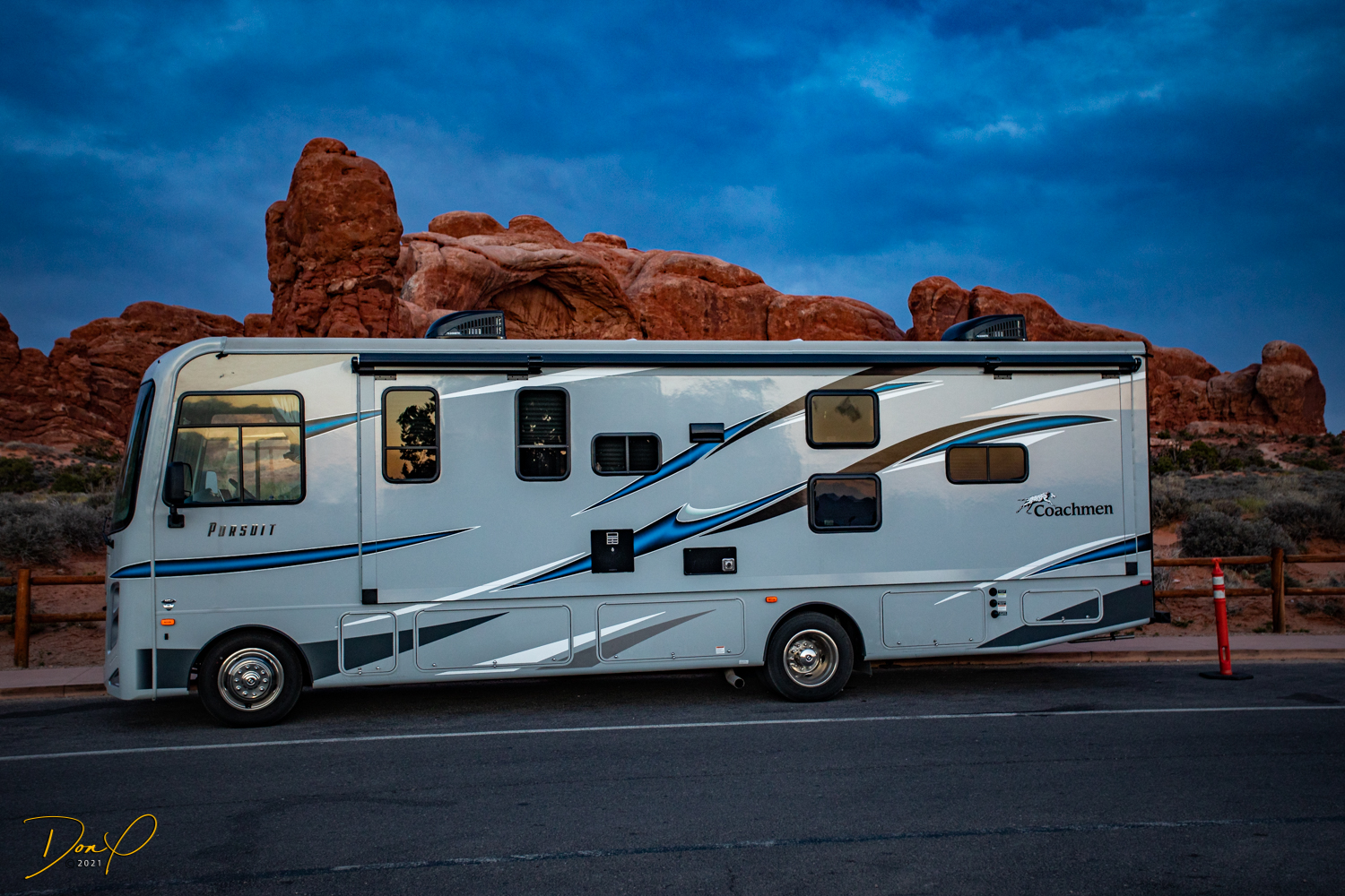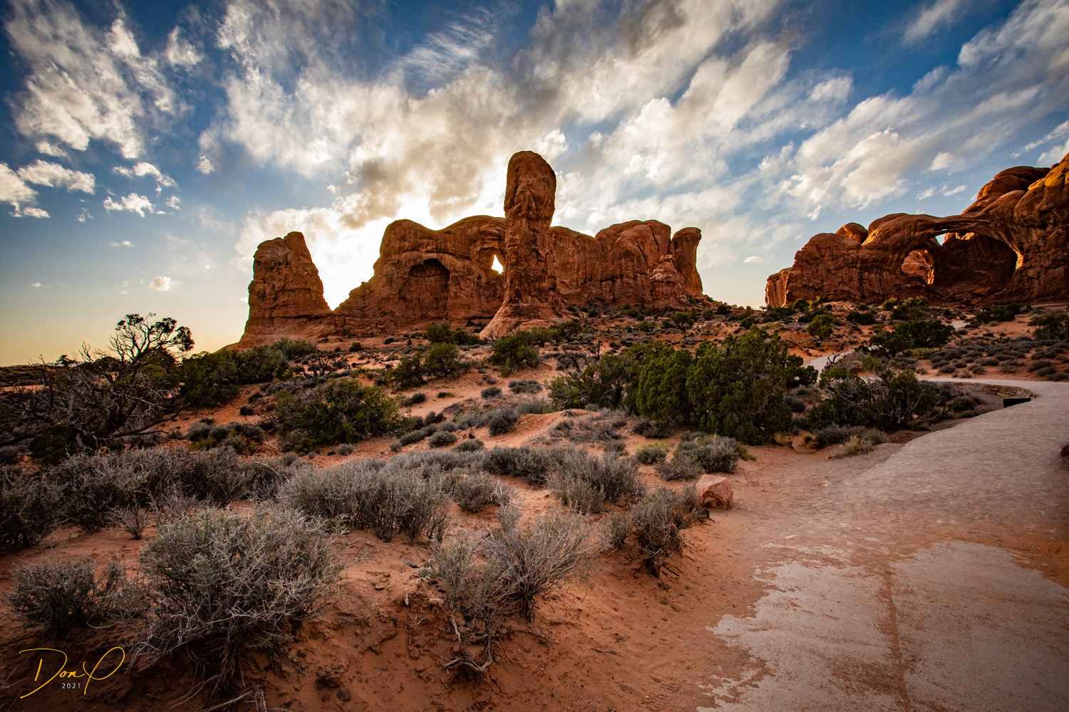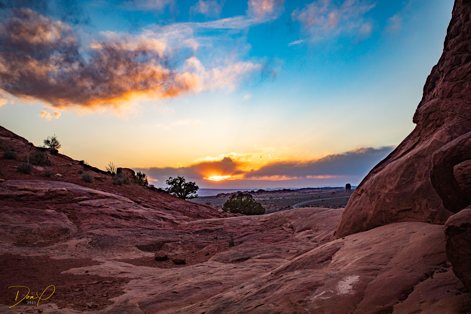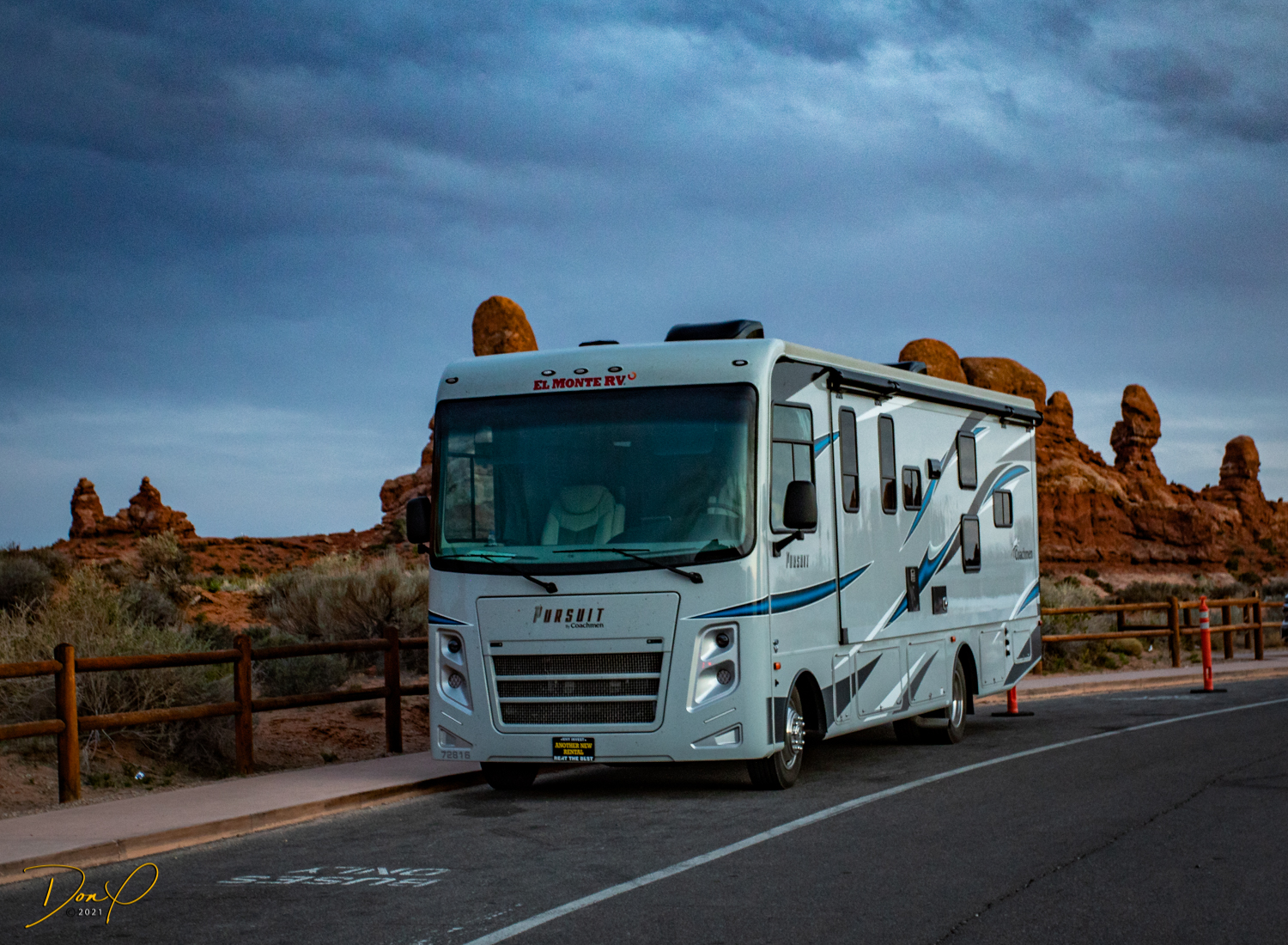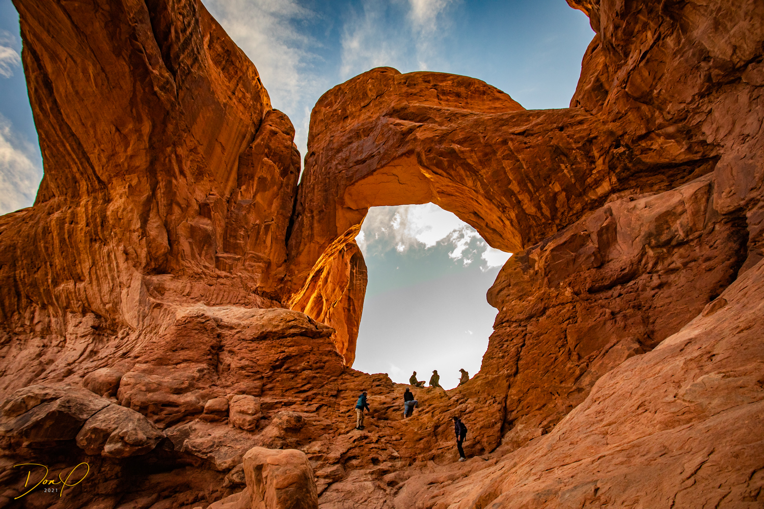 We photograph the area and get back in the RV. It is late afternoon and we leave the Park and head into Moab, just a few miles down the road. We find Moab Brewery and have an early dinner. Then we head back into Arches to try to catch a sunset. We stop at Window Arches and Double Arch and get some successful sunset shots along with what appears to be a Wedding Shoot!