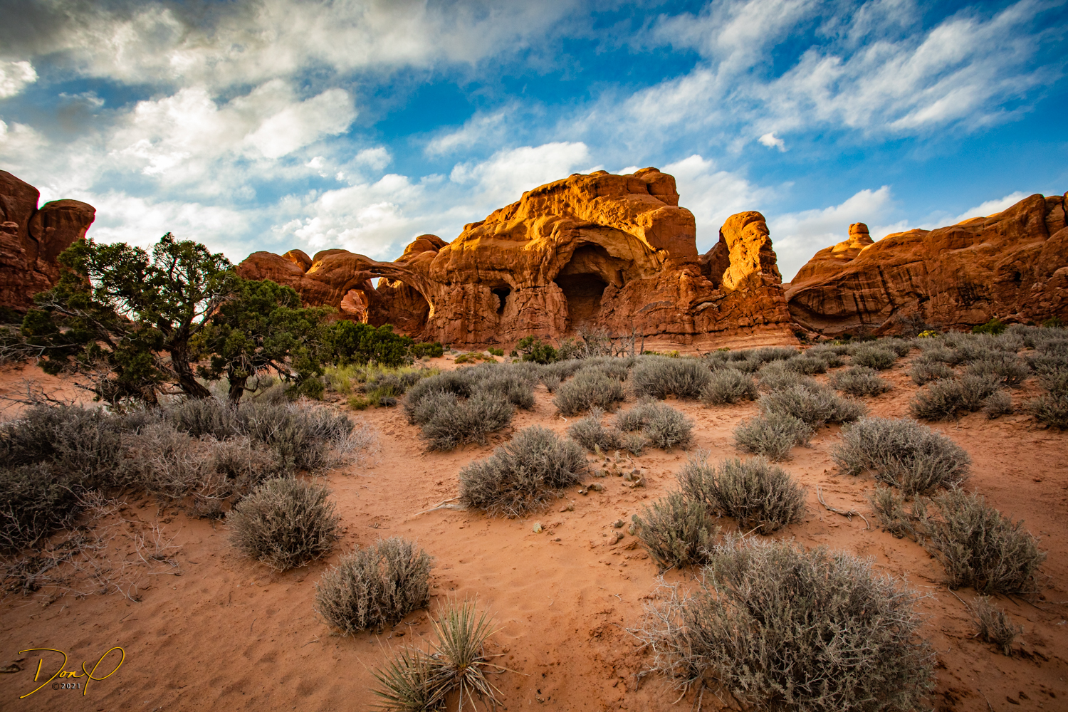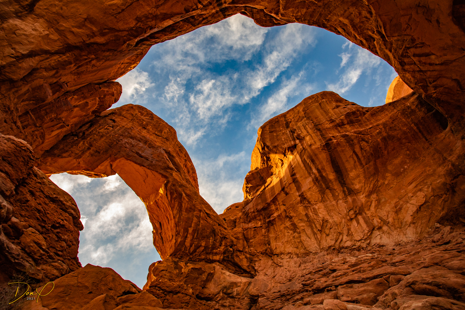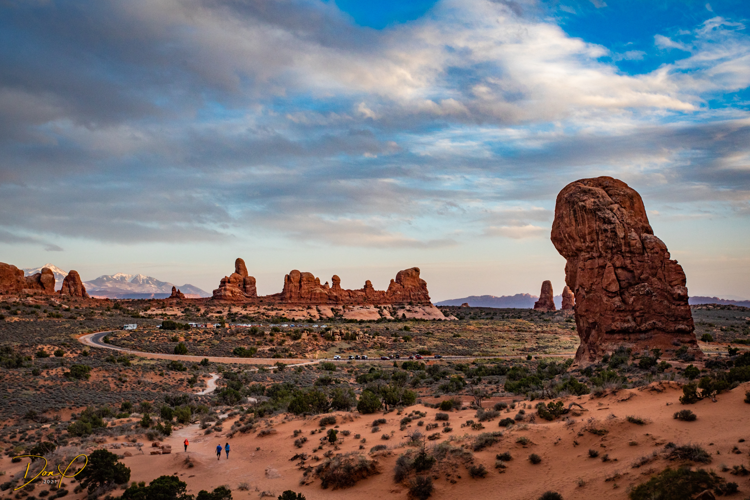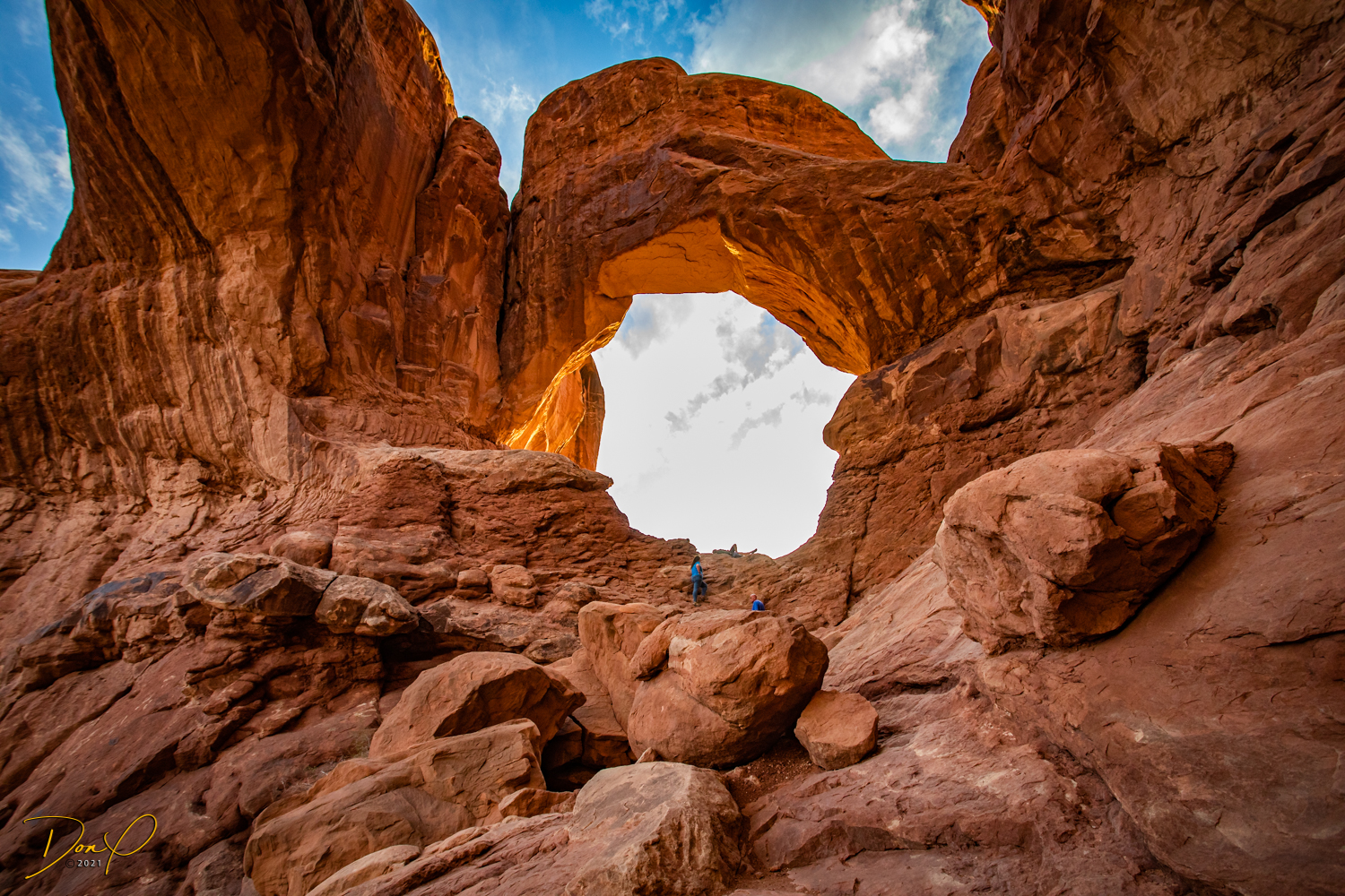 We photograph the area and get back in the RV. It is late afternoon and we leave the Park and head into Moab, just a few miles down the road. We find Moab Brewery and have an early dinner. Then we head back into Arches to try to catch a sunset. We stop at Window Arches and Double Arch and get some successful sunset shots along with what appears to be a Wedding Shoot!