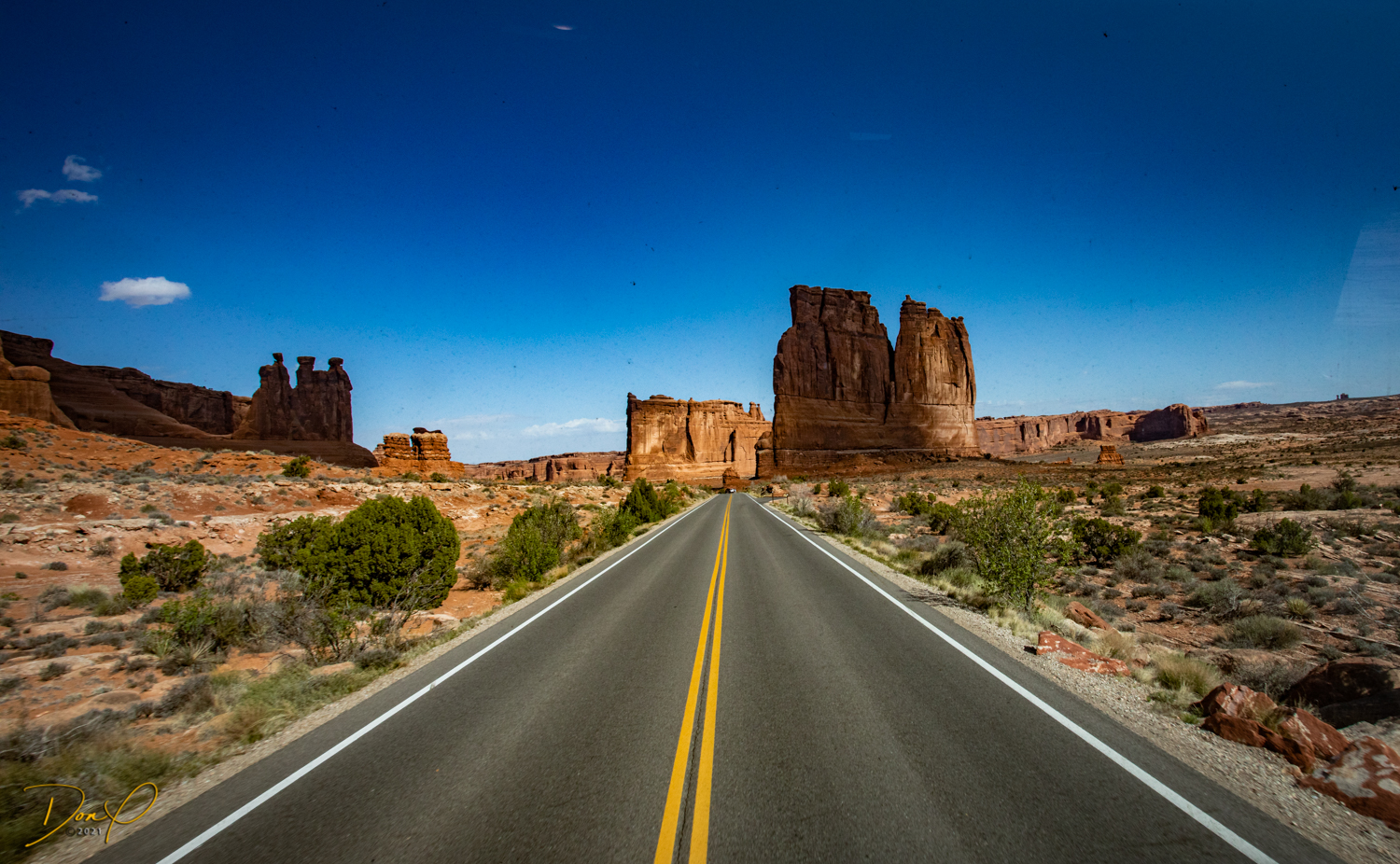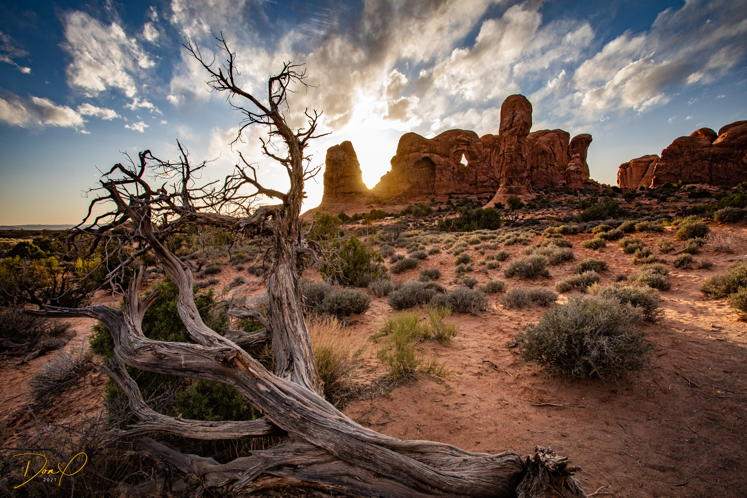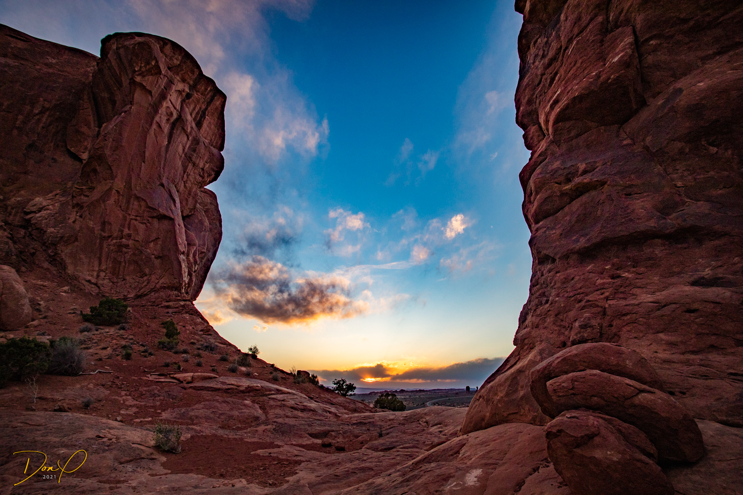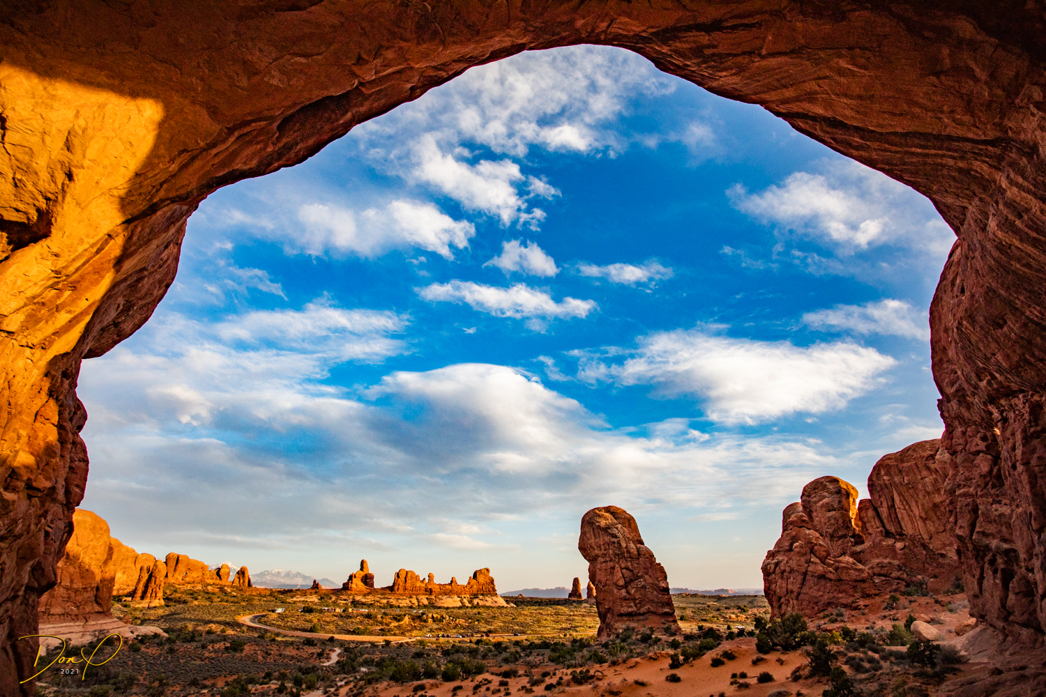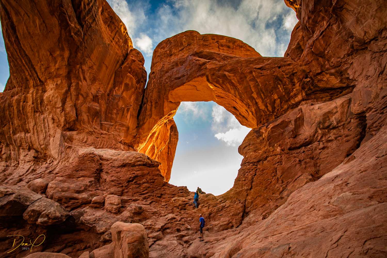 We photograph the area and get back in the RV. It is late afternoon and we leave the Park and head into Moab, just a few miles down the road. We find Moab Brewery and have an early dinner. Then we head back into Arches to try to catch a sunset. We stop at Window Arches and Double Arch and get some successful sunset shots along with what appears to be a Wedding Shoot!