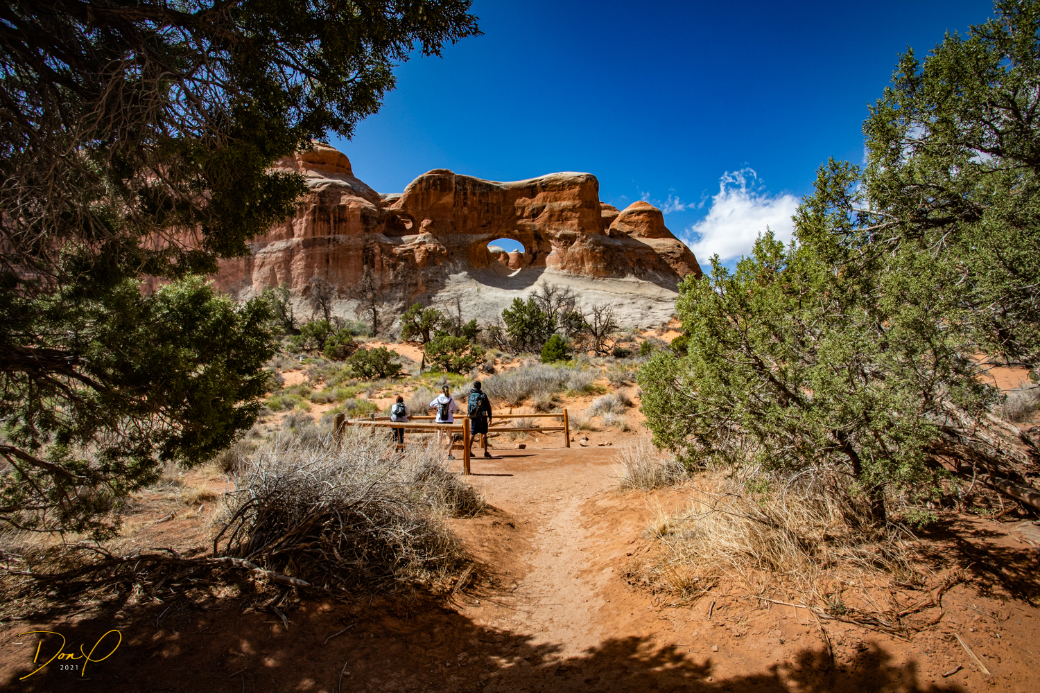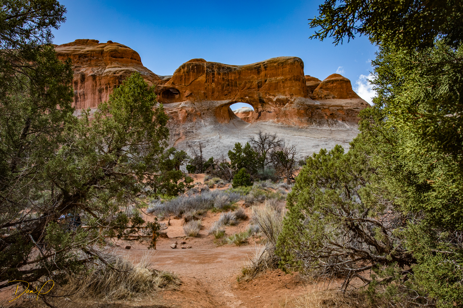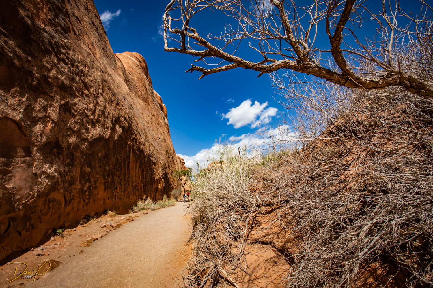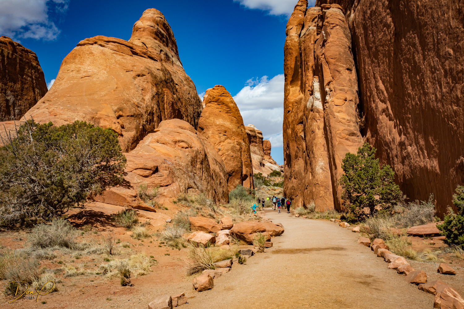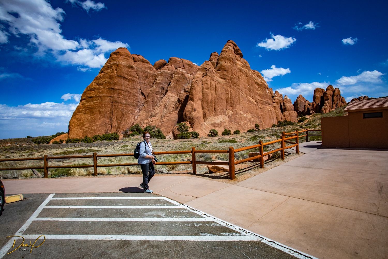 We drive The Beast of a RV back up into the park. The good thing is that I am getting much more comfortable driving it. We stop at a couple Arch Viewing sites and shoot some photos, but basically head for the far end of the Park. It was a wise choice as the crowds are building and we barely find room to park our beast. But we do and we head out on a short hike along Devil’s Garden Trail to see Pine Tree Arch, Tunnel Arch & Landscape Arch. The short hike turns a bit longer before we get to Landscape Arch. But it is worth it.