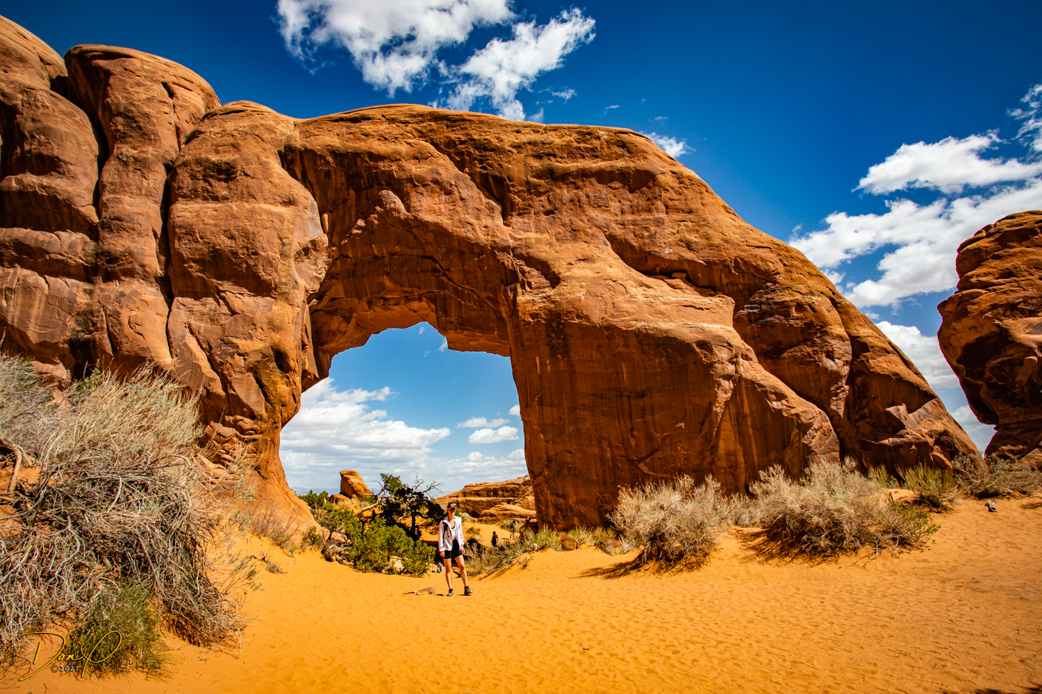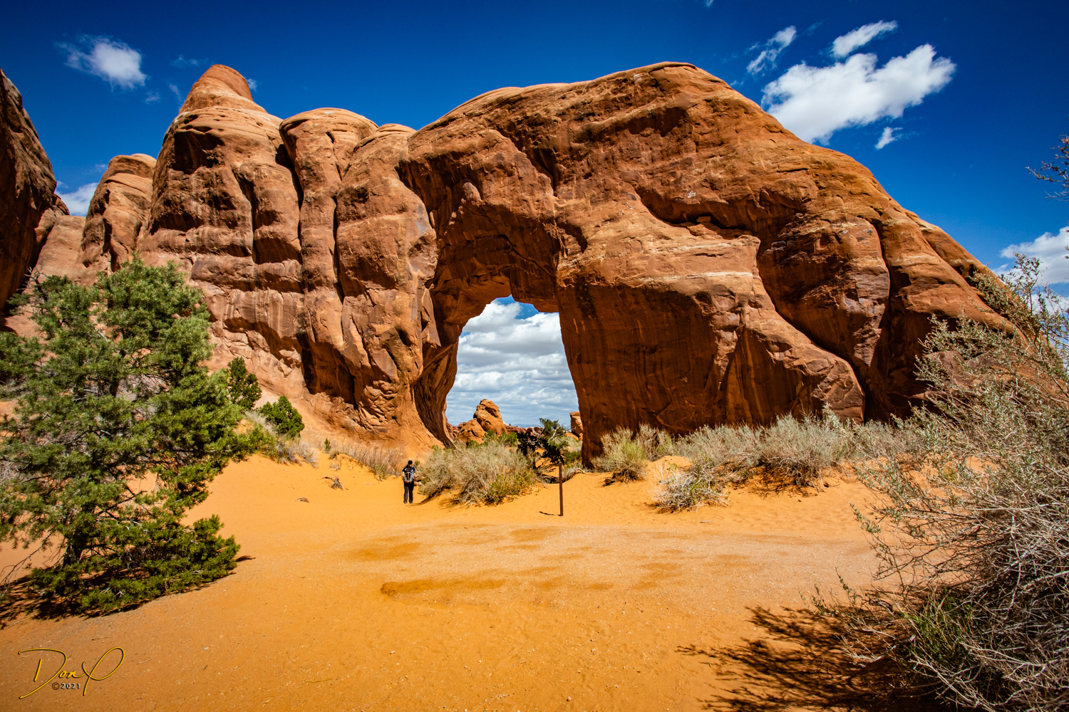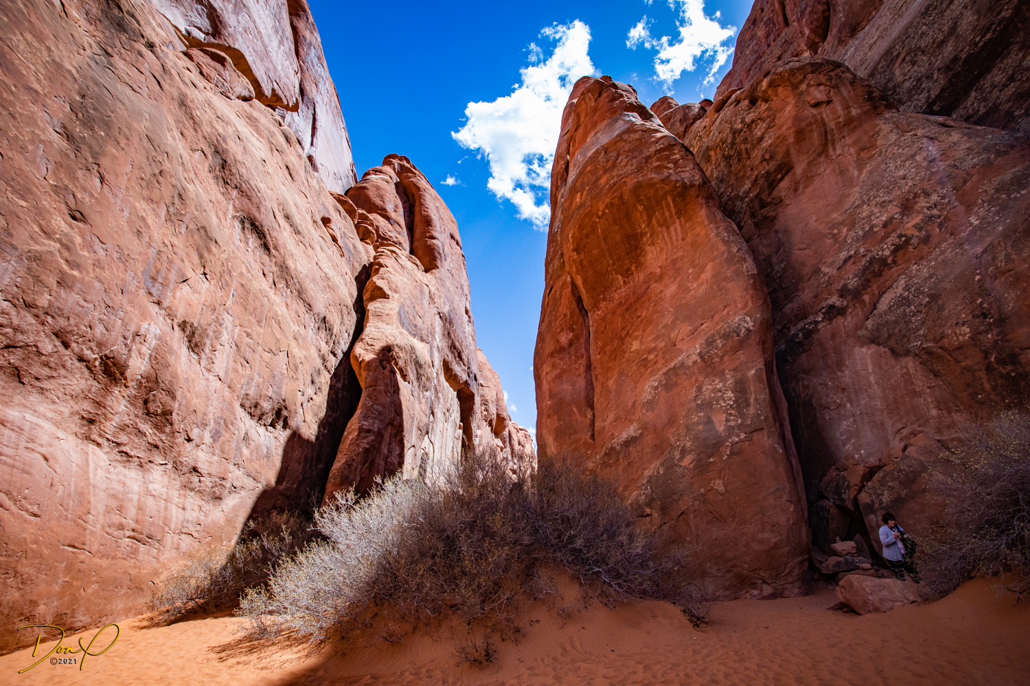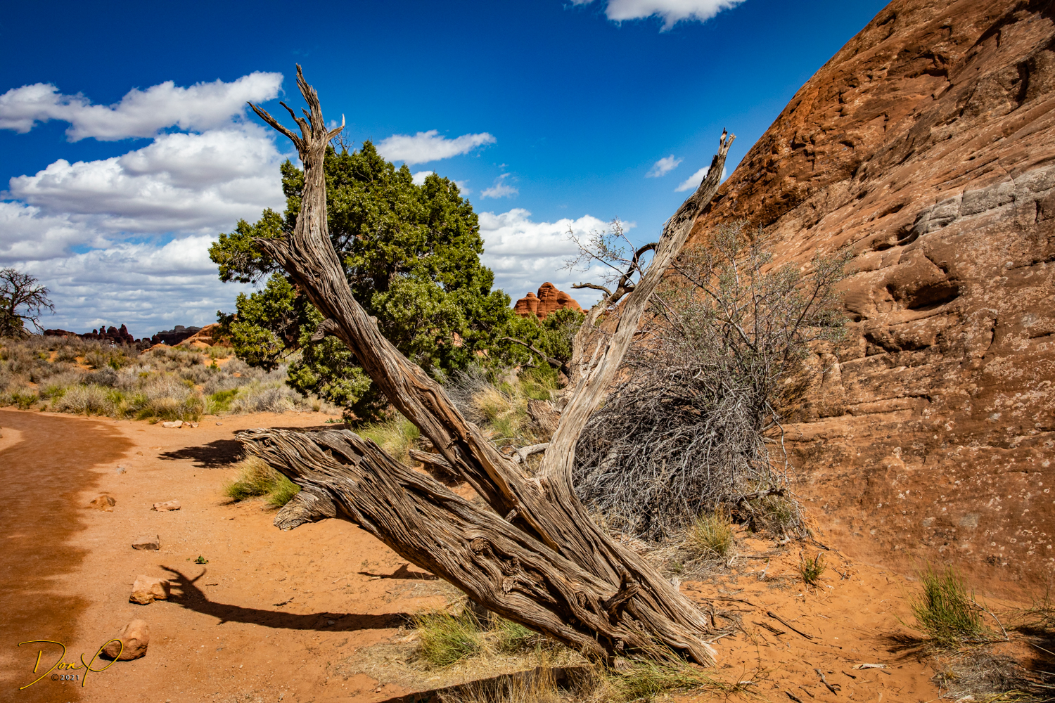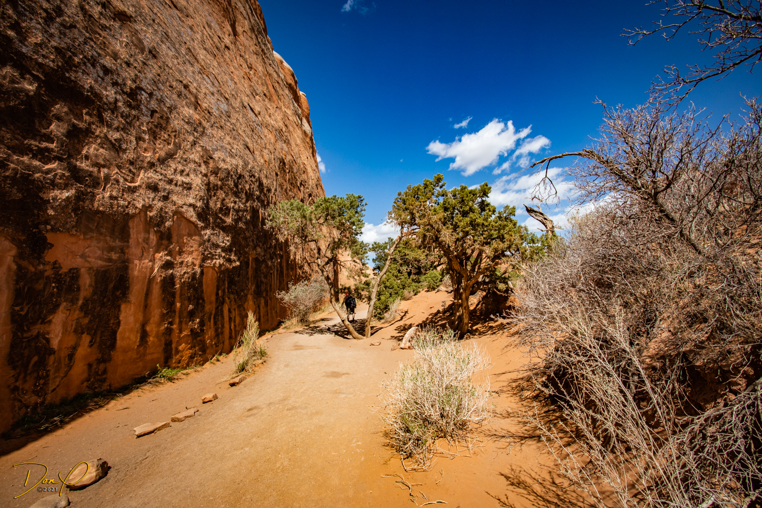 We drive The Beast of a RV back up into the park. The good thing is that I am getting much more comfortable driving it. We stop at a couple Arch Viewing sites and shoot some photos, but basically head for the far end of the Park. It was a wise choice as the crowds are building and we barely find room to park our beast. But we do and we head out on a short hike along Devil’s Garden Trail to see Pine Tree Arch, Tunnel Arch & Landscape Arch. The short hike turns a bit longer before we get to Landscape Arch. But it is worth it.