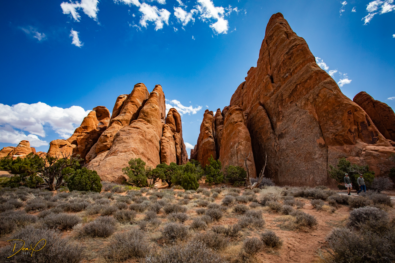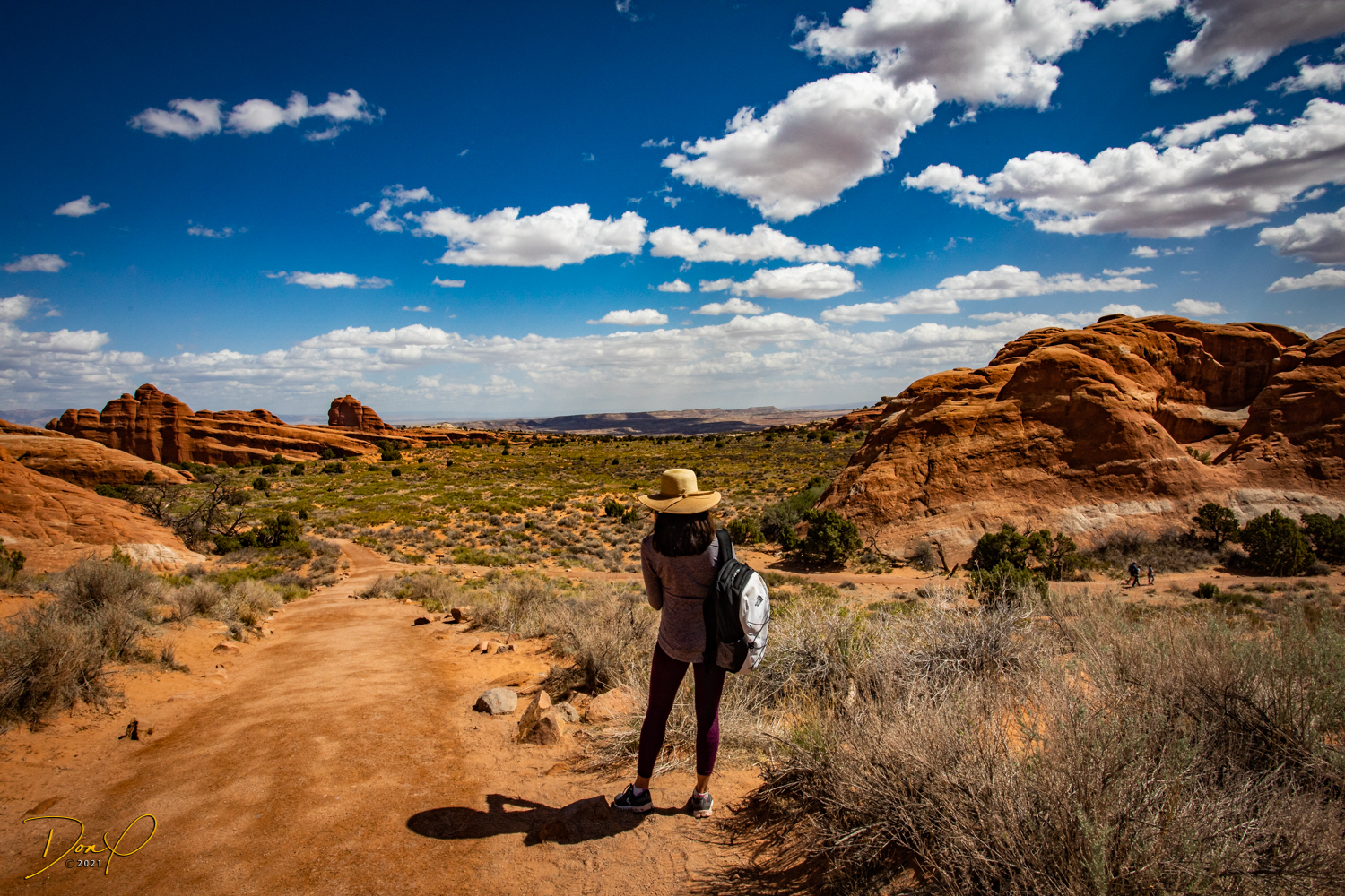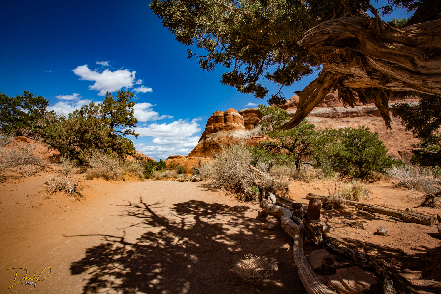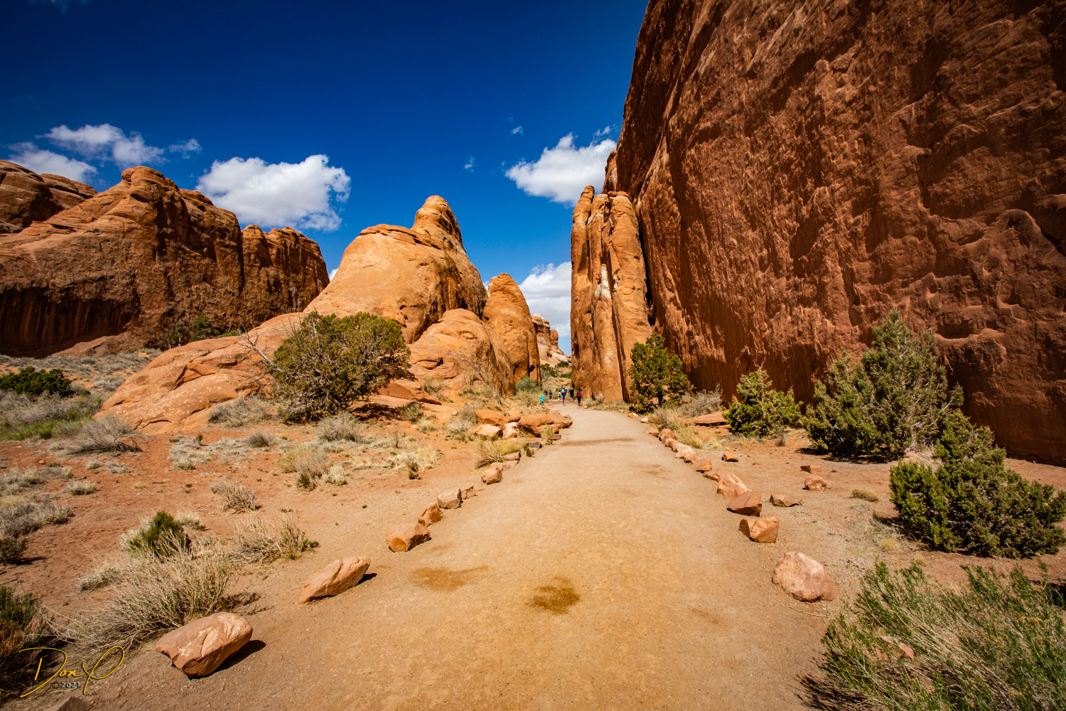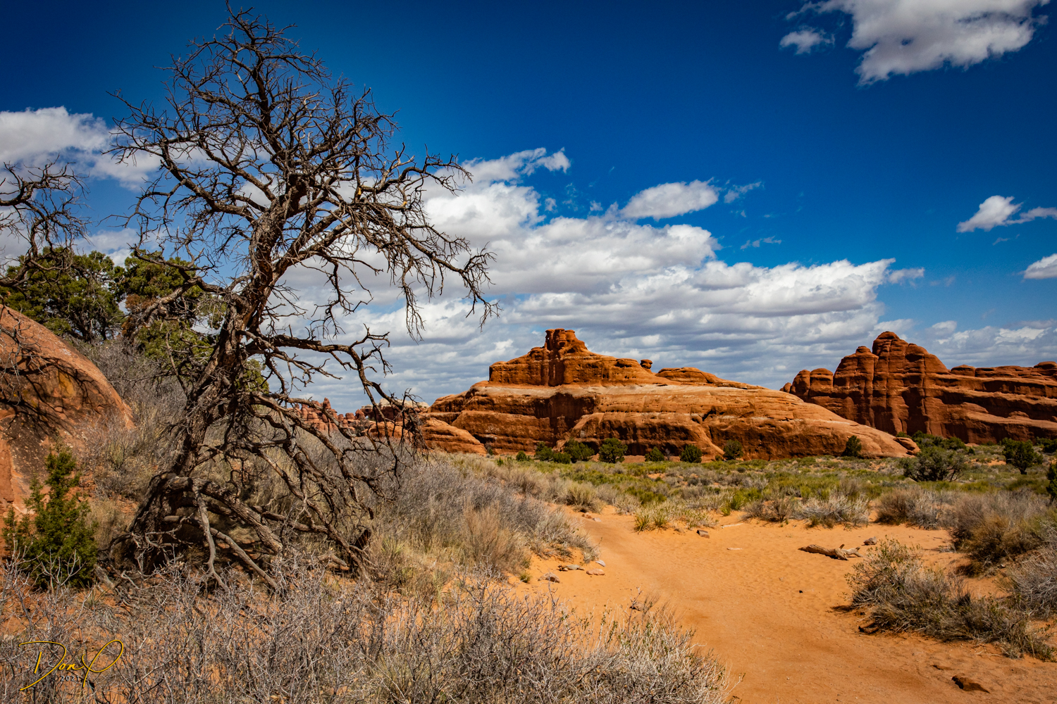We drive The Beast of a RV back up into the park. The good thing is that I am getting much more comfortable driving it. We stop at a couple Arch Viewing sites and shoot some photos, but basically head for the far end of the Park. It was a wise choice as the crowds are building and we barely find room to park our beast. But we do and we head out on a short hike along Devil’s Garden Trail to see Pine Tree Arch, Tunnel Arch & Landscape Arch. The short hike turns a bit longer before we get to Landscape Arch. But it is worth it.