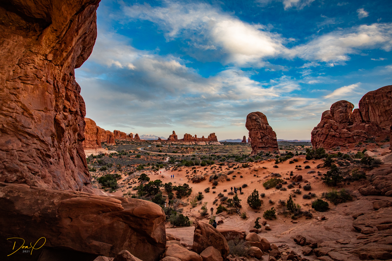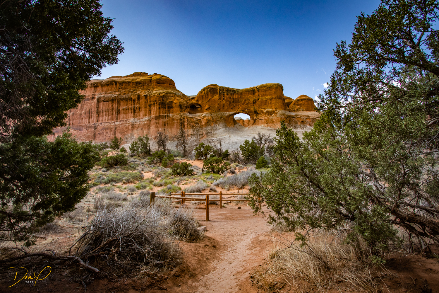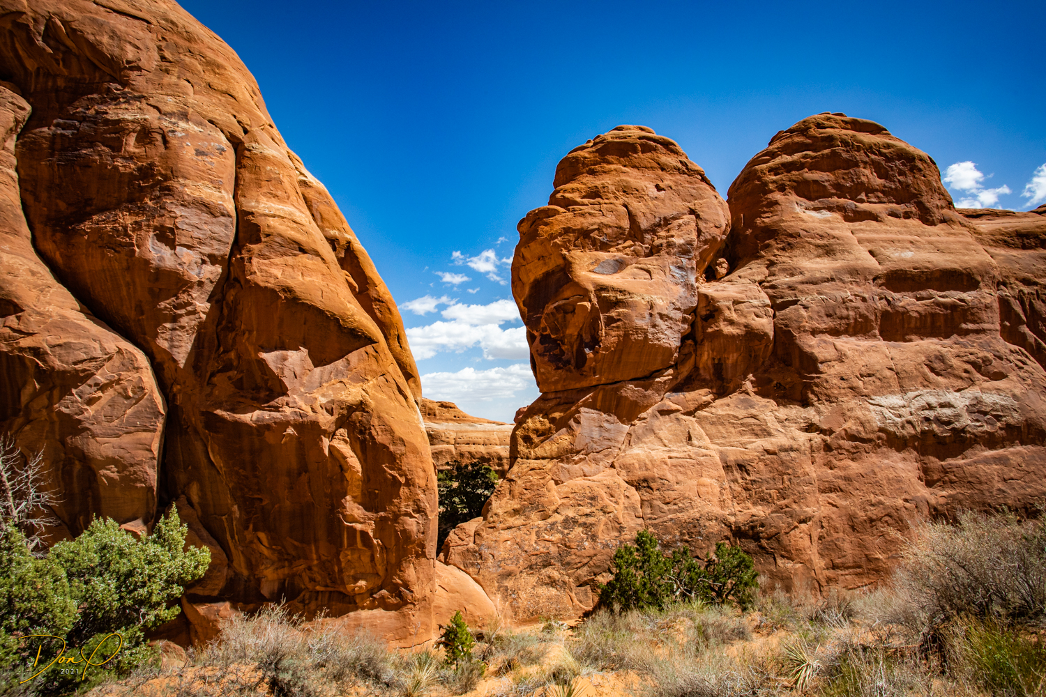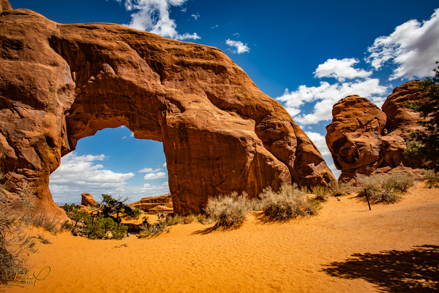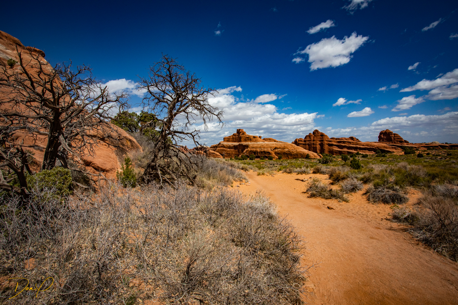 We drive The Beast of a RV back up into the park. The good thing is that I am getting much more comfortable driving it. We stop at a couple Arch Viewing sites and shoot some photos, but basically head for the far end of the Park. It was a wise choice as the crowds are building and we barely find room to park our beast. But we do and we head out on a short hike along Devil’s Garden Trail to see Pine Tree Arch, Tunnel Arch & Landscape Arch. The short hike turns a bit longer before we get to Landscape Arch. But it is worth it.