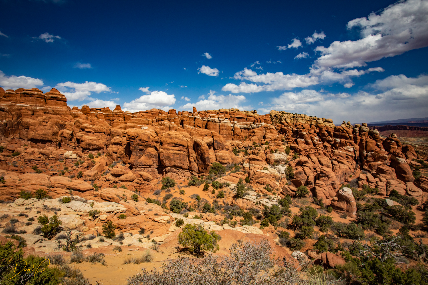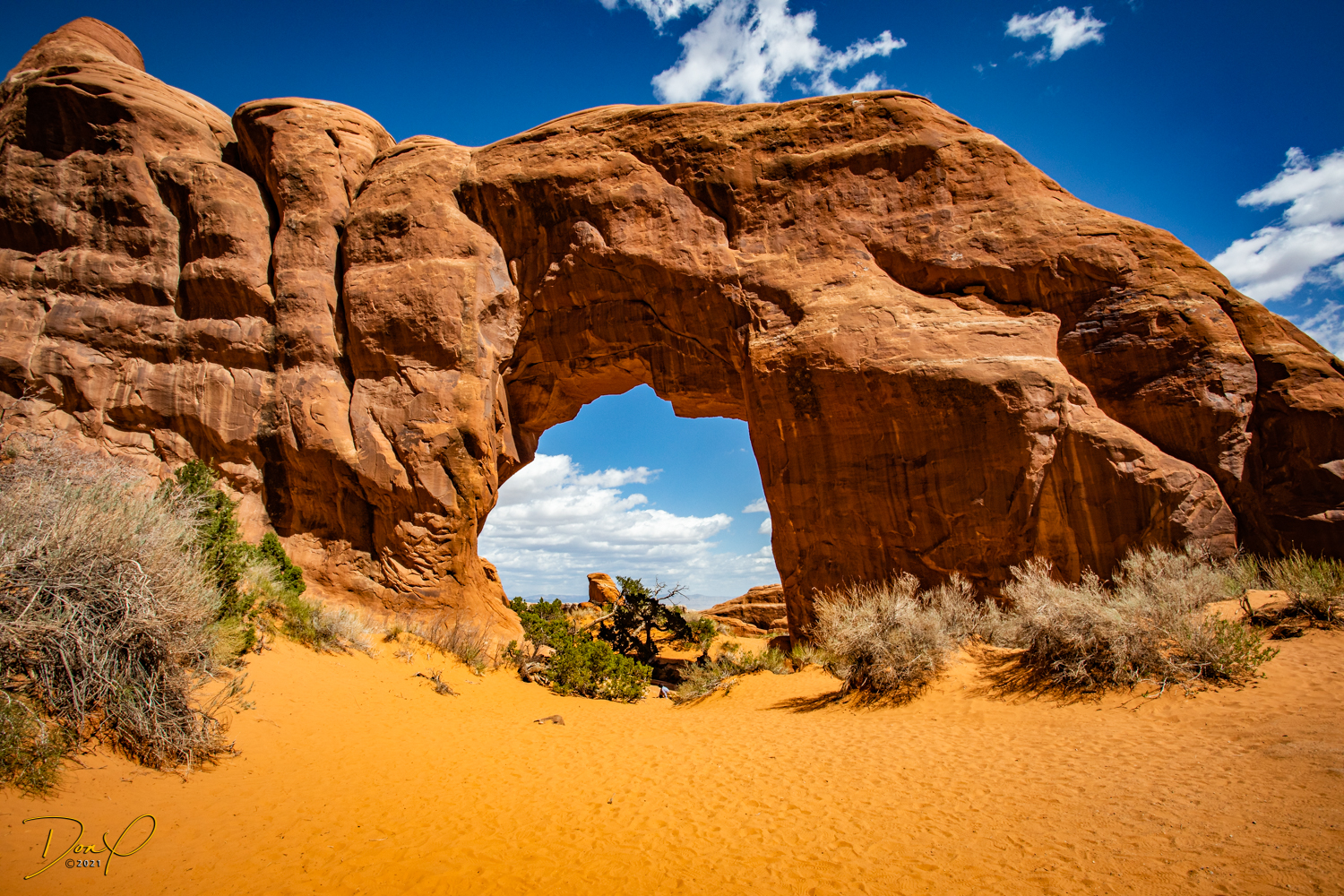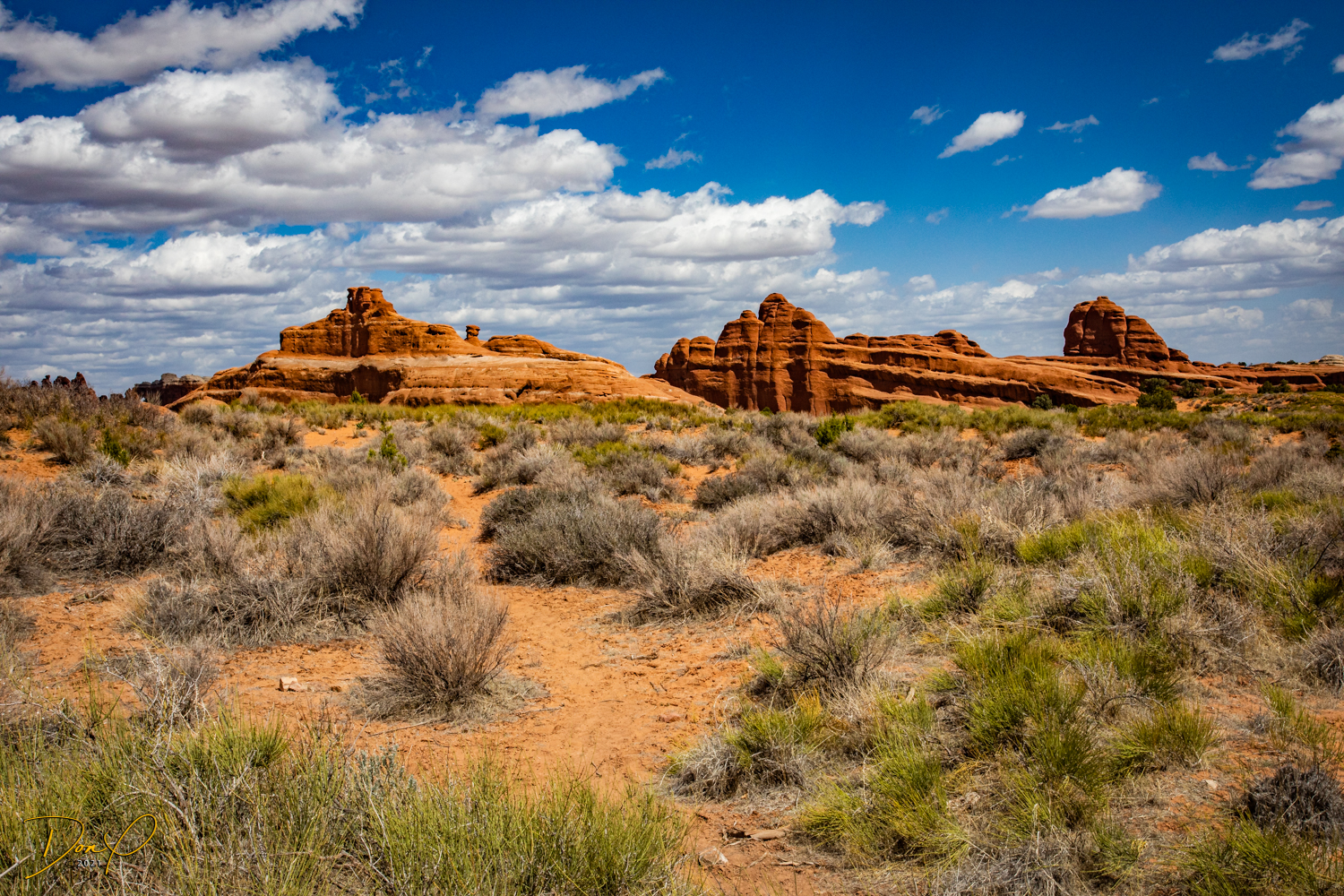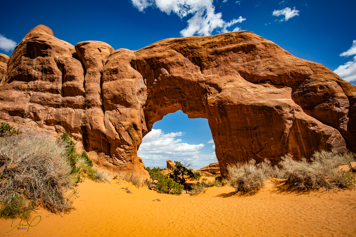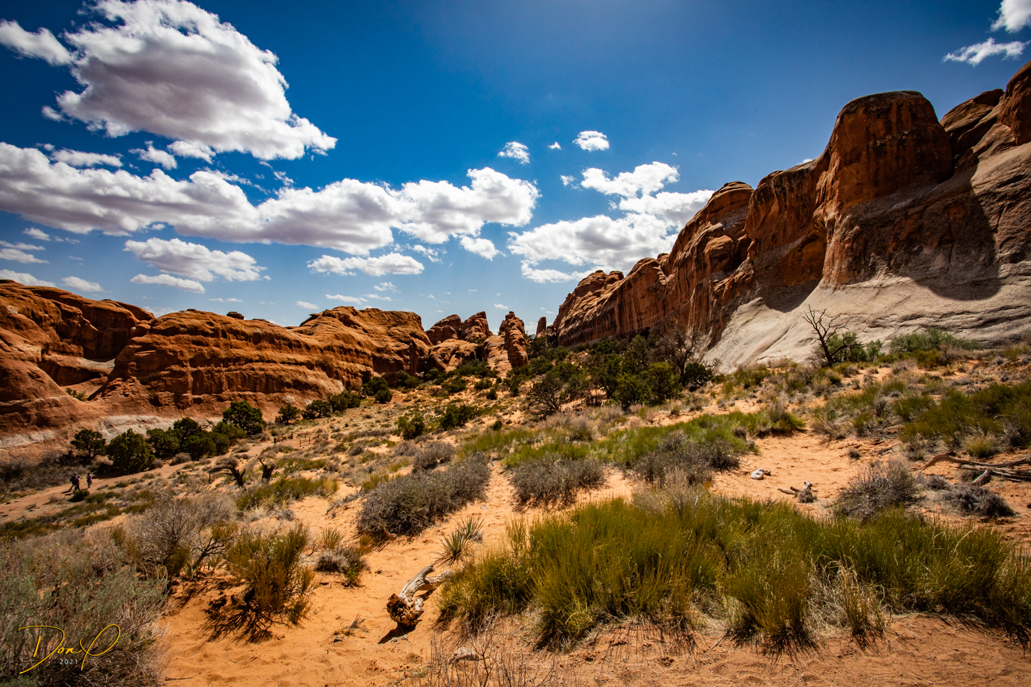 We drive The Beast of a RV back up into the park. The good thing is that I am getting much more comfortable driving it. We stop at a couple Arch Viewing sites and shoot some photos, but basically head for the far end of the Park. It was a wise choice as the crowds are building and we barely find room to park our beast. But we do and we head out on a short hike along Devil’s Garden Trail to see Pine Tree Arch, Tunnel Arch & Landscape Arch. The short hike turns a bit longer before we get to Landscape Arch. But it is worth it.