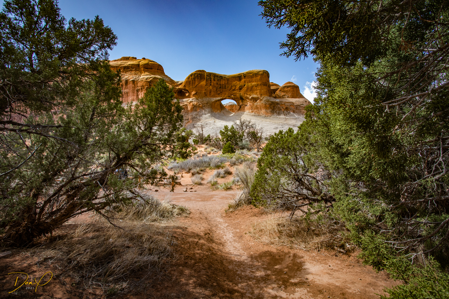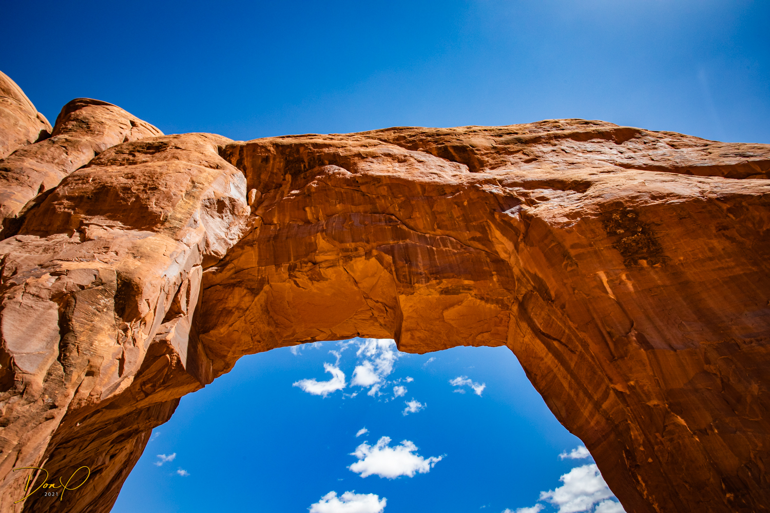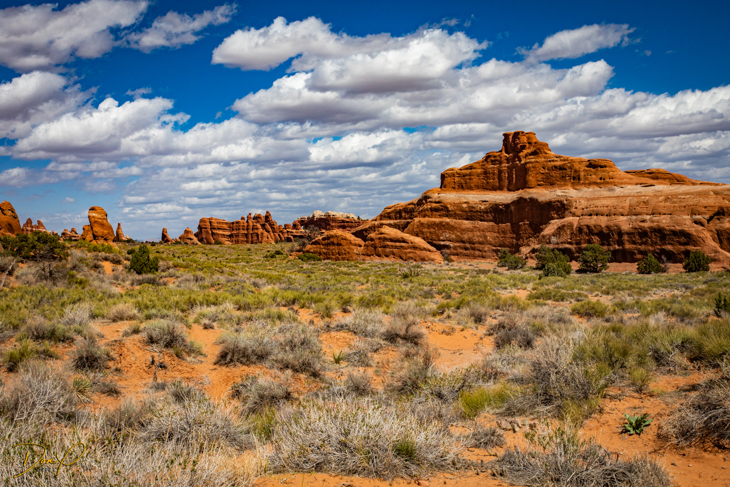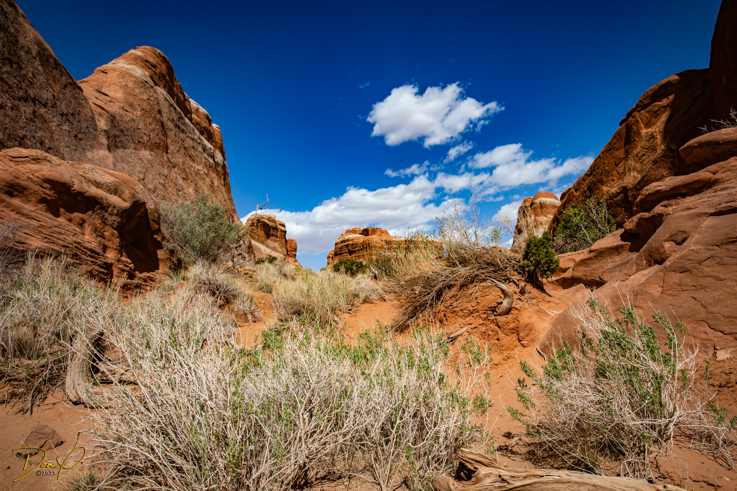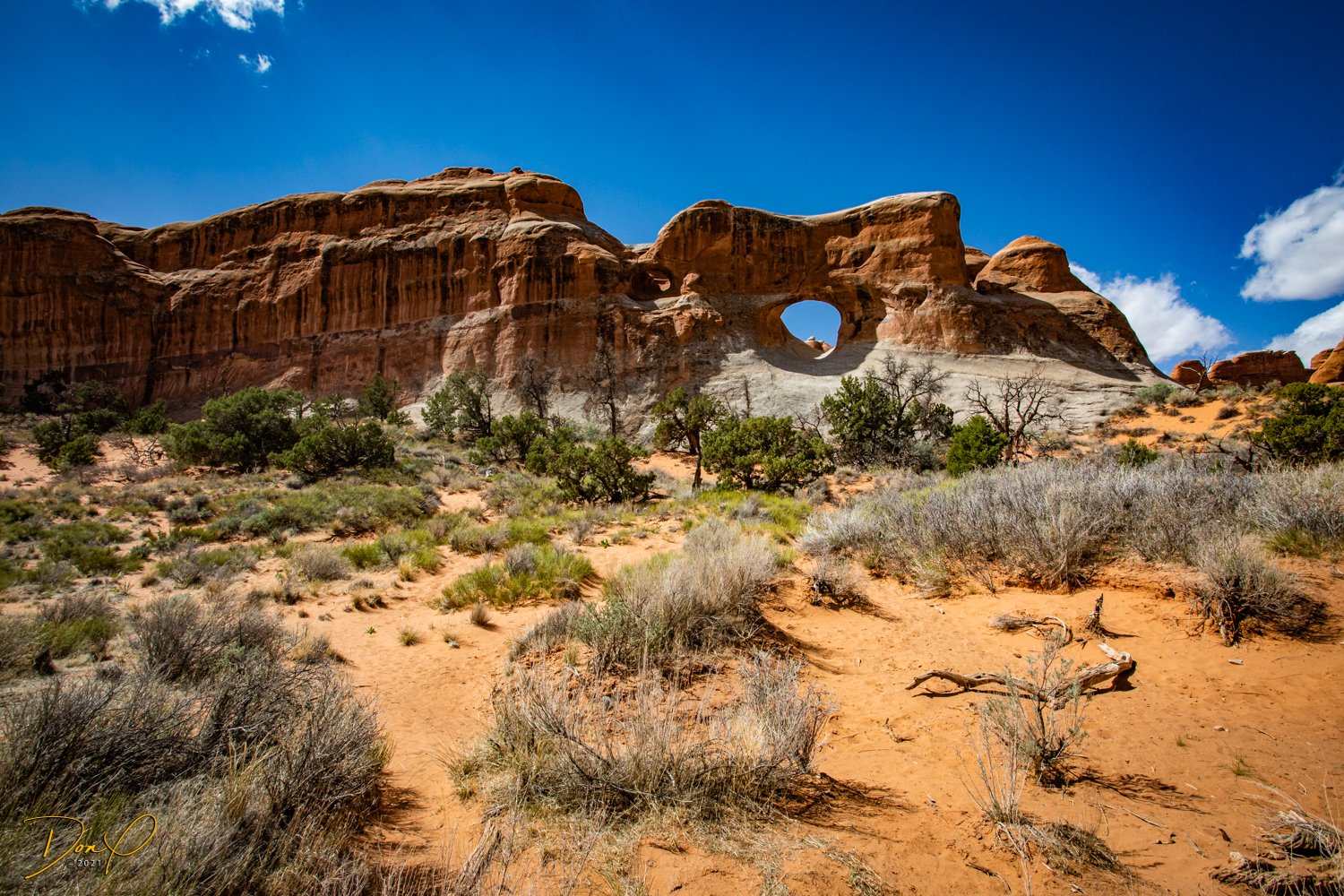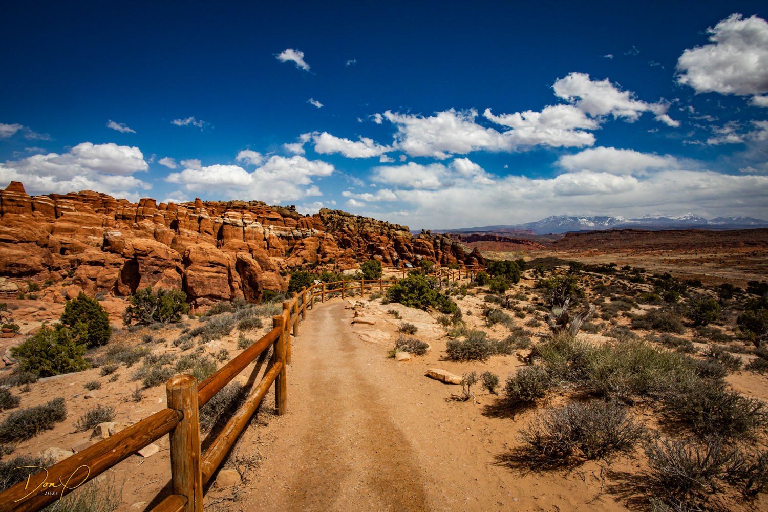 We drive The Beast of a RV back up into the park. The good thing is that I am getting much more comfortable driving it. We stop at a couple Arch Viewing sites and shoot some photos, but basically head for the far end of the Park. It was a wise choice as the crowds are building and we barely find room to park our beast. But we do and we head out on a short hike along Devil’s Garden Trail to see Pine Tree Arch, Tunnel Arch & Landscape Arch. The short hike turns a bit longer before we get to Landscape Arch. But it is worth it.