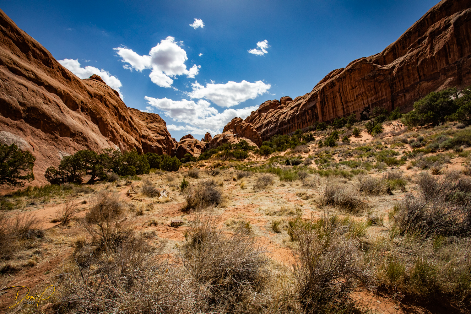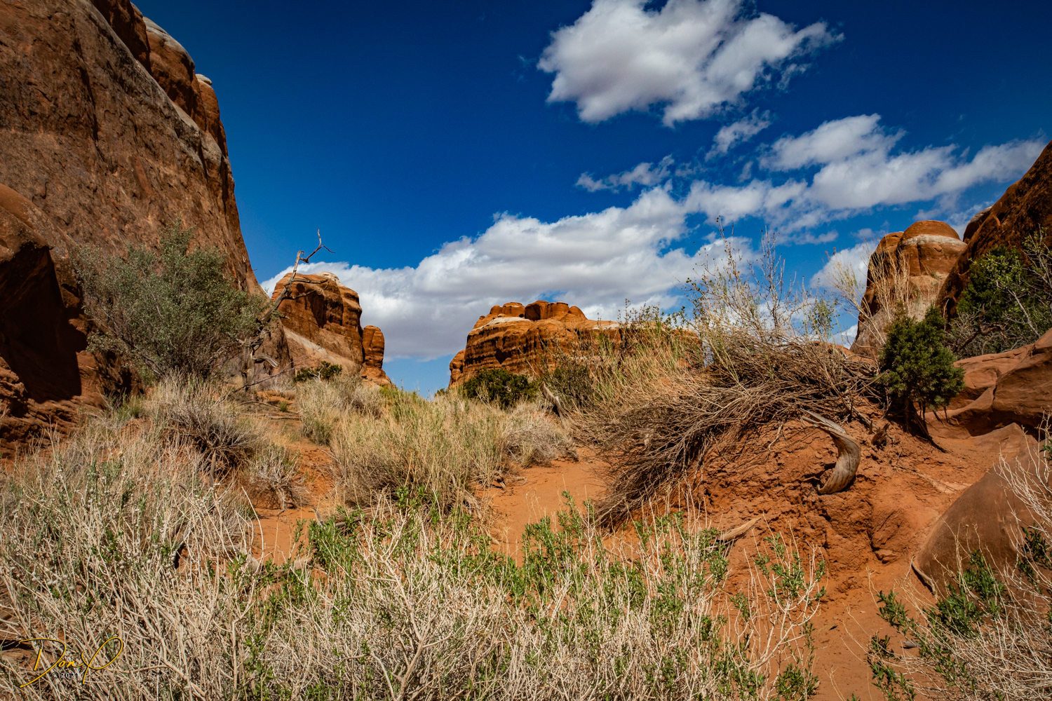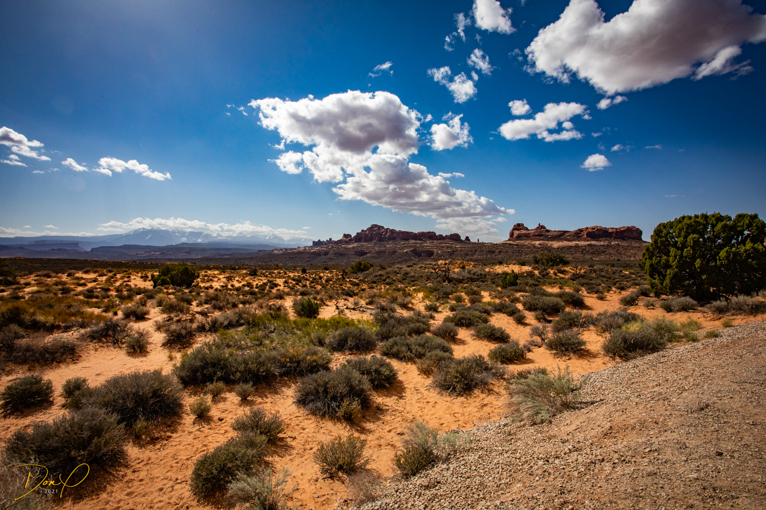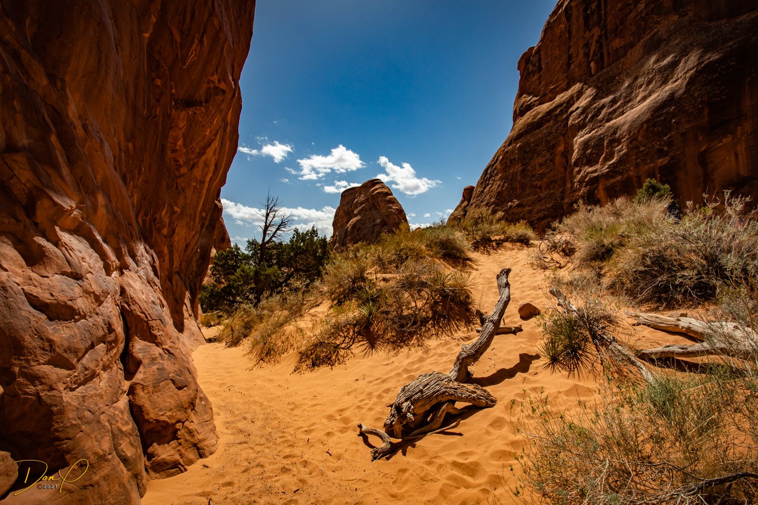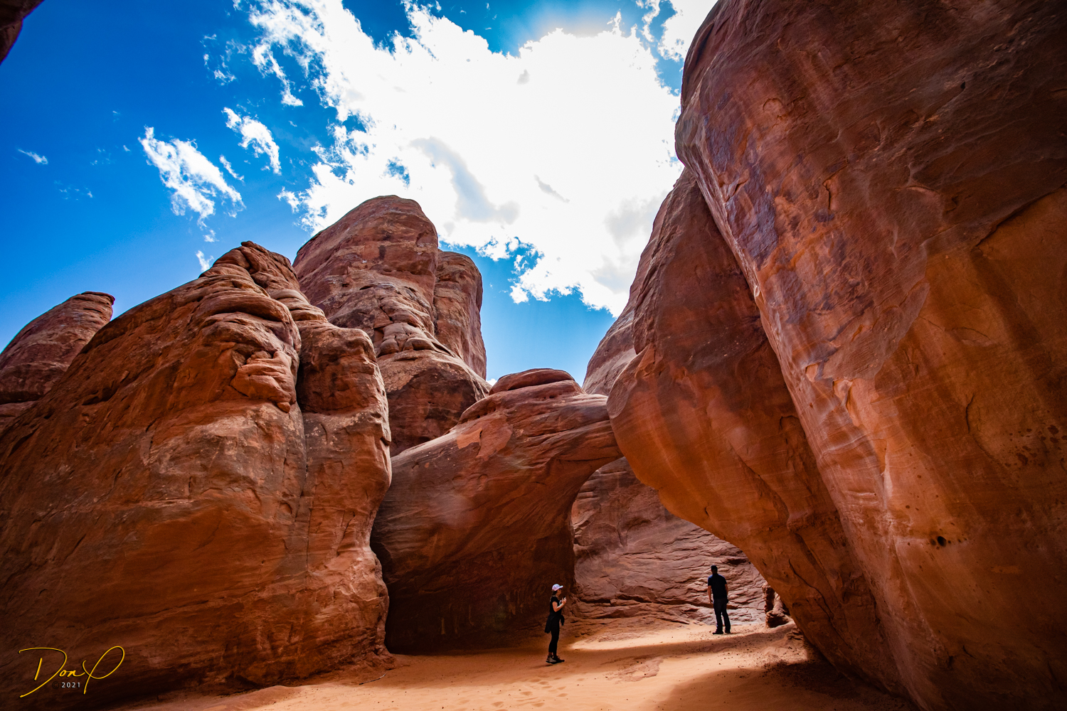 We drive The Beast of a RV back up into the park. The good thing is that I am getting much more comfortable driving it. We stop at a couple Arch Viewing sites and shoot some photos, but basically head for the far end of the Park. It was a wise choice as the crowds are building and we barely find room to park our beast. But we do and we head out on a short hike along Devil’s Garden Trail to see Pine Tree Arch, Tunnel Arch & Landscape Arch. The short hike turns a bit longer before we get to Landscape Arch. But it is worth it.