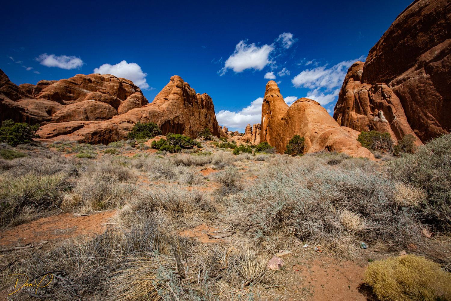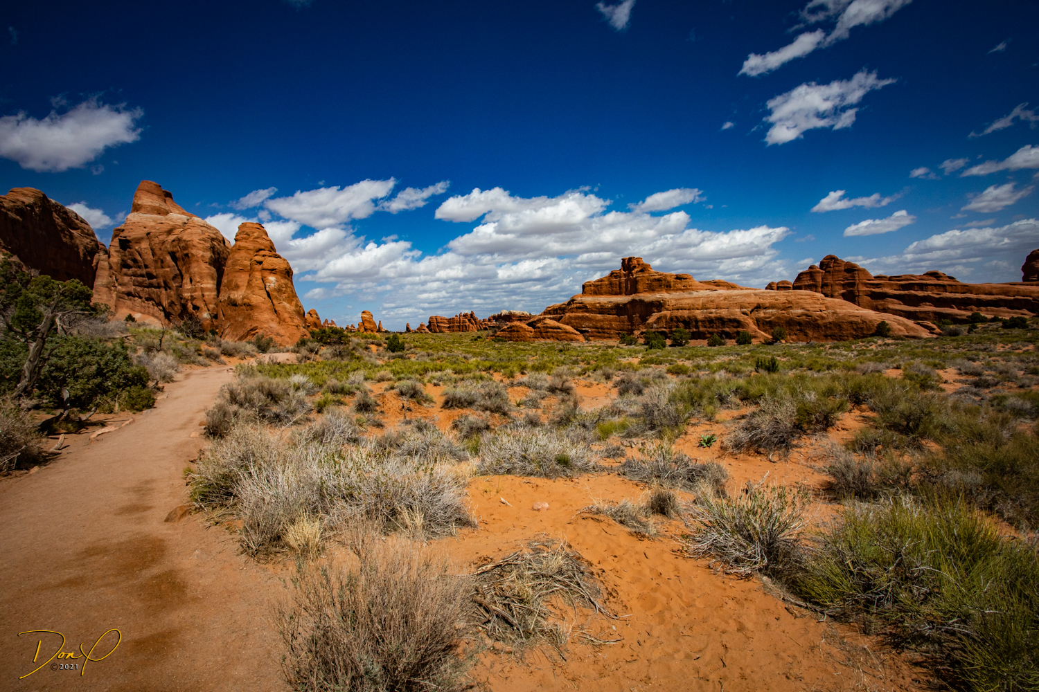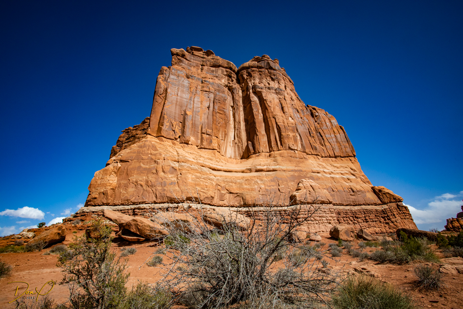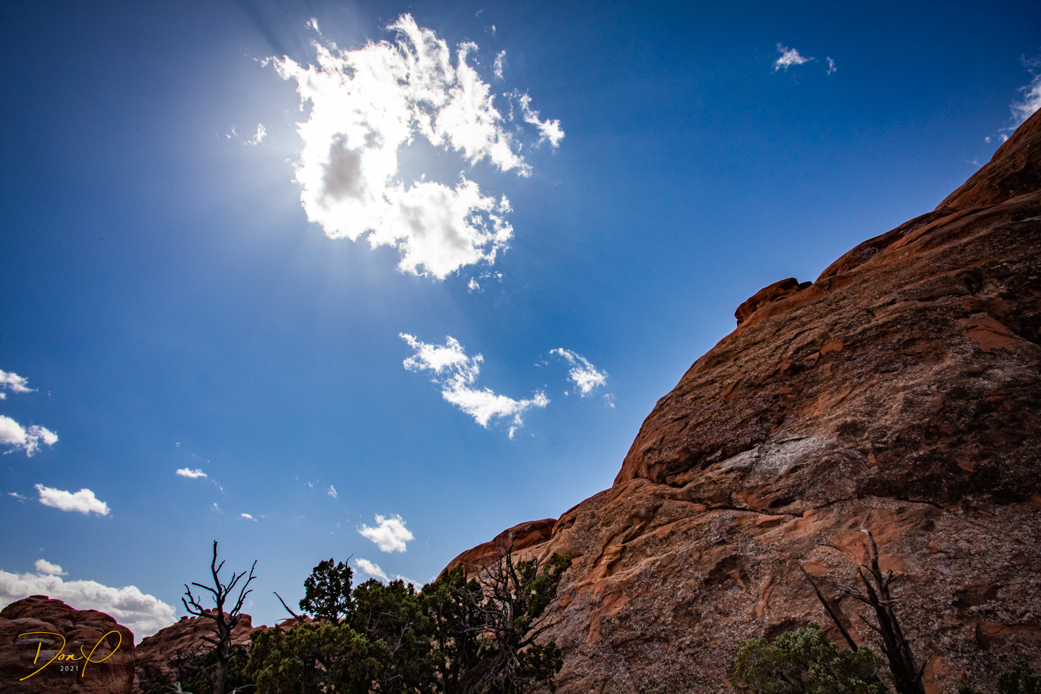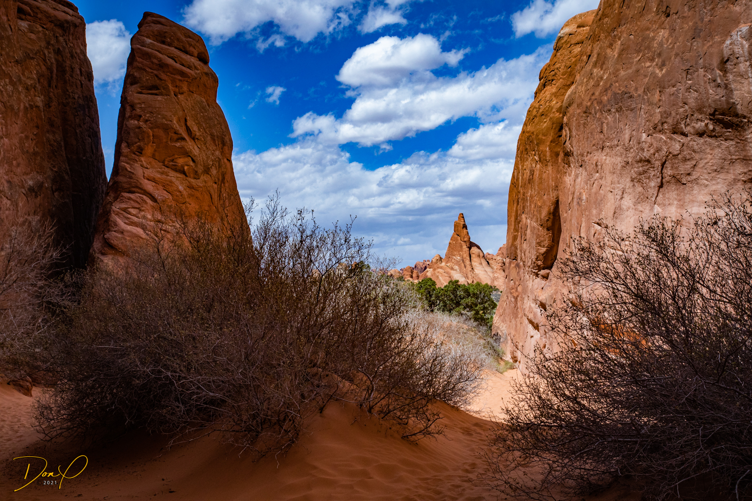 We drive The Beast of a RV back up into the park. The good thing is that I am getting much more comfortable driving it. We stop at a couple Arch Viewing sites and shoot some photos, but basically head for the far end of the Park. It was a wise choice as the crowds are building and we barely find room to park our beast. But we do and we head out on a short hike along Devil’s Garden Trail to see Pine Tree Arch, Tunnel Arch & Landscape Arch. The short hike turns a bit longer before we get to Landscape Arch. But it is worth it.