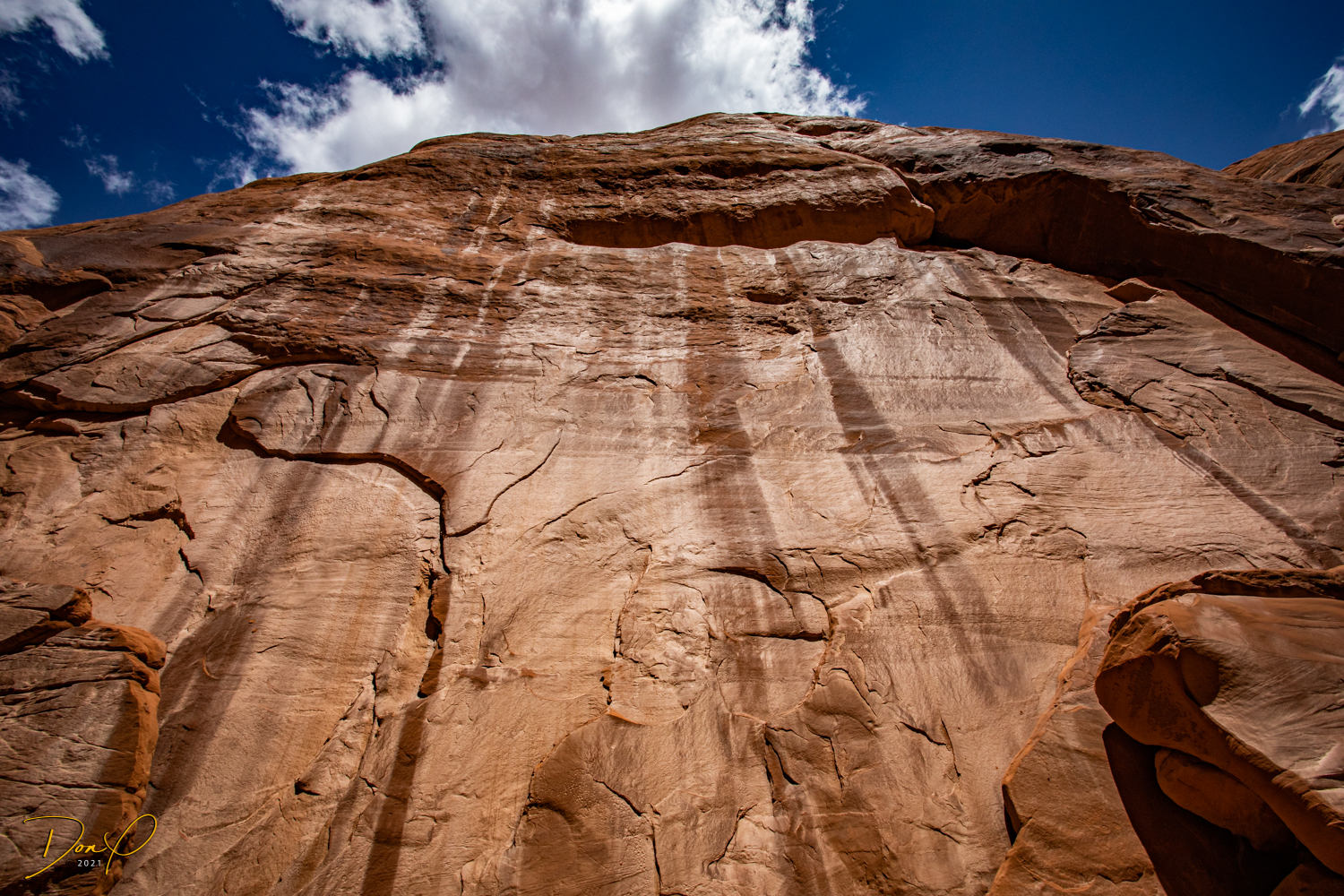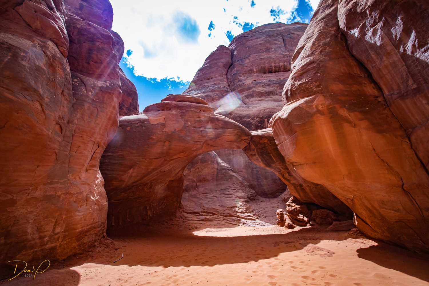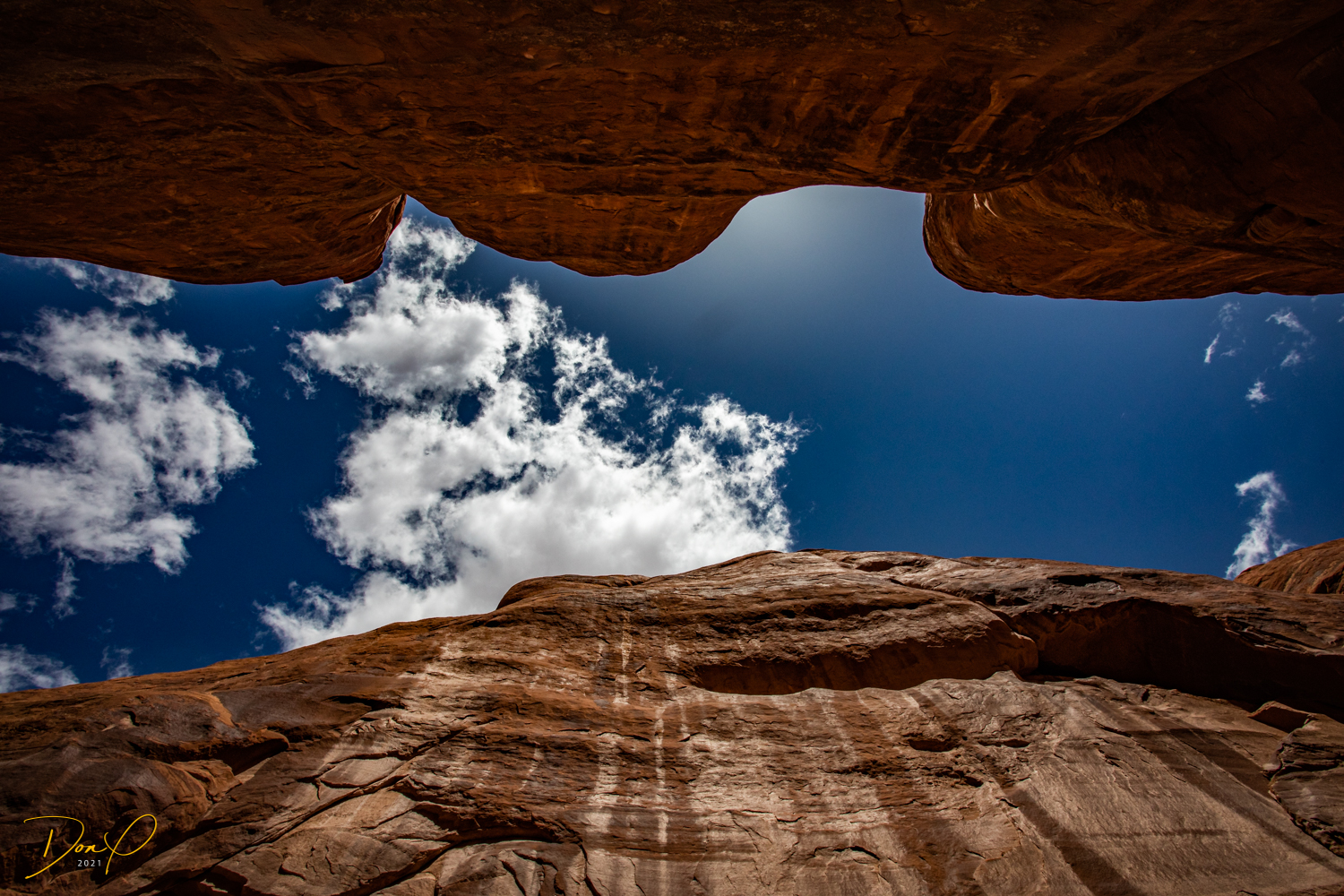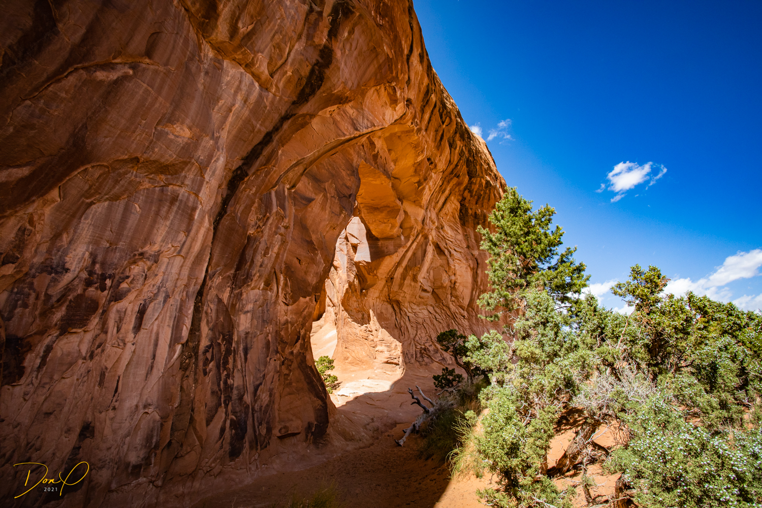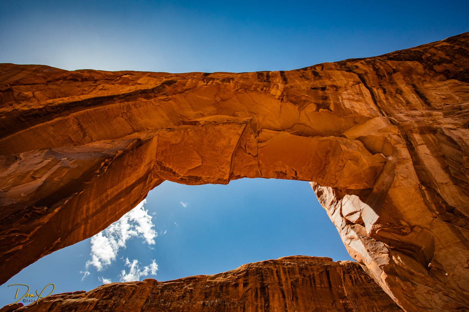 We drive The Beast of a RV back up into the park. The good thing is that I am getting much more comfortable driving it. We stop at a couple Arch Viewing sites and shoot some photos, but basically head for the far end of the Park. It was a wise choice as the crowds are building and we barely find room to park our beast. But we do and we head out on a short hike along Devil’s Garden Trail to see Pine Tree Arch, Tunnel Arch & Landscape Arch. The short hike turns a bit longer before we get to Landscape Arch. But it is worth it.