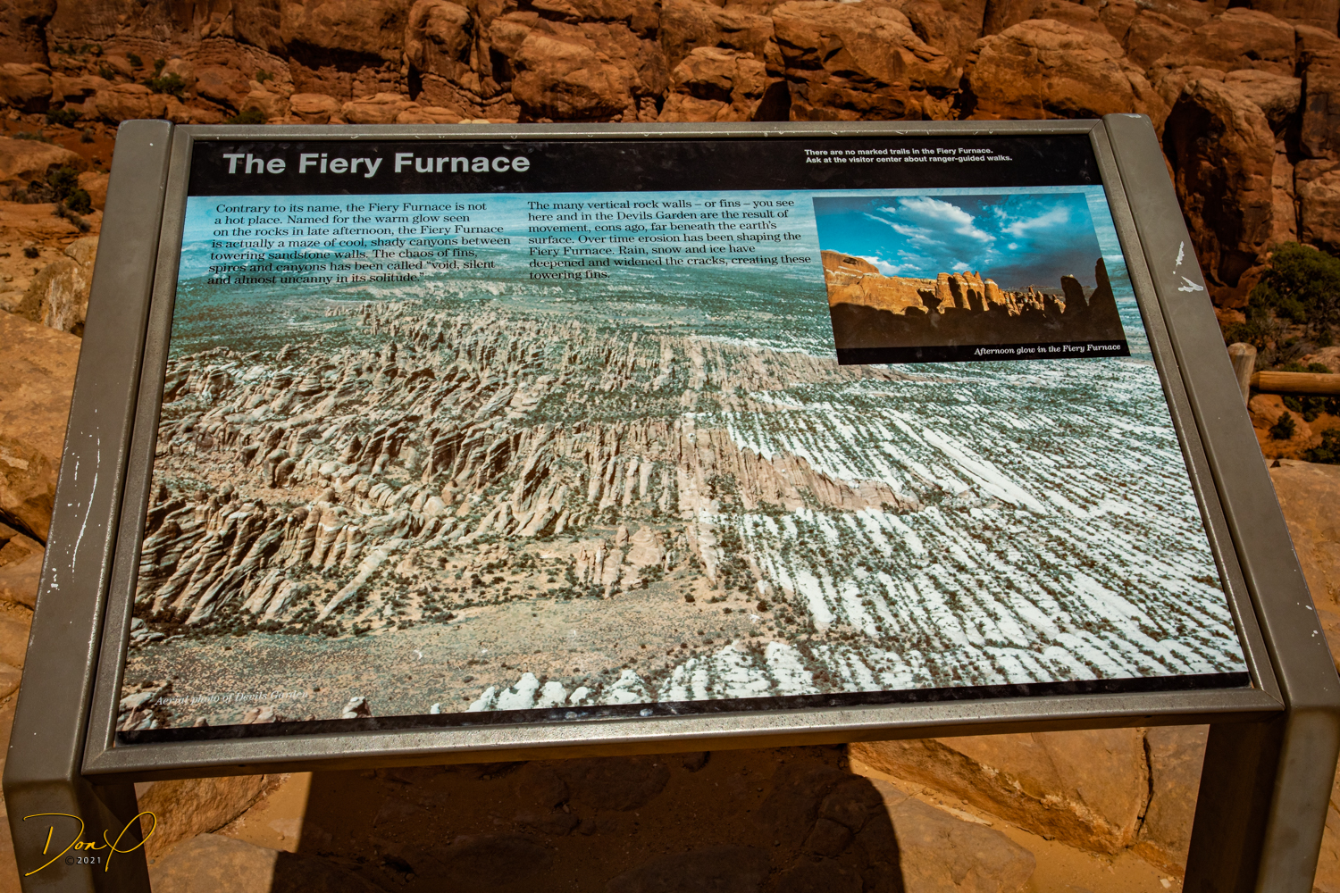 After have a couple sandwiches in the RV, we head back through the Park, stopping at various sites including Fiery Furnace, a place named for the color of the rocks during sunset.