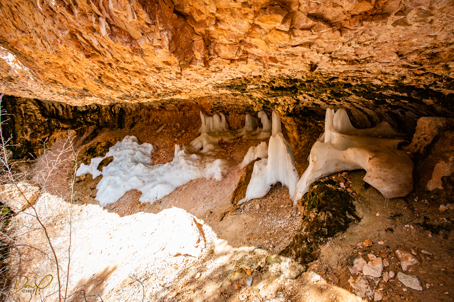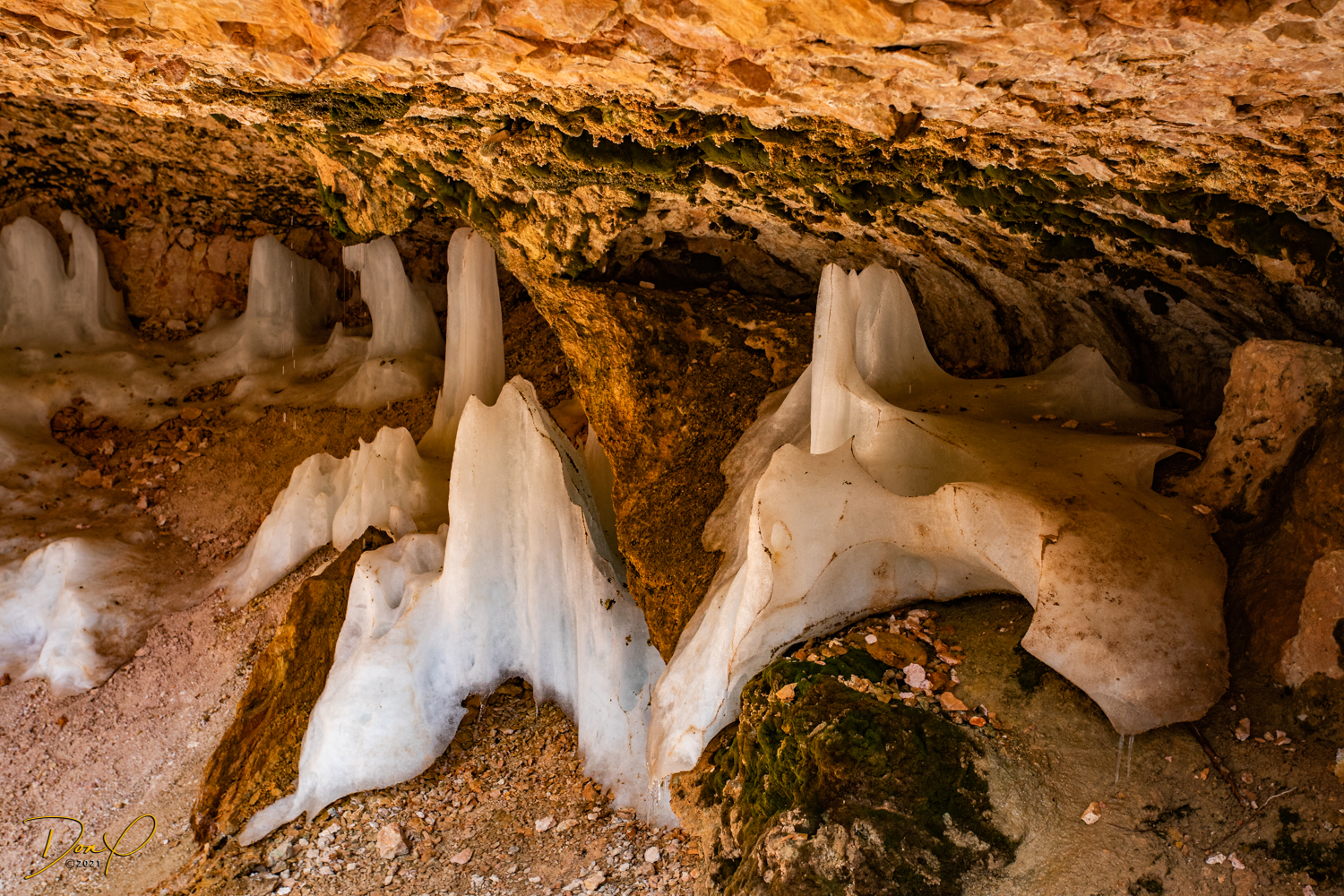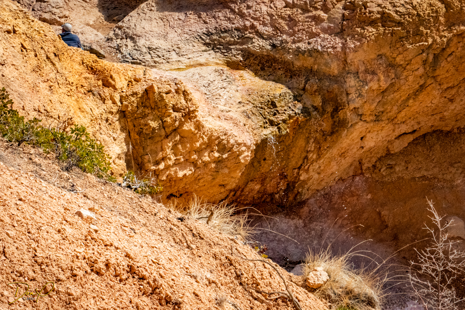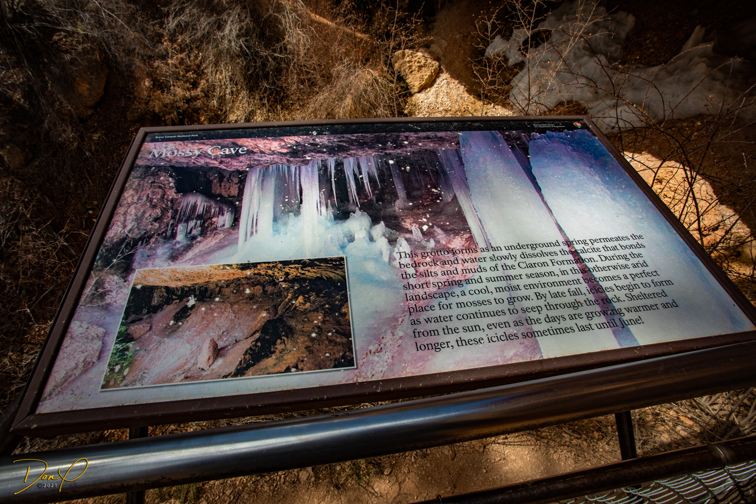 We eat in the RV before driving on. (I can’t eat AND drive The Beast at the same time!) It takes us one hour to get near to Bryce Canyon National Park. We stop in a lot that announces “Mossy Cave” and take a short hike to it and a waterfall. Neither one impresses much, but hey, it’s a fun hike!