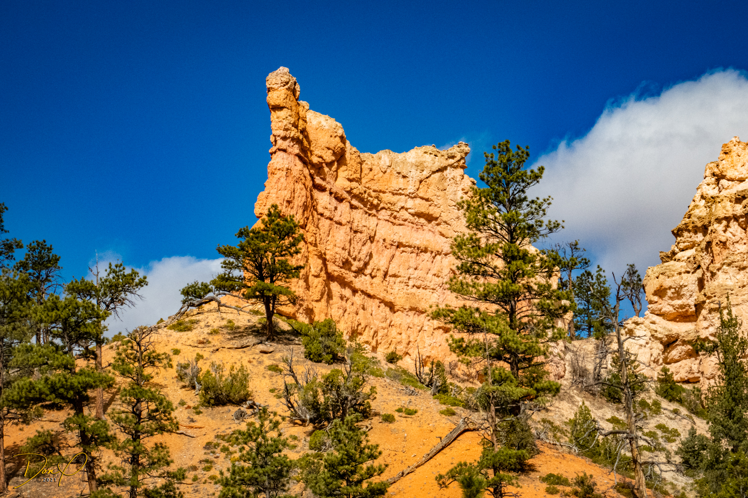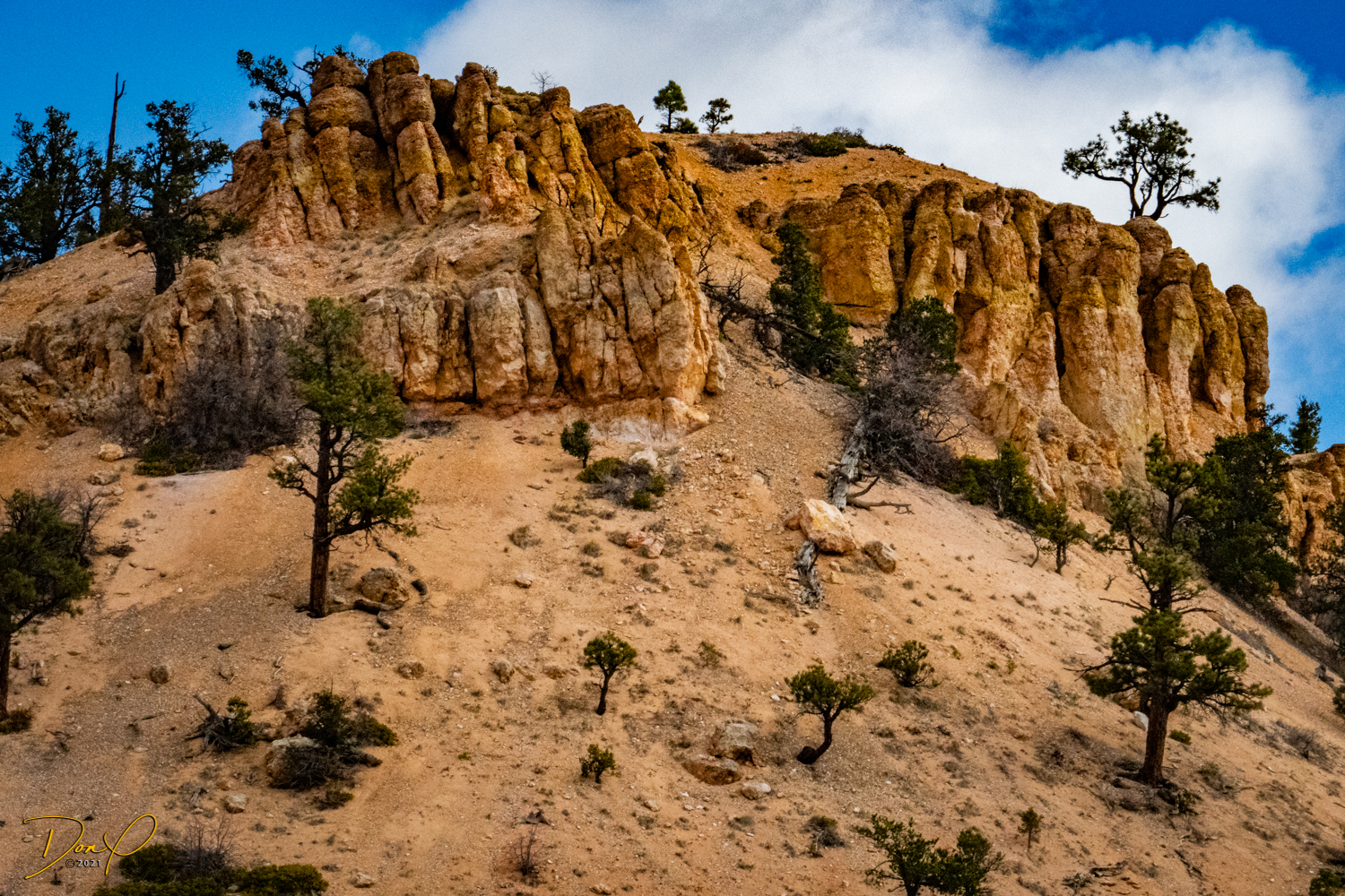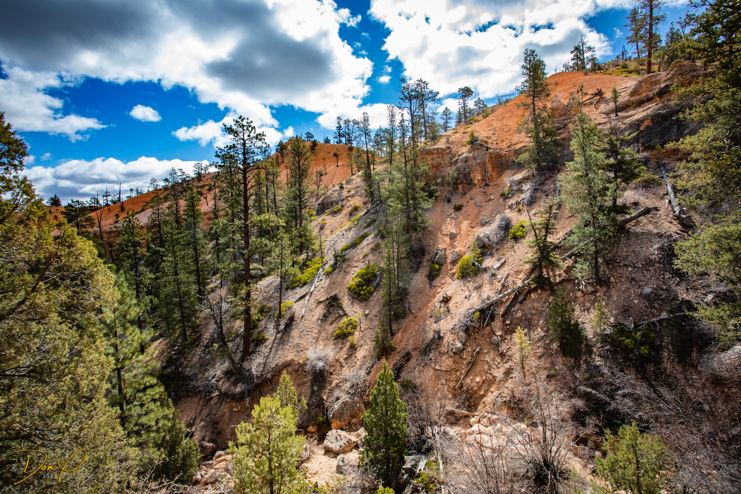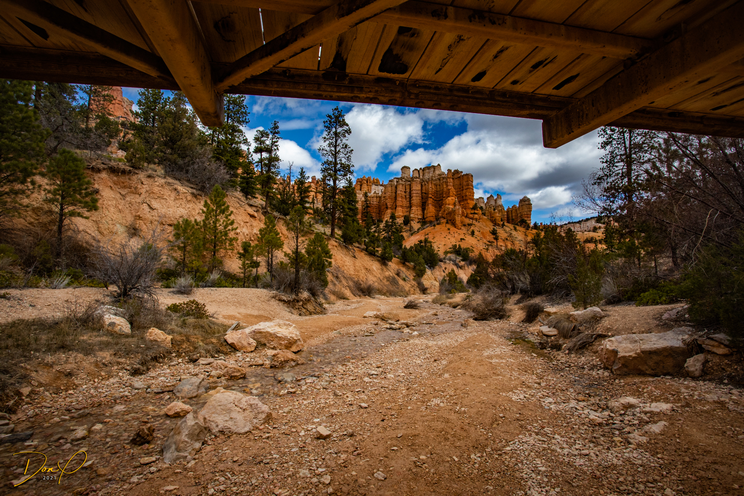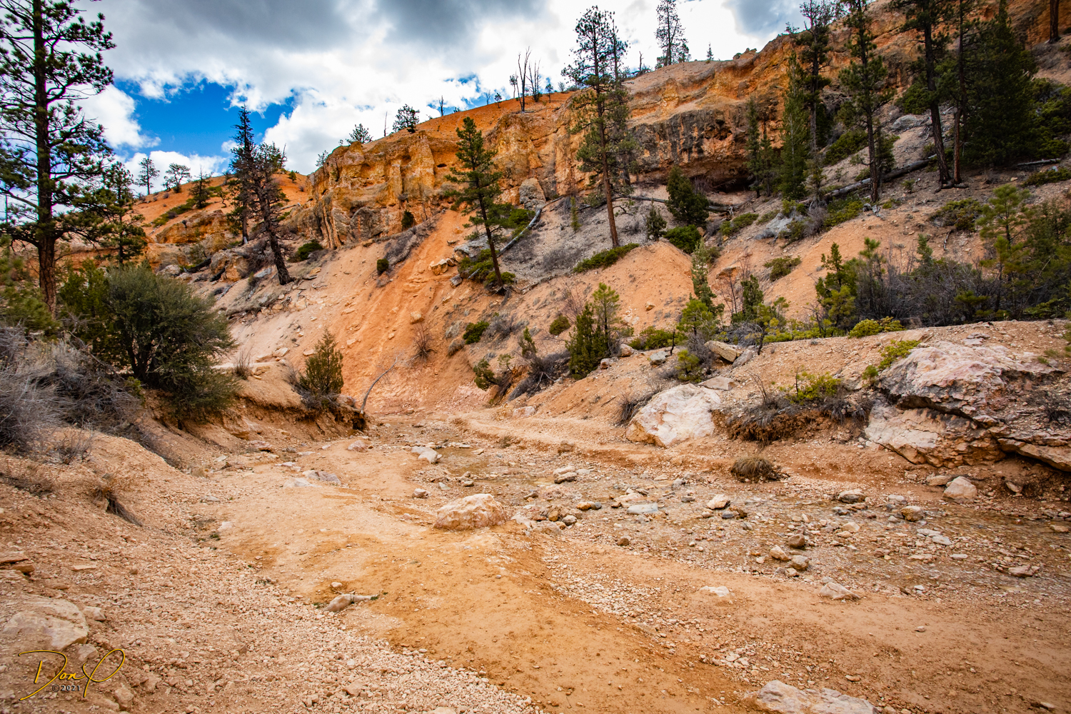 We eat in the RV before driving on. (I can’t eat AND drive The Beast at the same time!) It takes us one hour to get near to Bryce Canyon National Park. We stop in a lot that announces “Mossy Cave” and take a short hike to it and a waterfall. Neither one impresses much, but hey, it’s a fun hike!