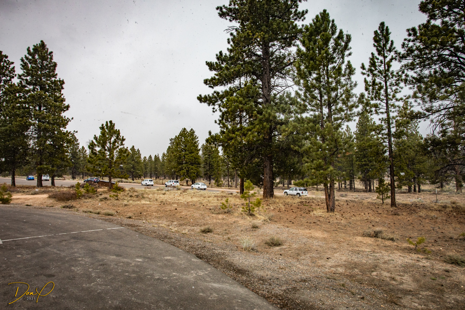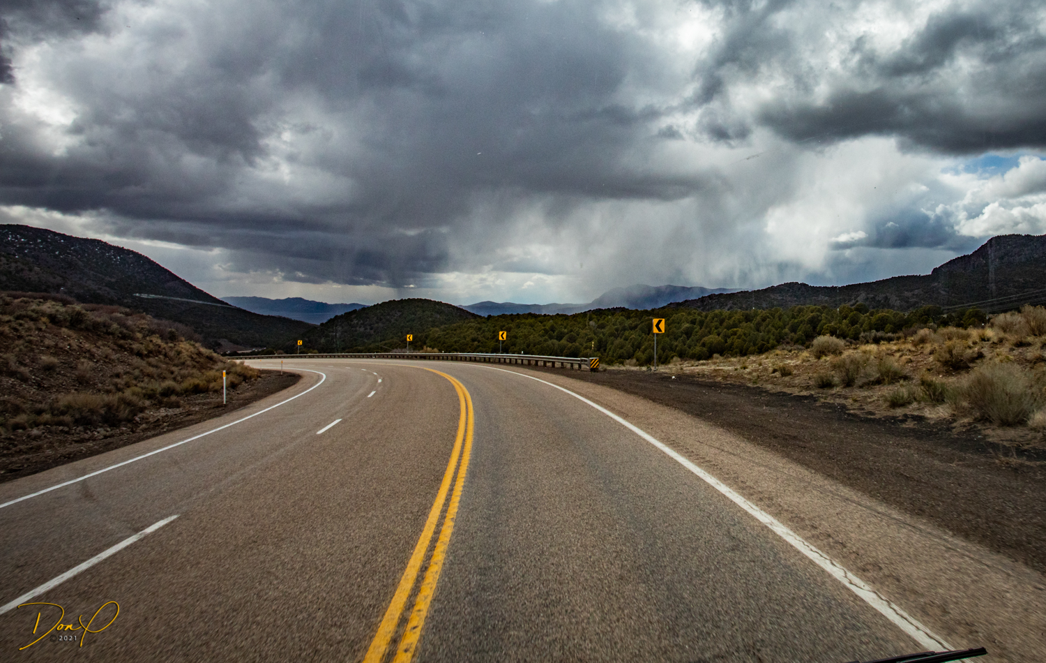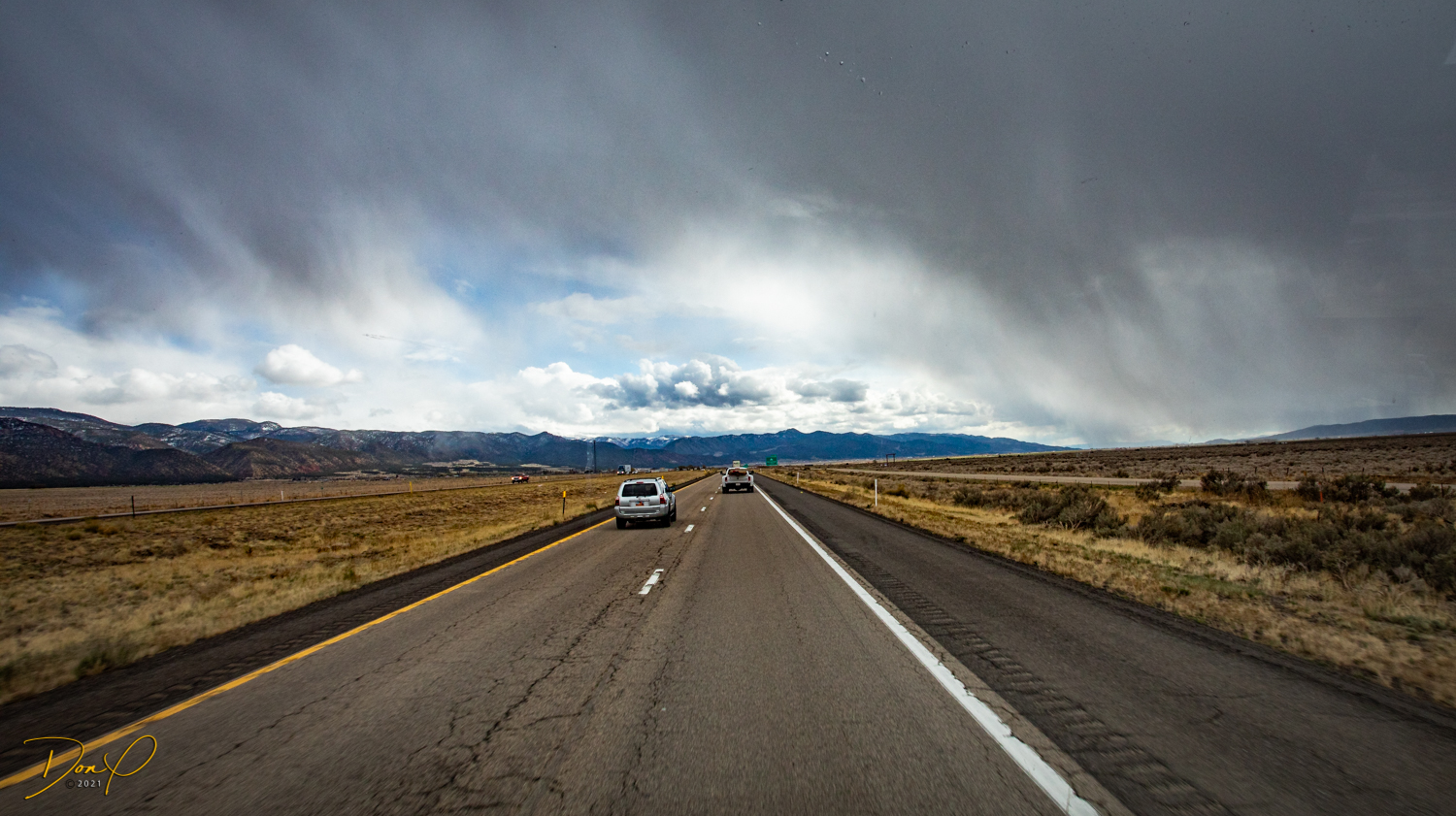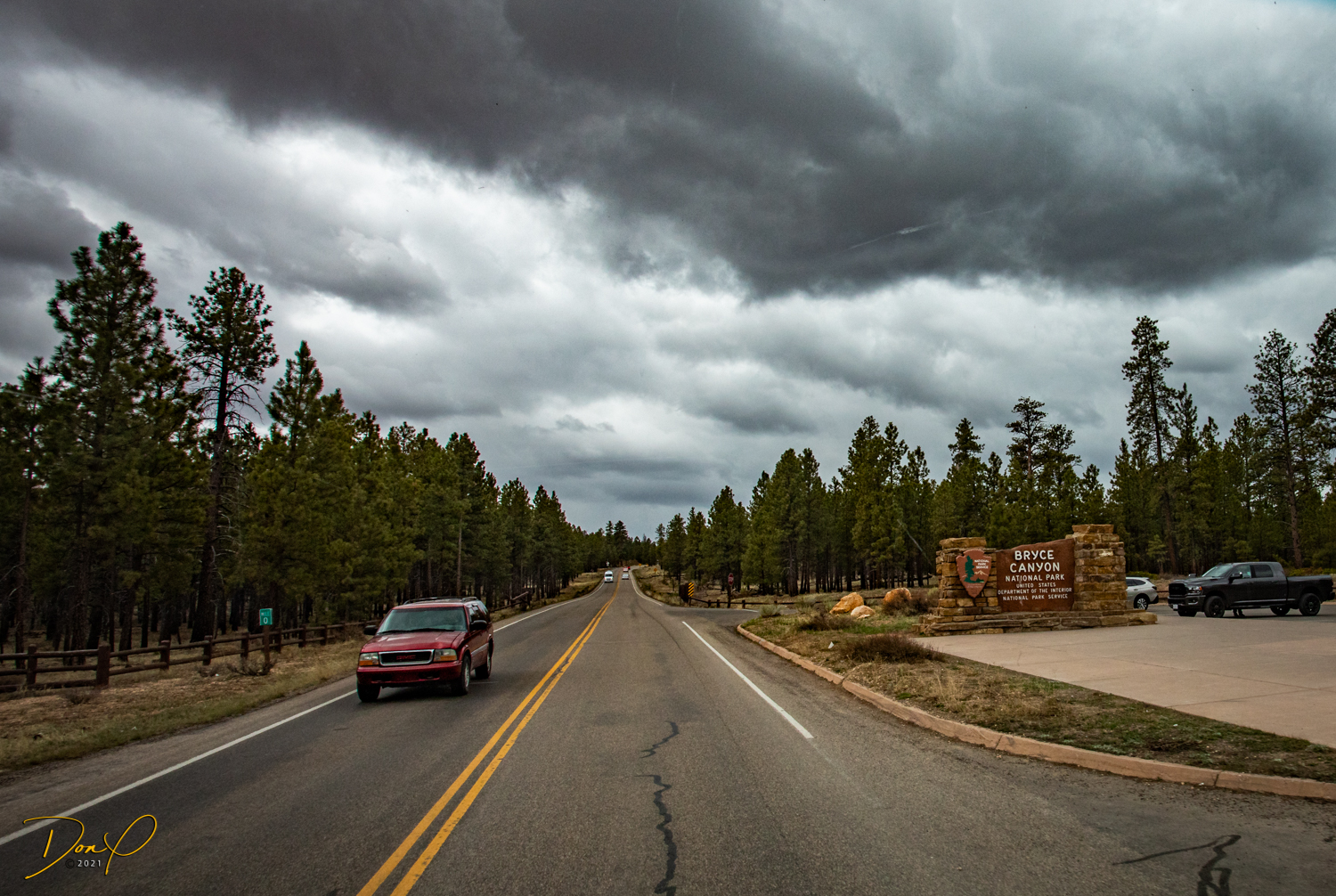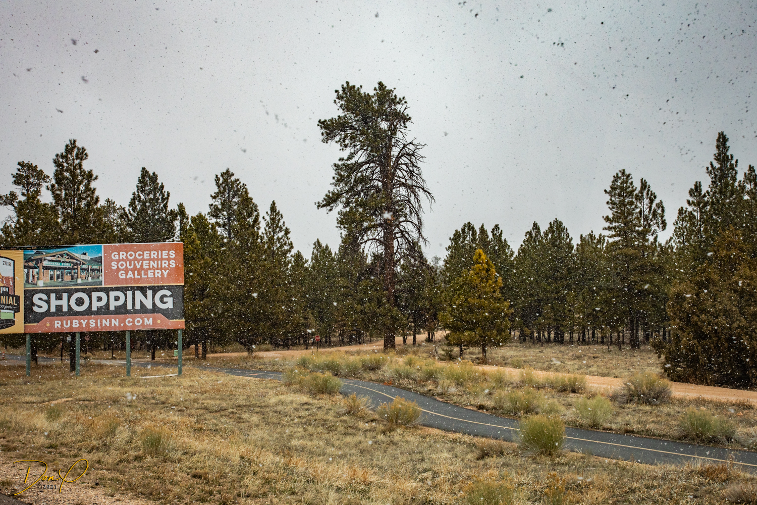 We decide we need to move along, so we get on the next Shuttle and ride it back to the Visitor Center where The Beast is parked. As we prepare to drive out a snowstorm begins and we watch the spectacle as the swirling snowflakes increase in volume. We drive away, windshield wipers pushing the snow aside. As we leave the Park the road goes downhill and the snow stops.
