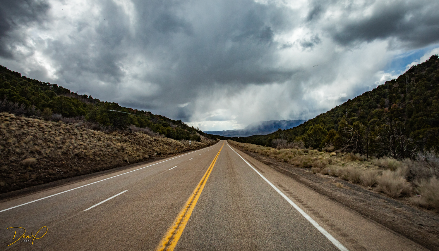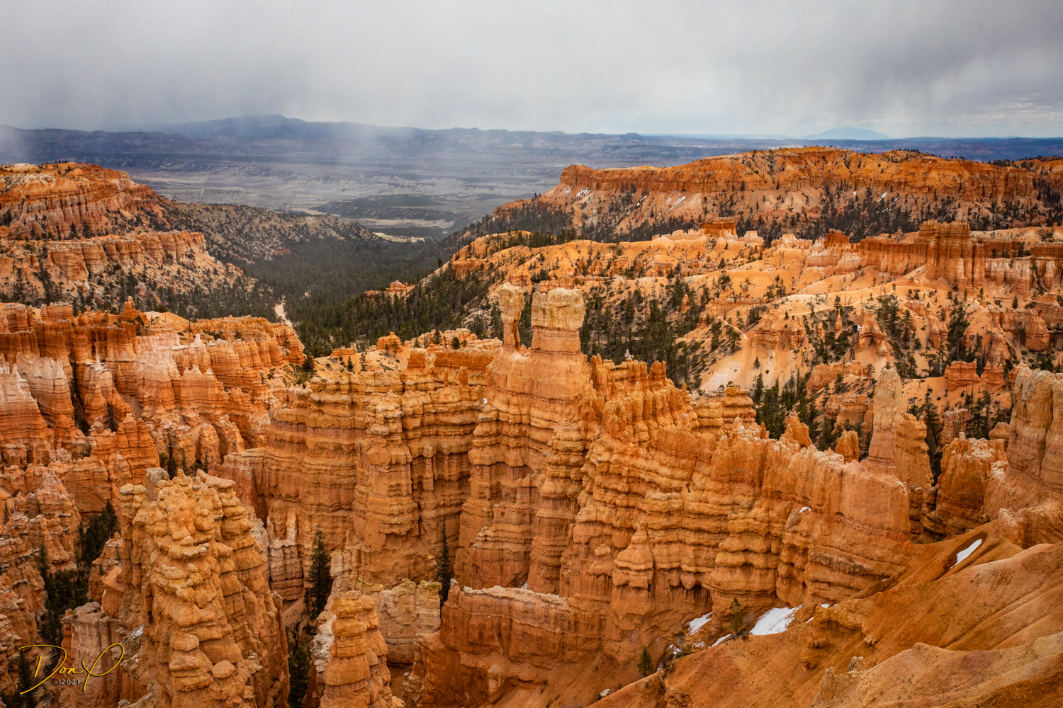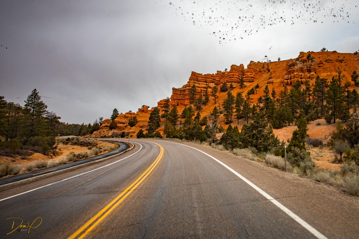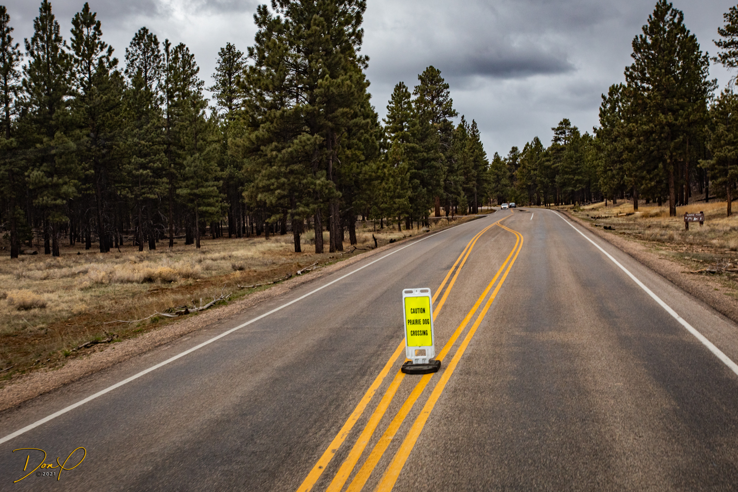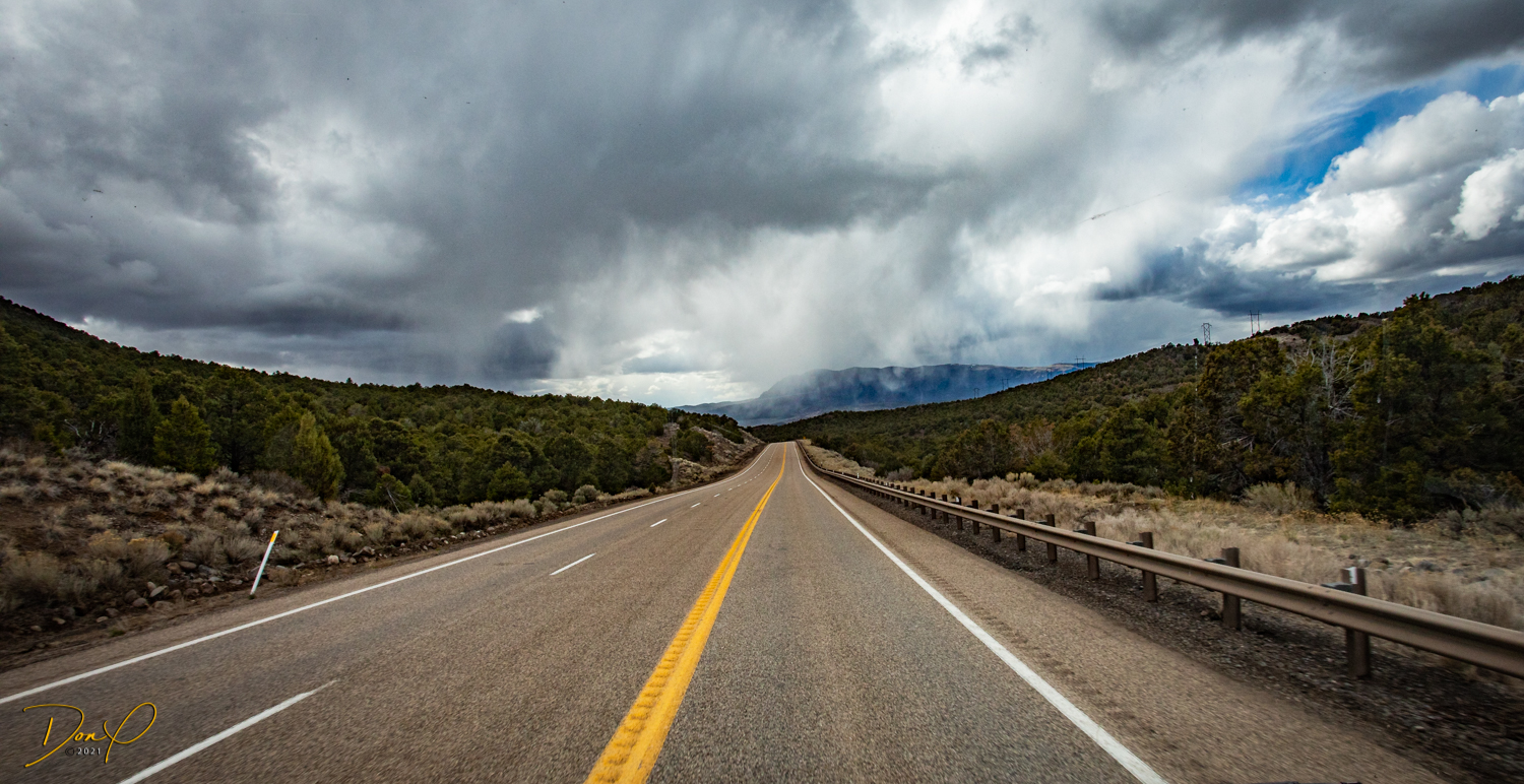 We decide we need to move along, so we get on the next Shuttle and ride it back to the Visitor Center where The Beast is parked. As we prepare to drive out a snowstorm begins and we watch the spectacle as the swirling snowflakes increase in volume. We drive away, windshield wipers pushing the snow aside. As we leave the Park the road goes downhill and the snow stops.
